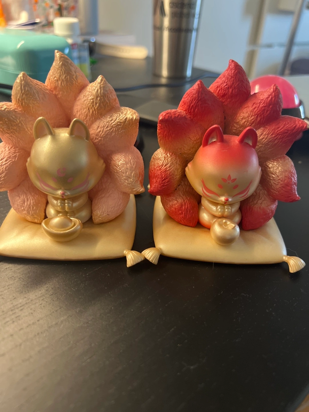 Selling two cute decorative fox figurines. One has a peach/gold tail and the other has a red tail. They're sitting on little gold pillows. Great for adding a touch of whimsy to any space!