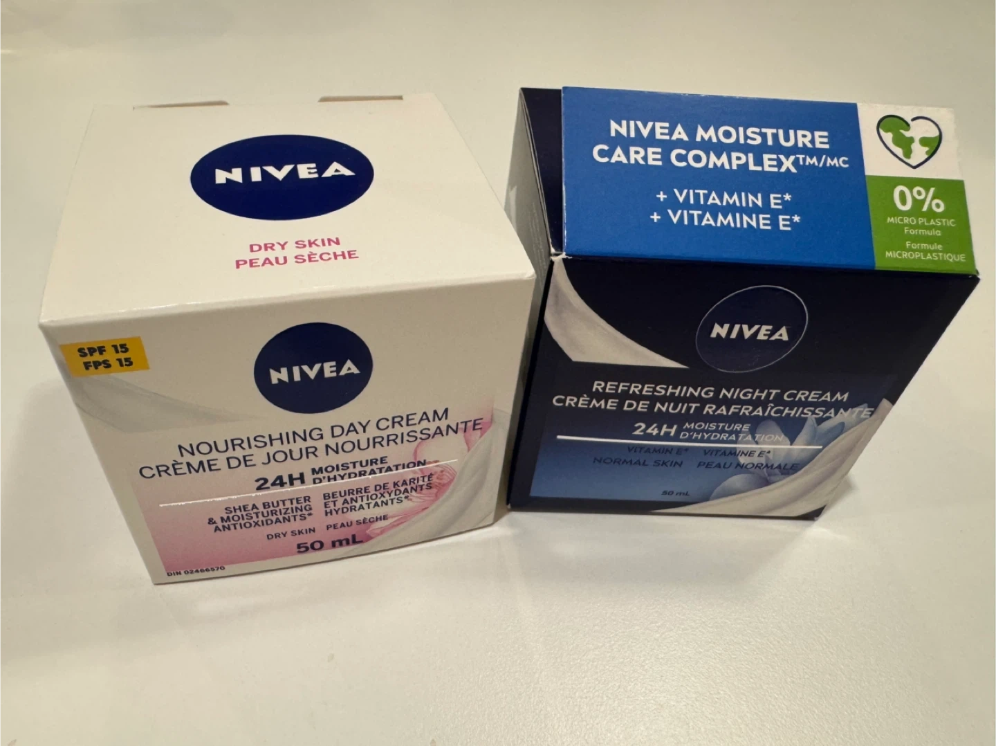 Selling a set of Nivea face creams! This includes a Nourishing Day Cream for dry skin and a Refreshing Night Cream for normal skin. Both are 50 mL and provide 24 hours of moisture