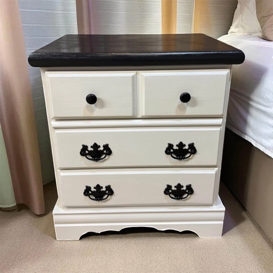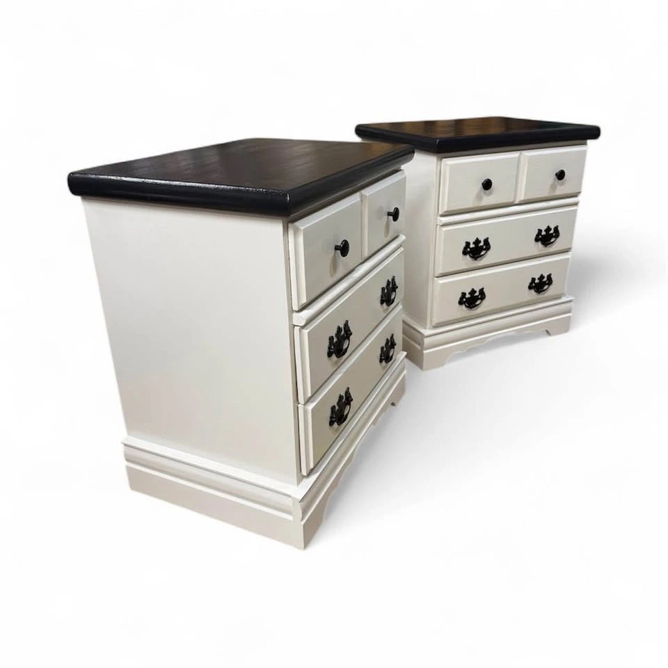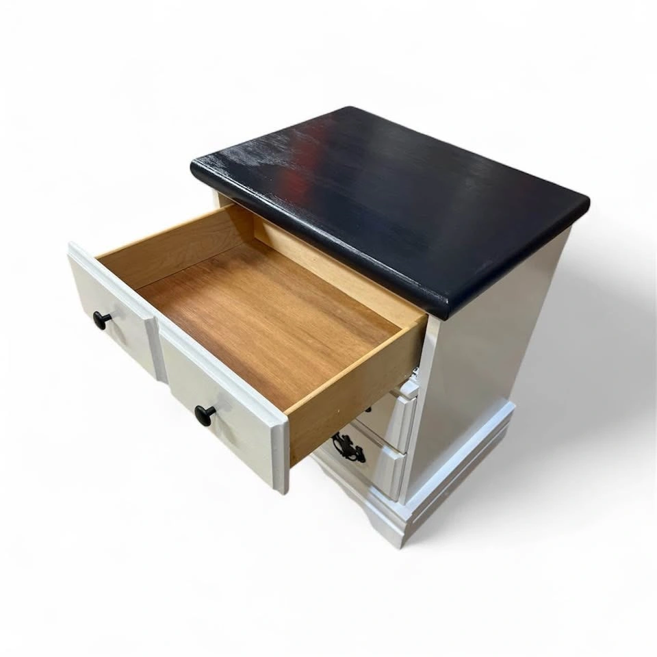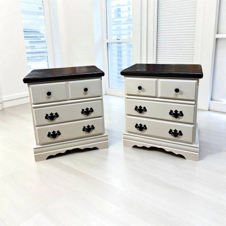 Add a touch of classic charm to your bedroom with this matching pair of refinished nightstands. Each piece features a beautiful two-tone design — rich dark wood tops paired with a crisp, creamy white base and elegant black hardware. ✅ Dimensions: 25” tall x 22” wide x 16” deep ✅ Solid and sturdy construction ✅ Smooth-gliding drawers with vintage-style pulls ✅ Freshly refinished and ready for use Perfect as bedside tables, end tables, or accent pieces in any room.