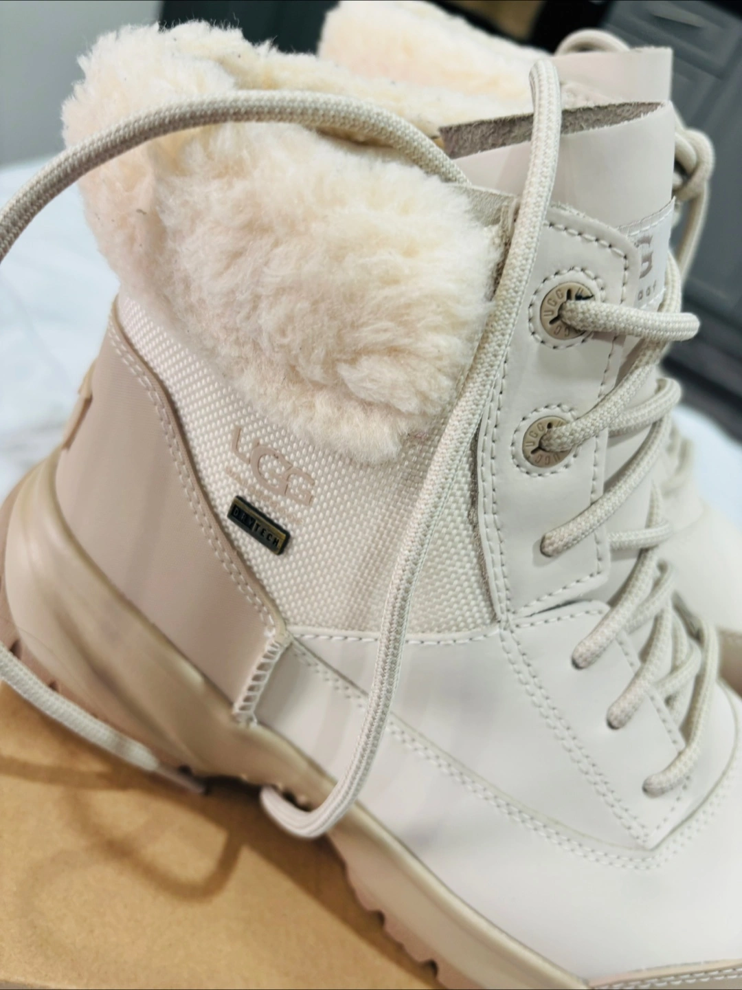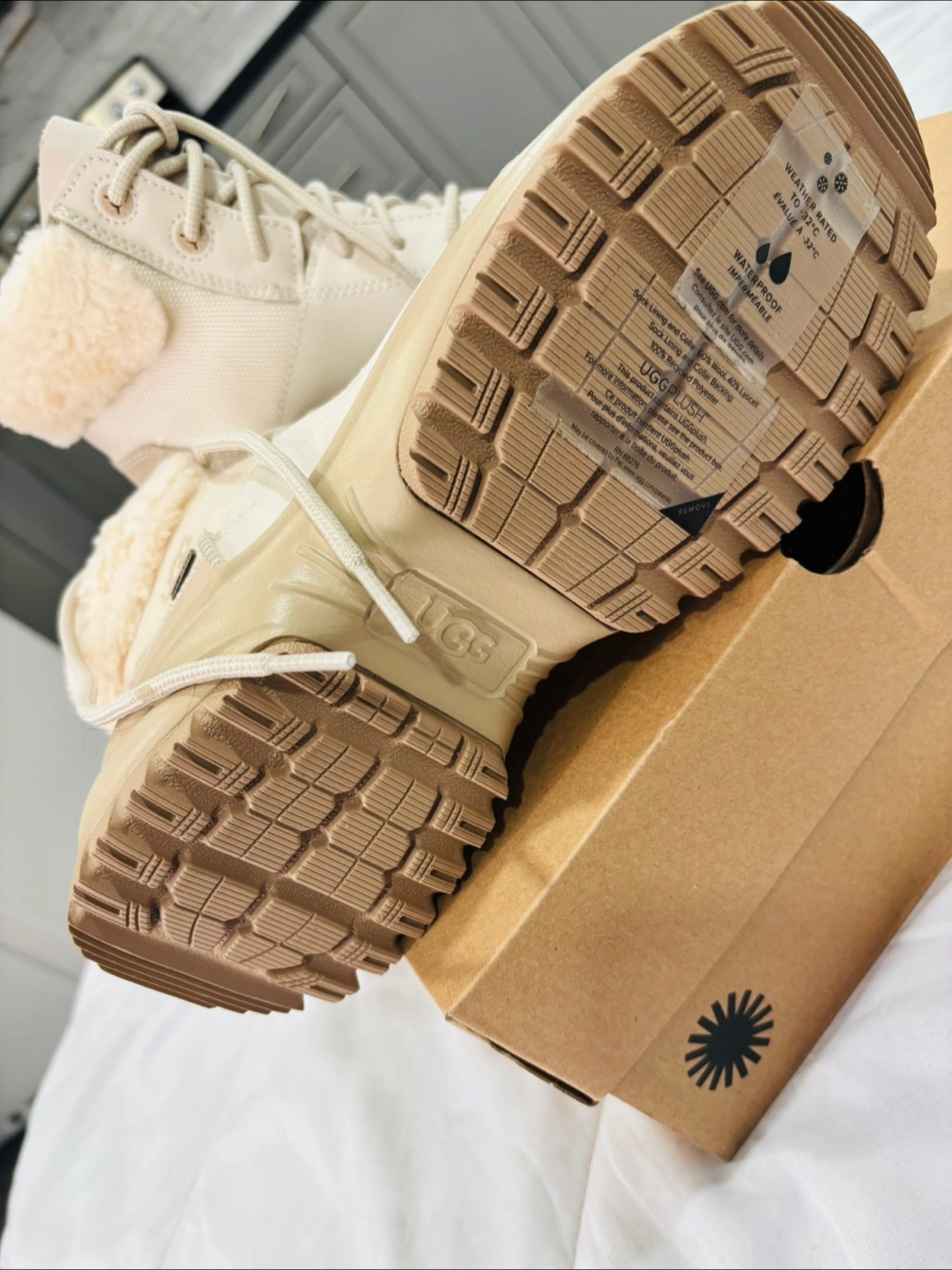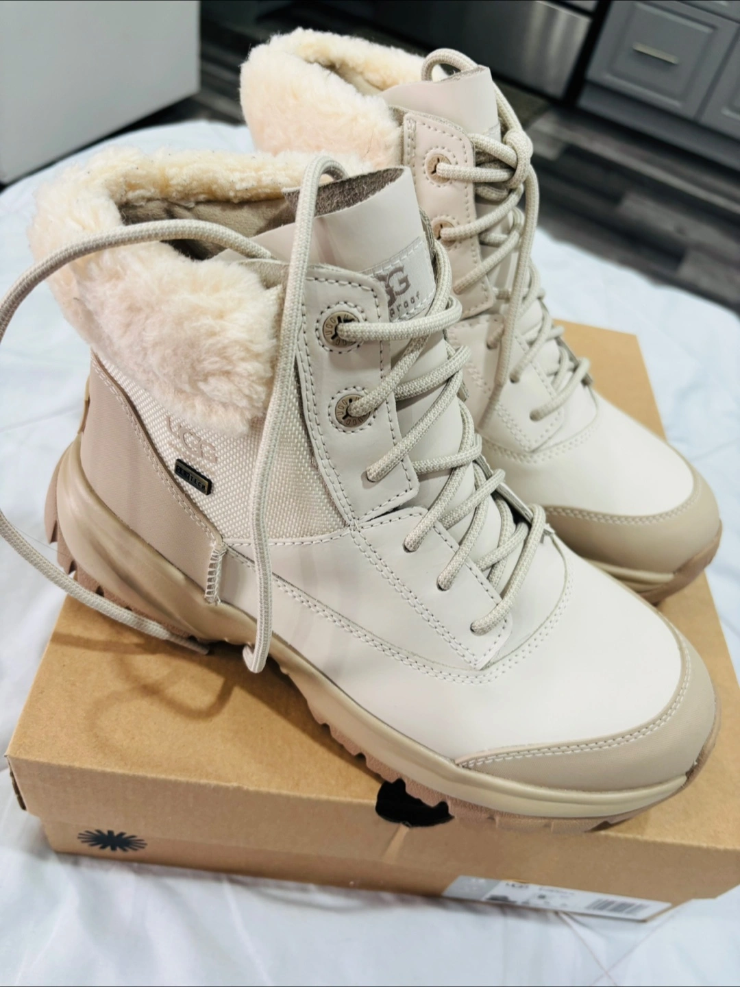 These UGG boots are ready for anything! They're weather-rated to -32°C and waterproof, so your feet will stay warm and dry. They come with the original box. Never worn. They are brand new with box as it is I bought.