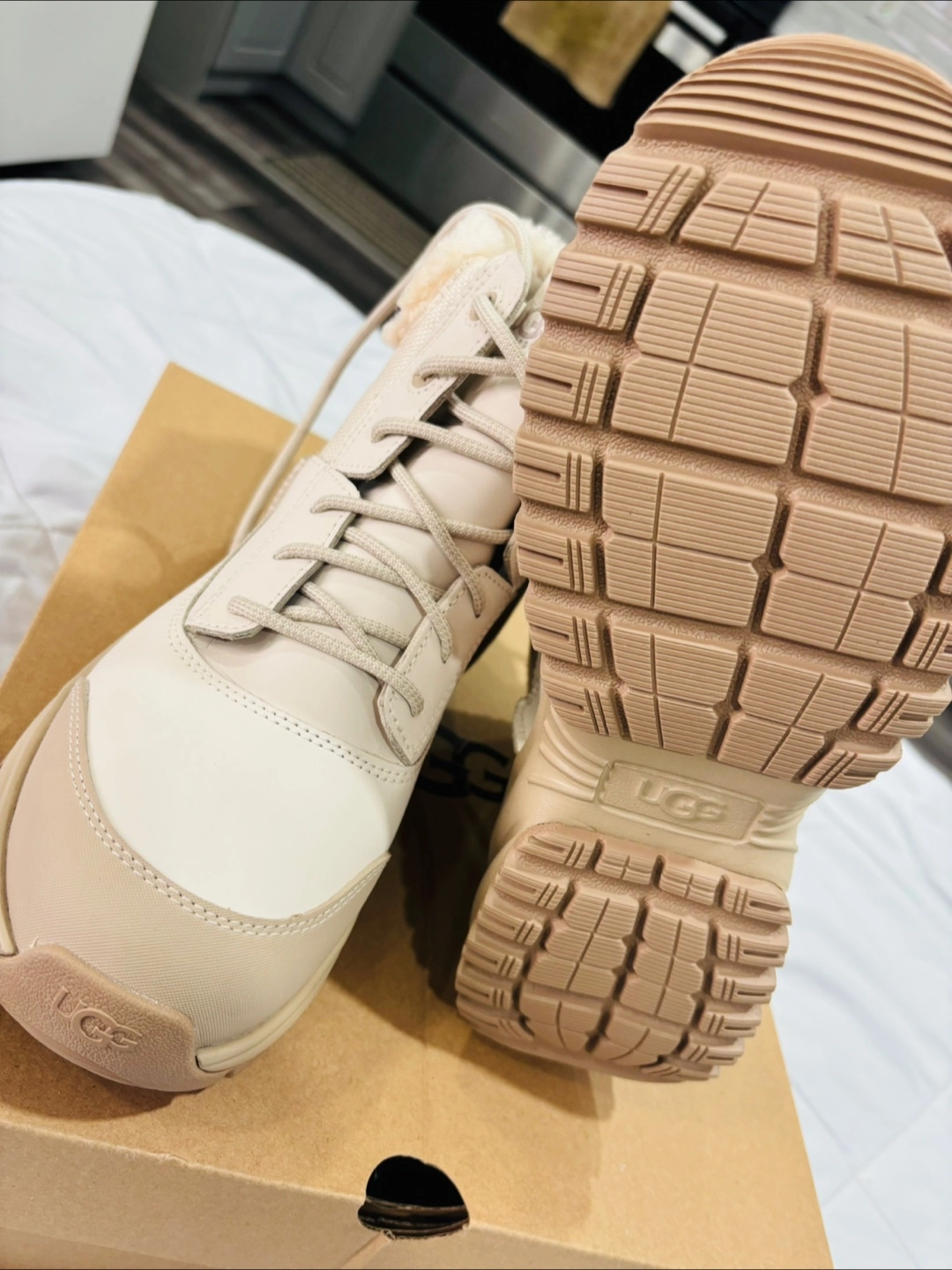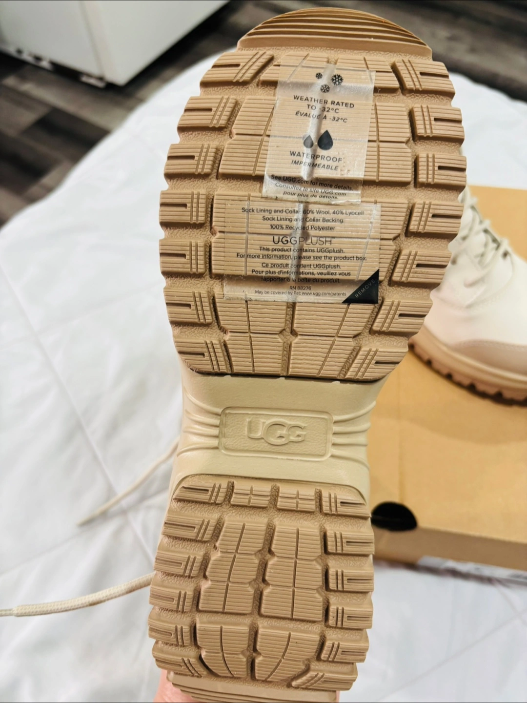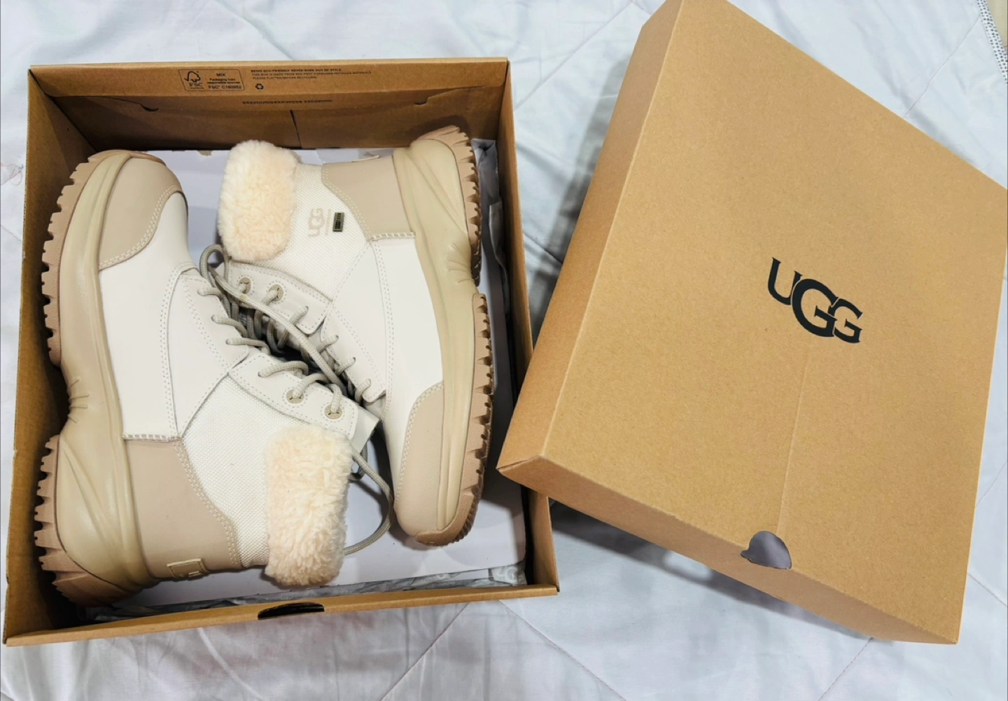 These UGG boots are ready for anything! They're weather-rated to -32°C and waterproof, so your feet will stay warm and dry. They come with the original box. Never worn. They are brand new with box as it is I bought.