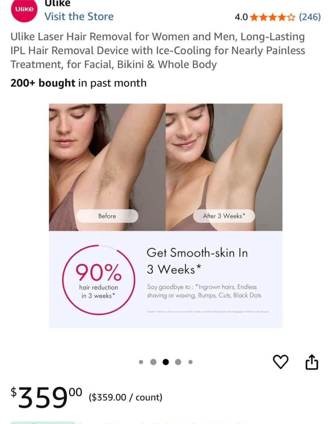 Get ready for painless hair removal with the Ulike Laser Hair Removal Device! It uses ice-cooling technology for a comfortable experience on your face, bikini area, and whole body. Originally bought for $359, this device can give you smooth skin in just 3 weeks. Comes with the box and all original accessories!