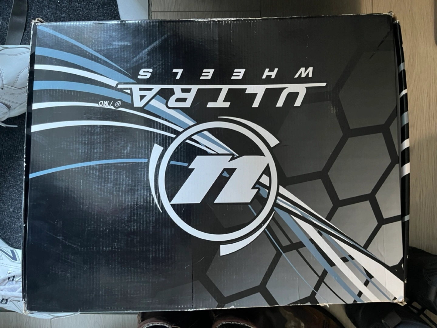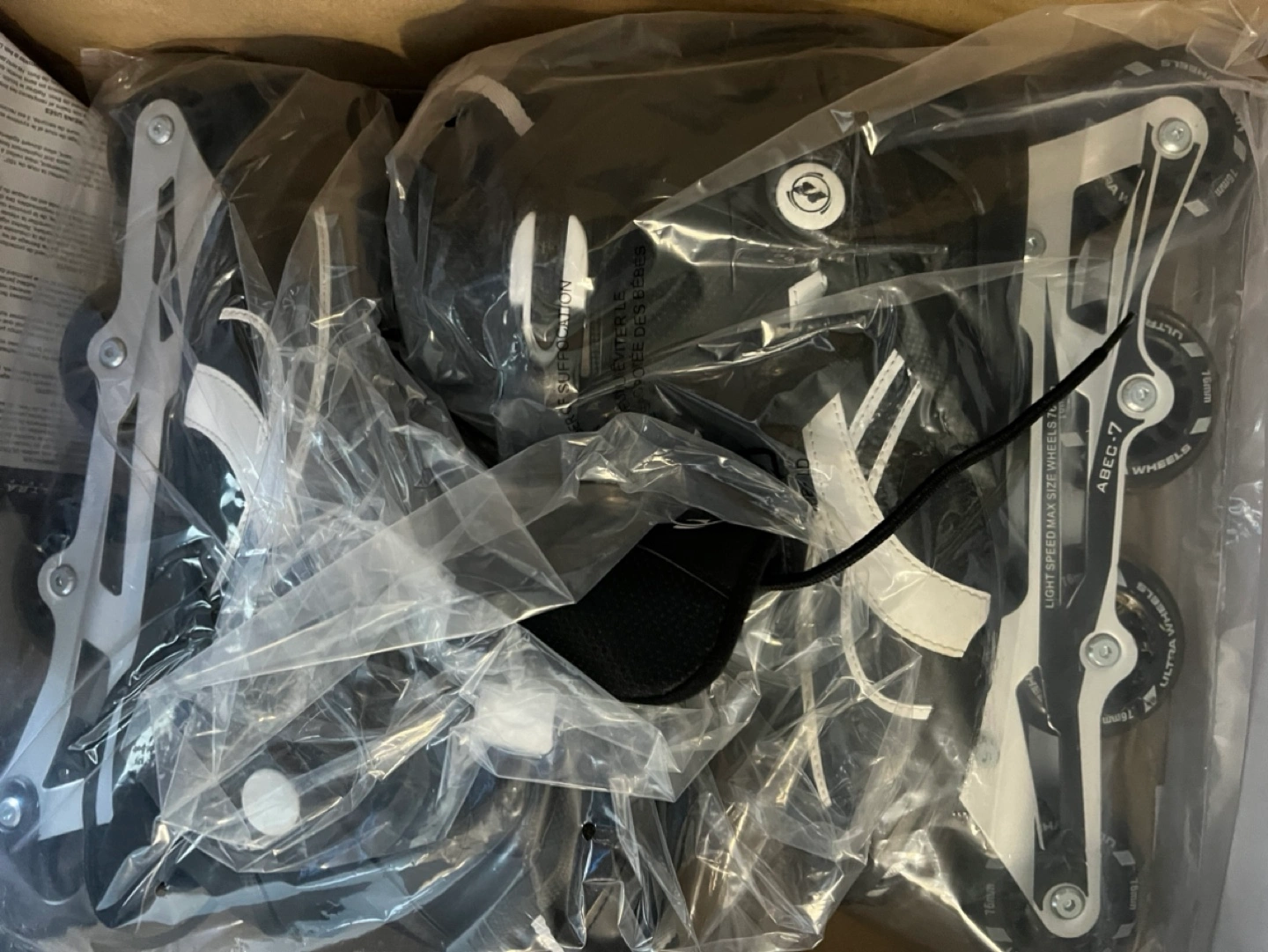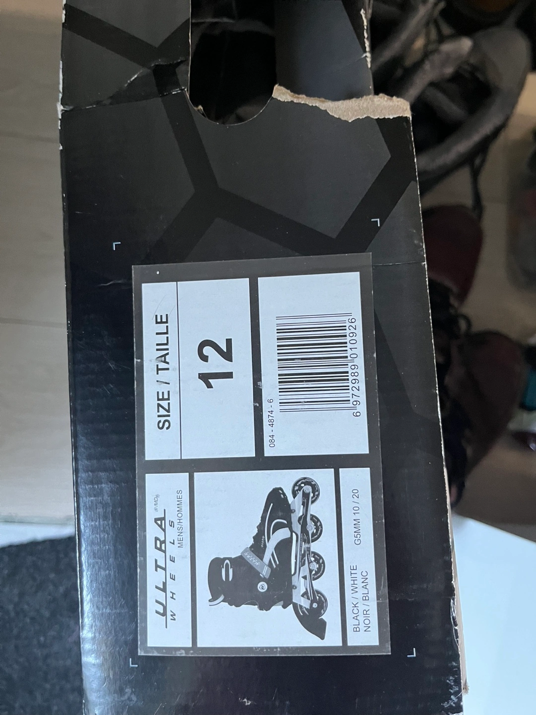 New in box, size 12 inline skates. Black and white colour scheme. Will through in some knee and elbow guards.