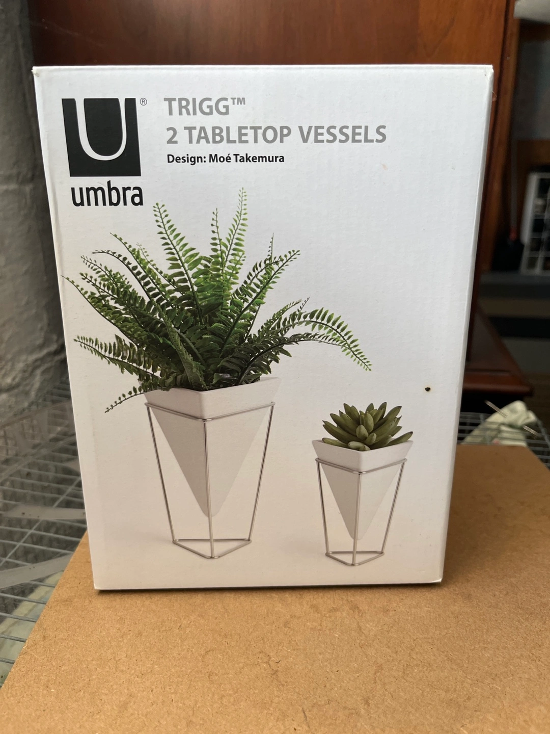 Selling a set of Umbra Trigg tabletop vessels. These stylish vessels are perfect for adding a modern touch to your home decor. The set includes two vessels designed by Moe Takemura. They come in the original box!