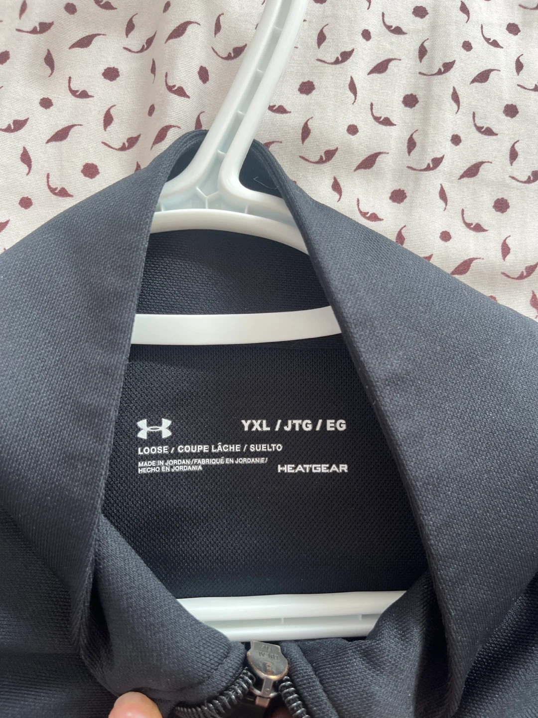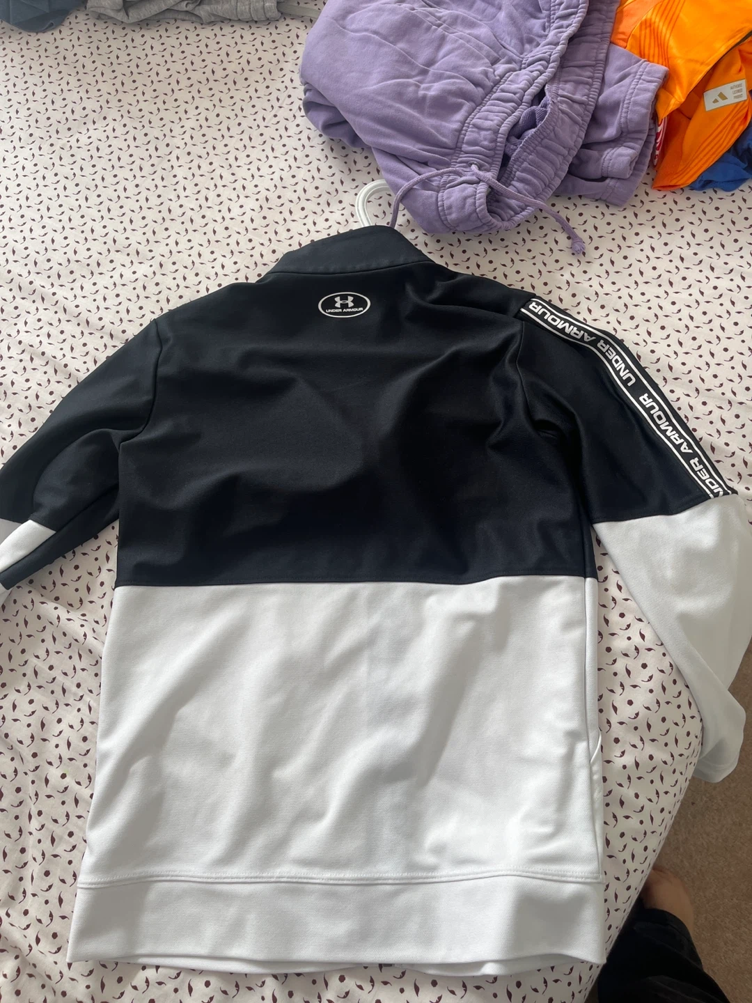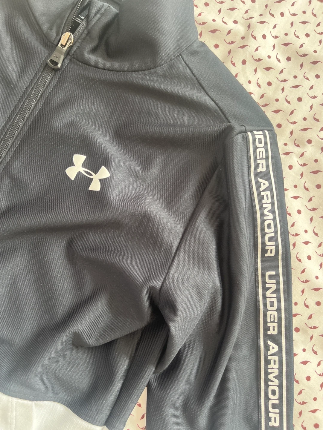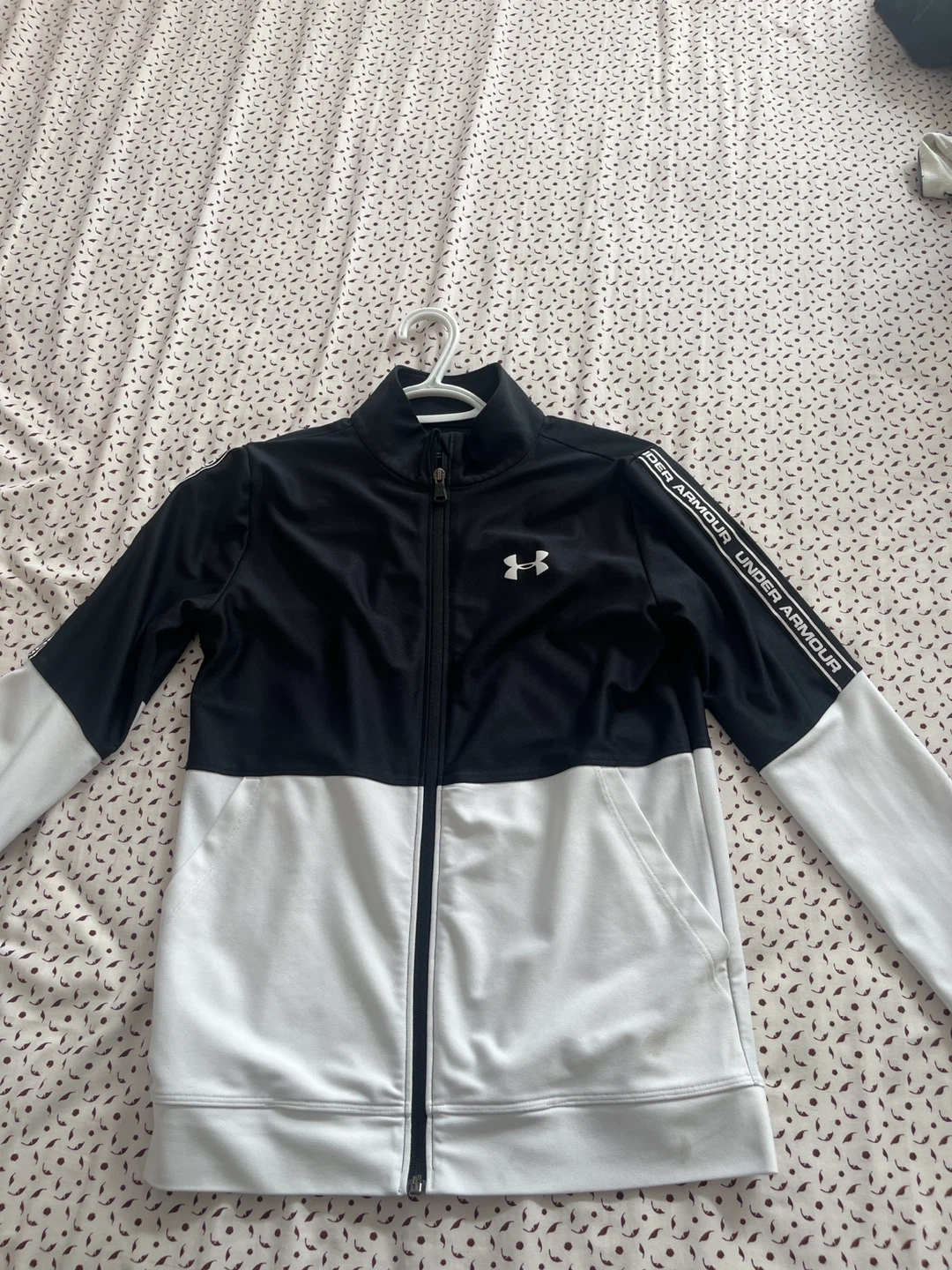 Selling an Under Armour track jacket in YXL (Youth Extra Large). It's black and white with the Under Armour logo on the chest and down the sleeves. It's in great condition!