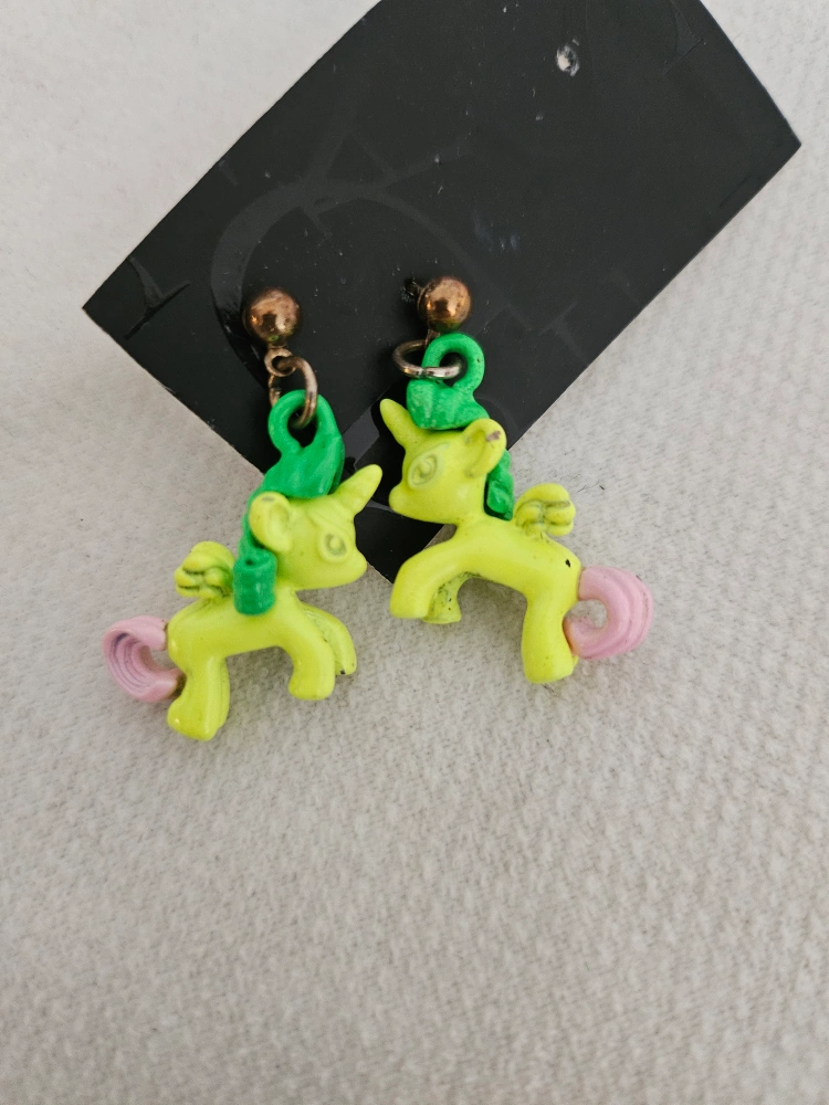 Cute unicorn earrings! These are dangle style with a yellow body, green mane, and pink tail. They're perfect for adding a bit of fun to any outfit