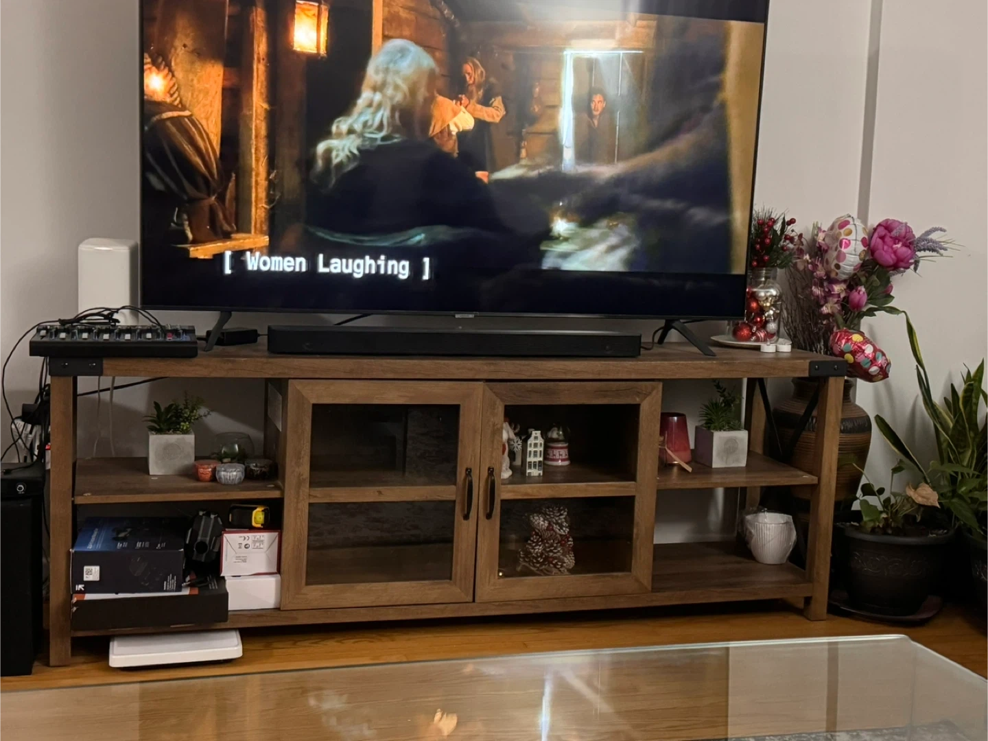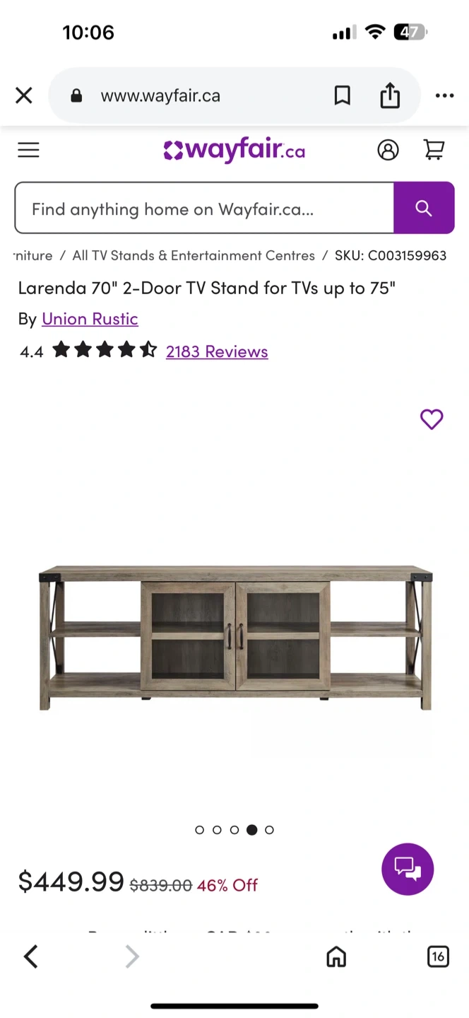 Selling a Union Rustic Larenda 70" 2-Door TV Stand for TVs up to 75". This TV stand is in great condition and adds a rustic touch to any living room. It features two doors and open shelving for ample storage. Originally bought for $449.99.