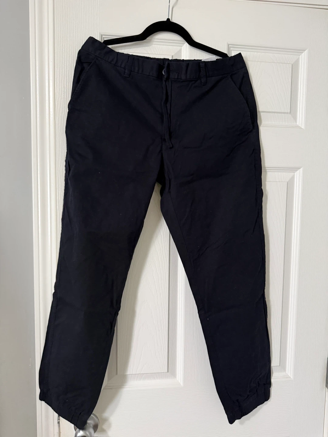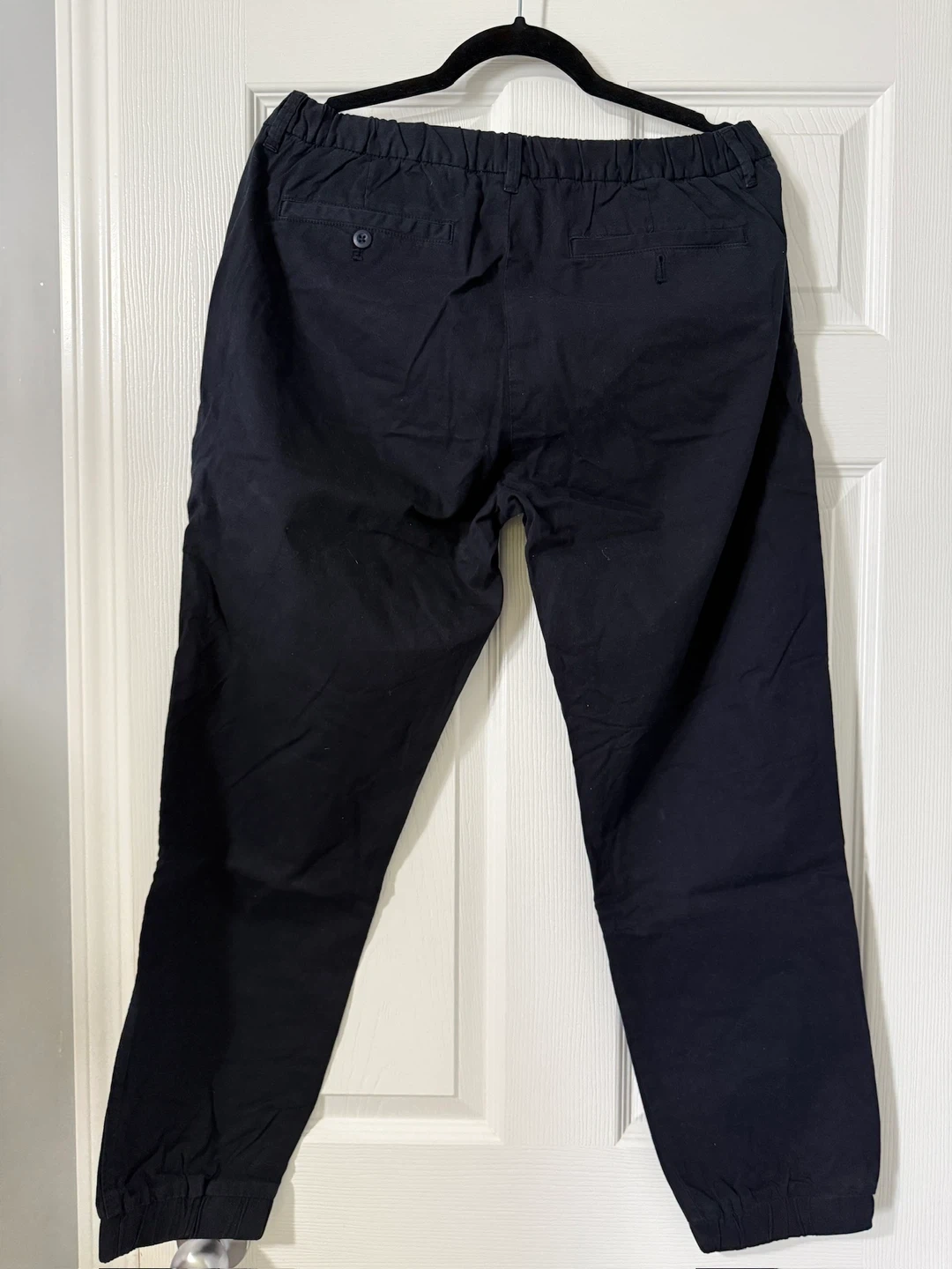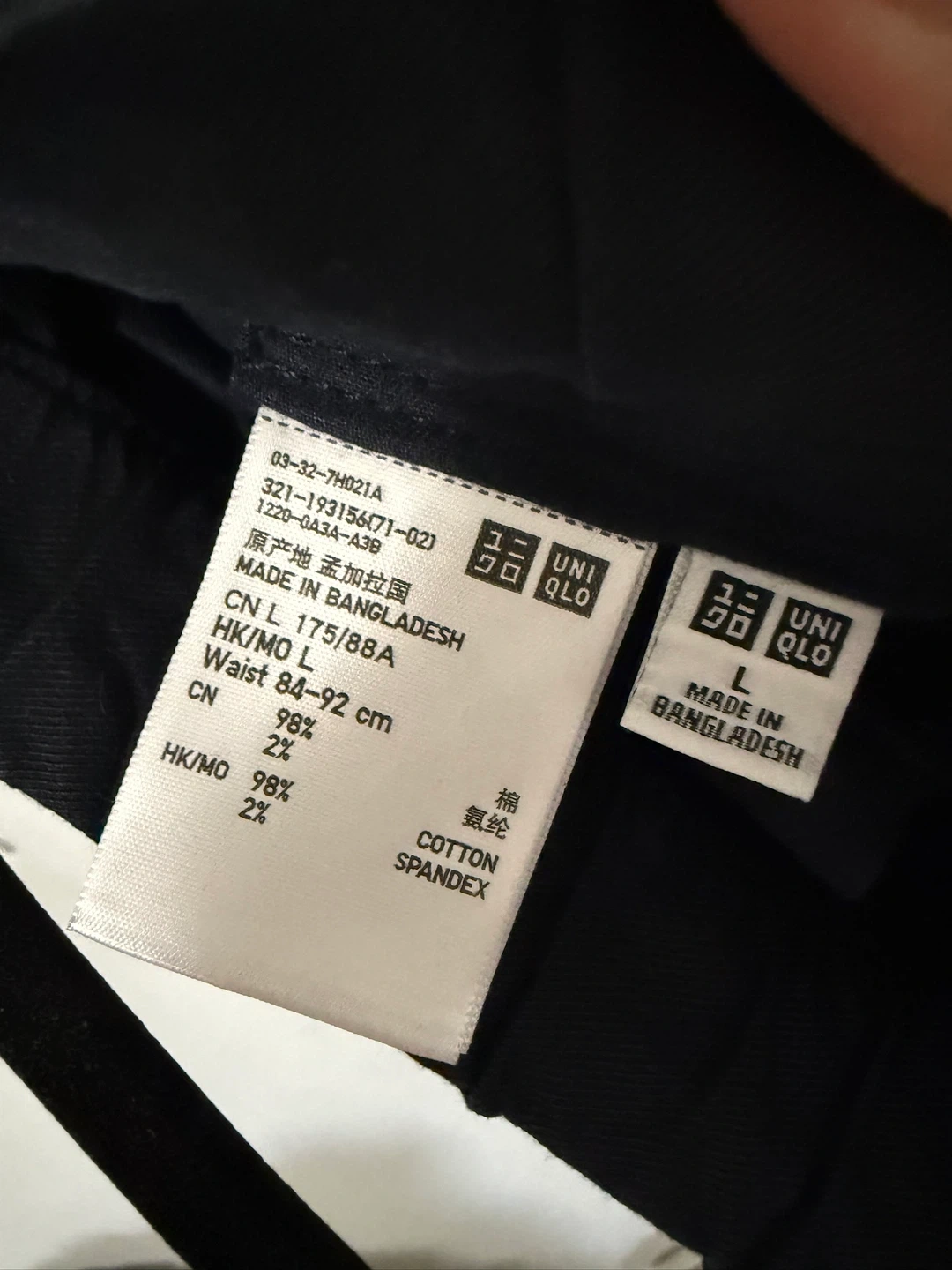 Selling a pair of black Uniqlo jogger pants in size L. They are made of 98% cotton and 2% spandex. Waist size is 84-92 cm. Made in Bangladesh.