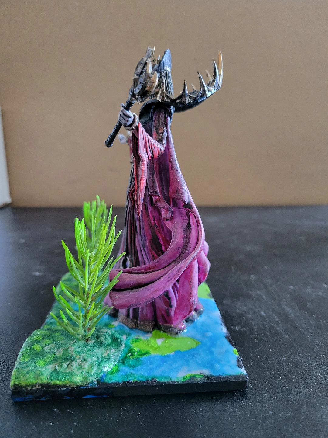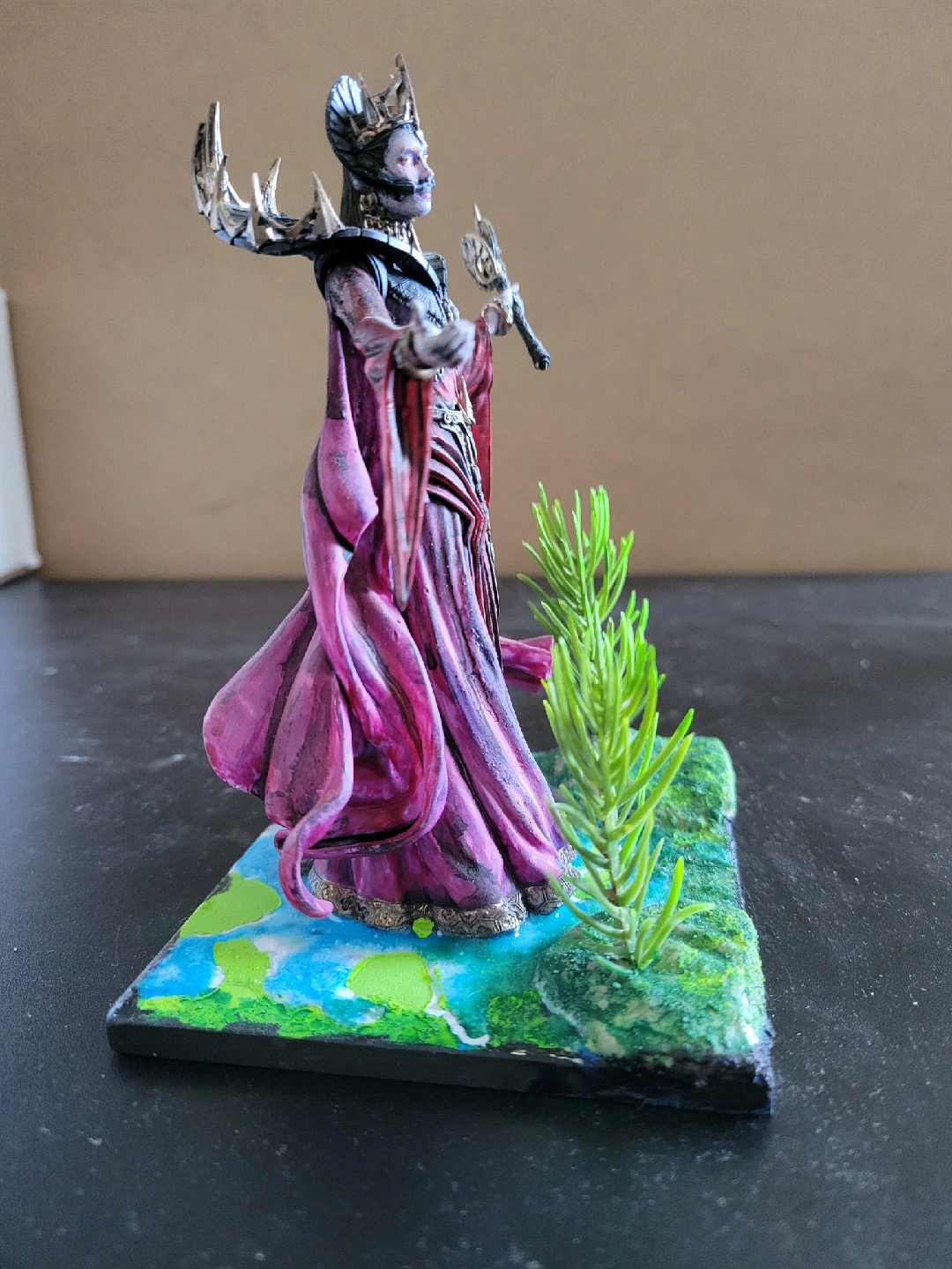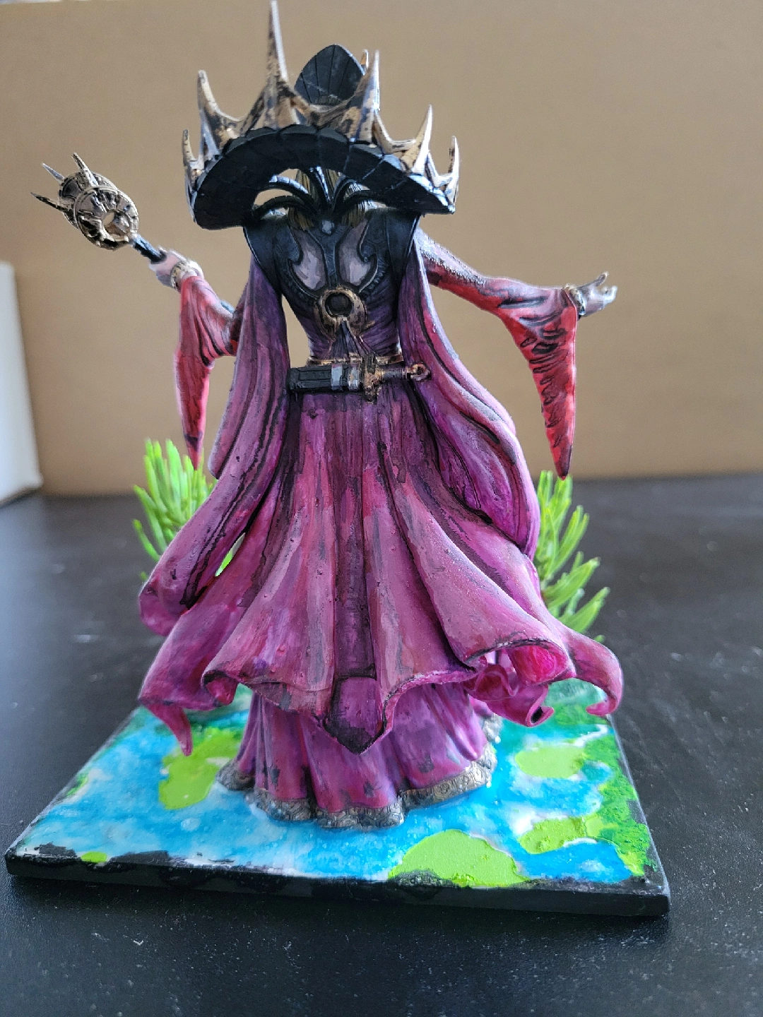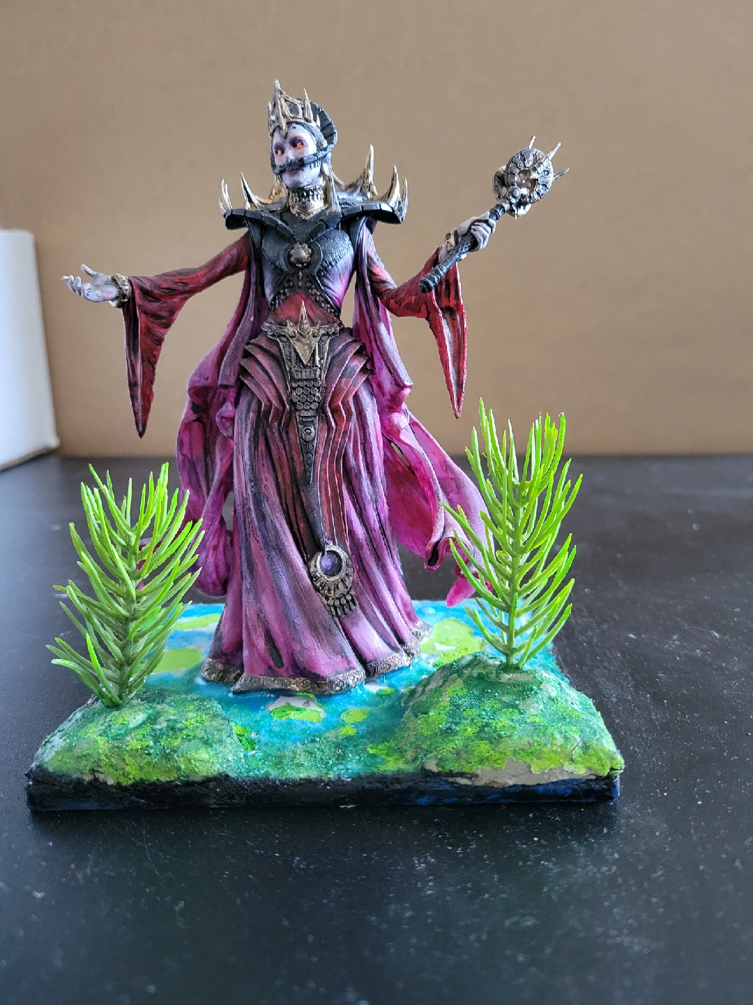 It features a demonic sorceress in a flowing purple and black gown, with intricate details on the crown and staff. The base is painted to resemble a landscape with water and greenery. A unique piece for collectors or tabletop gaming enthusiasts. Non-smoking household. No drop-offs.