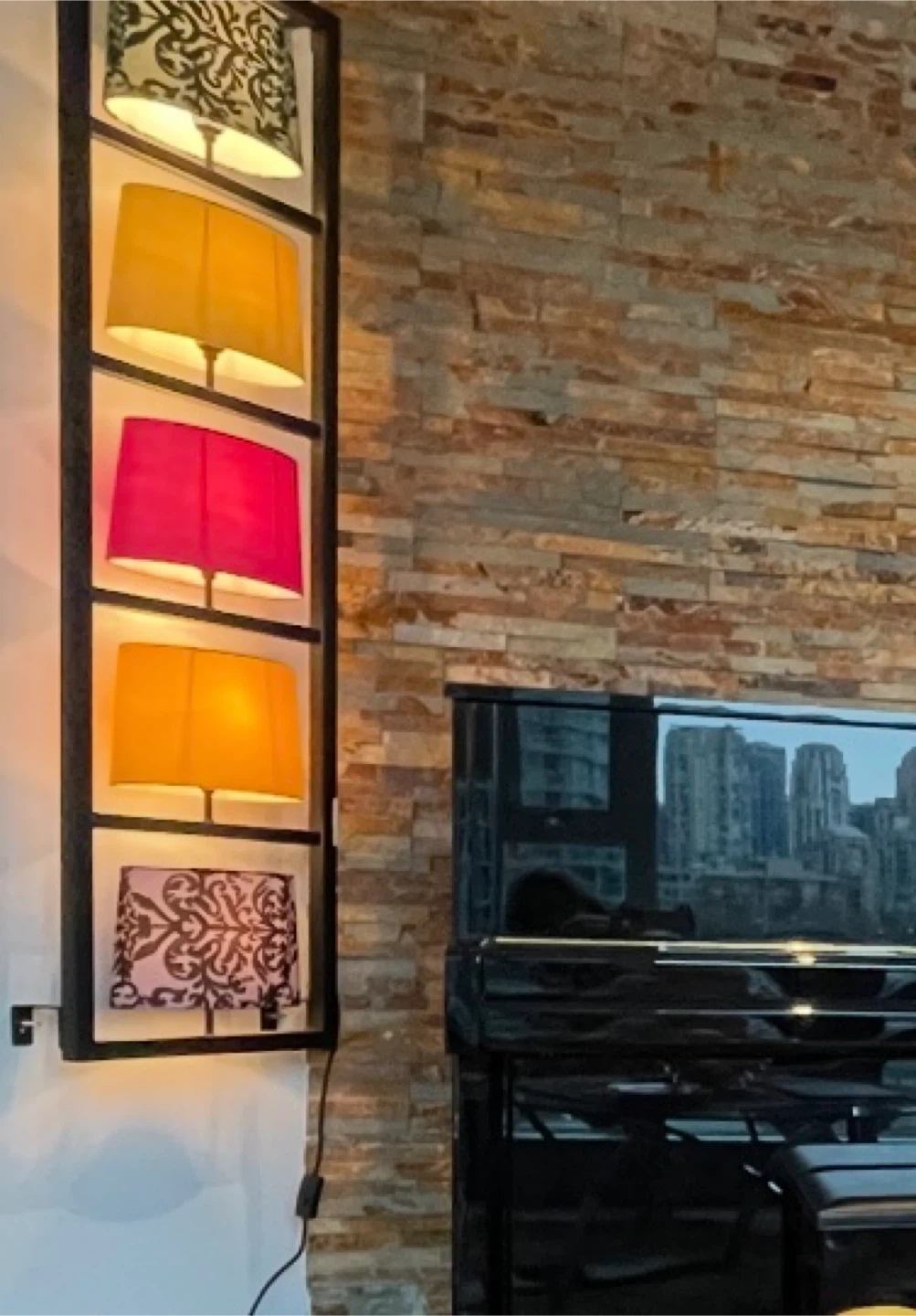 This is a unique wall lamp with multiple shades in different colours and patterns! It adds a fun, modern touch to any room. The lamp is in great condition and ready to brighten up your space