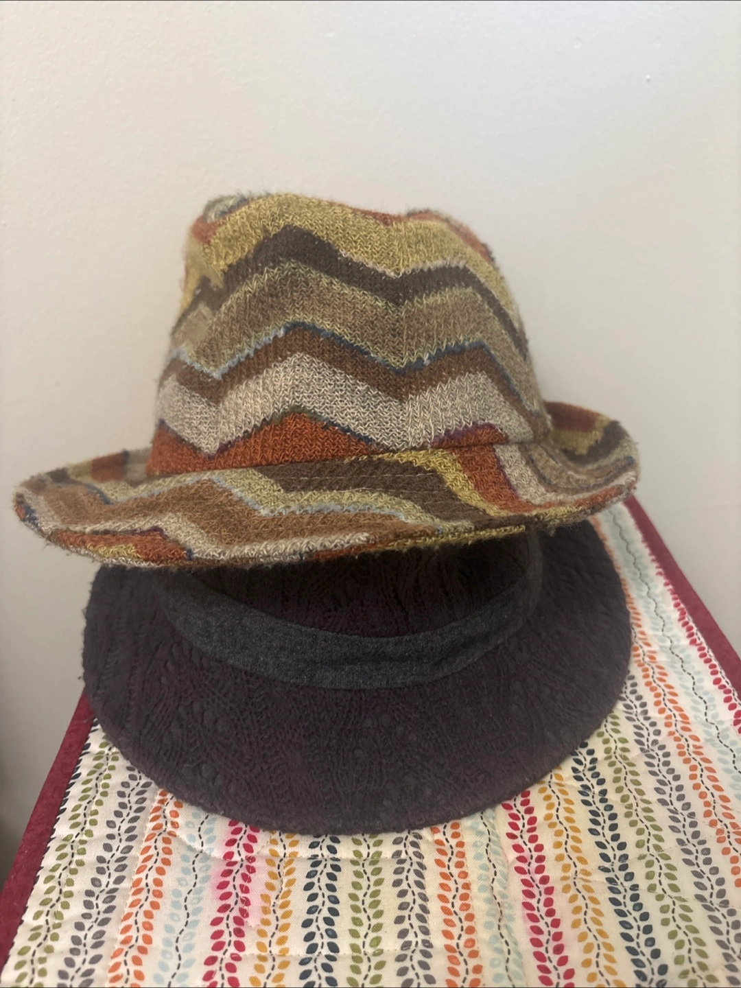 Selling my favorite two hats, one is a dark grey knit hat with a grey band, and the other is a colourful patterned knit hat! They're both in good condition and ready for a new home