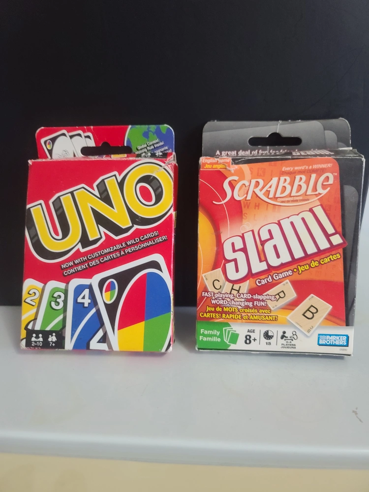 Selling a couple of fun card games! There's a deck of UNO cards and a Scrabble Slam! card game. Both are great for family game nights and are suitable for ages 7 and up for UNO, and 8 and up for Scrabble Slam!