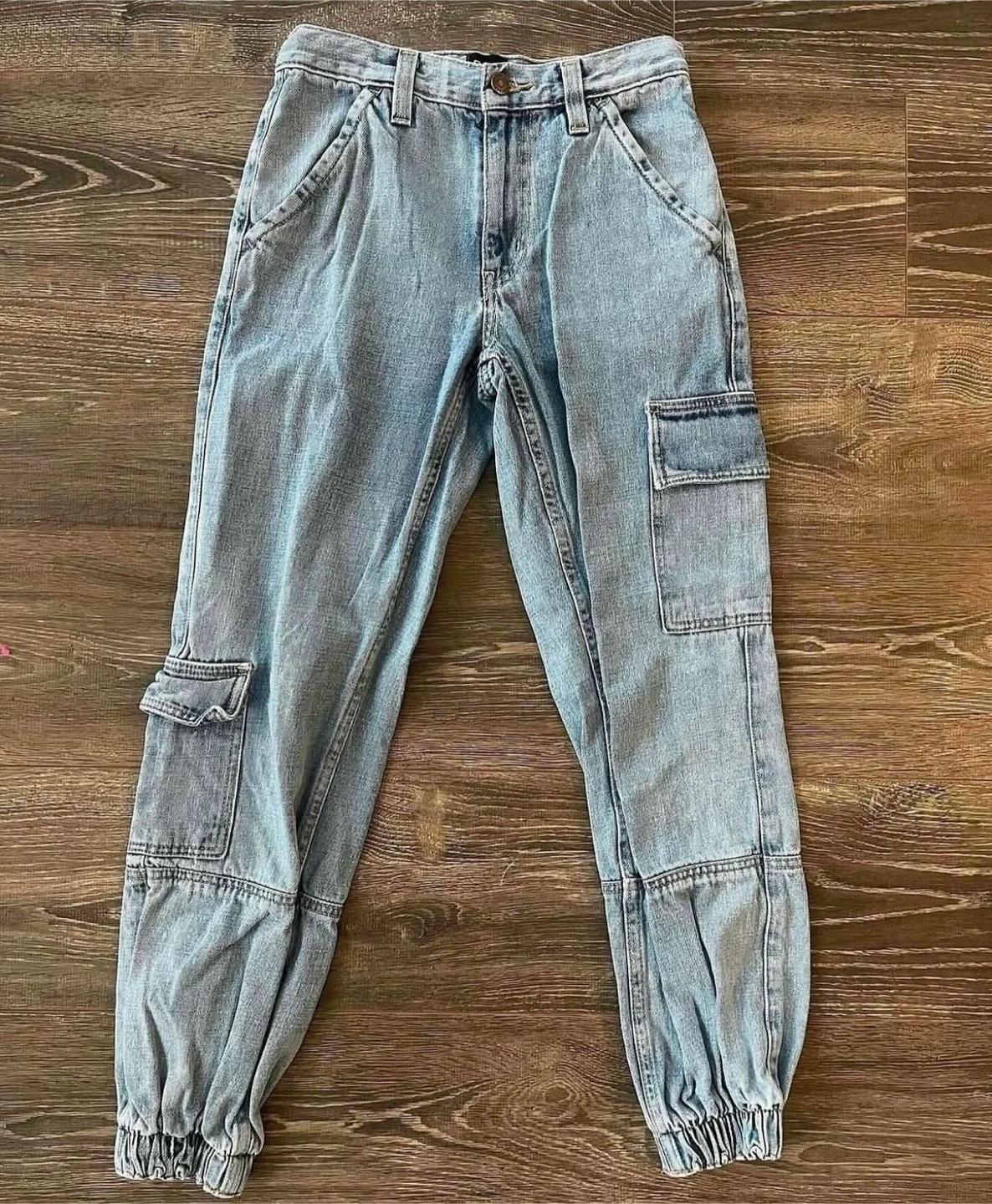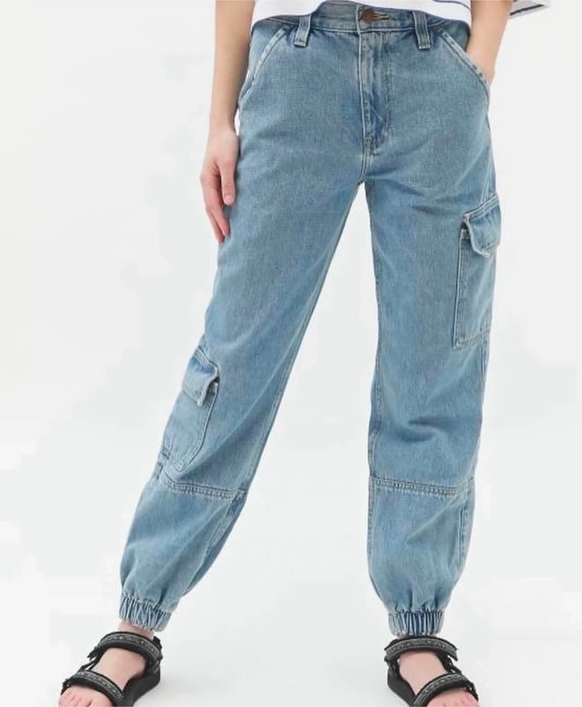 Selling a pair of BDG Urban Outfitters cargo jogger pants. They feature a light wash denim and jogger style cuffs. Perfect for a casual look!