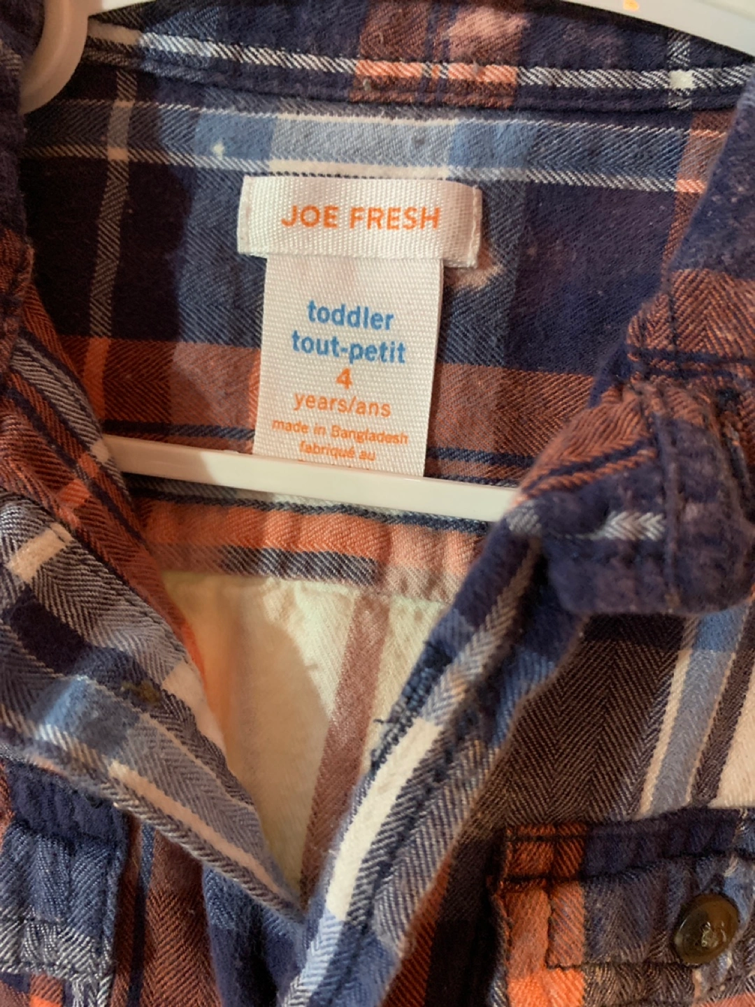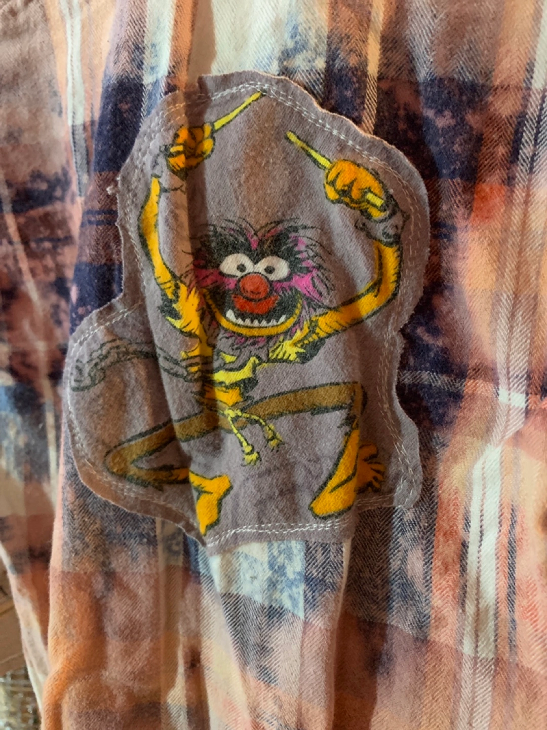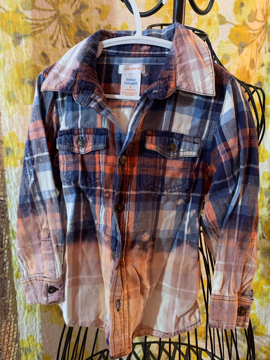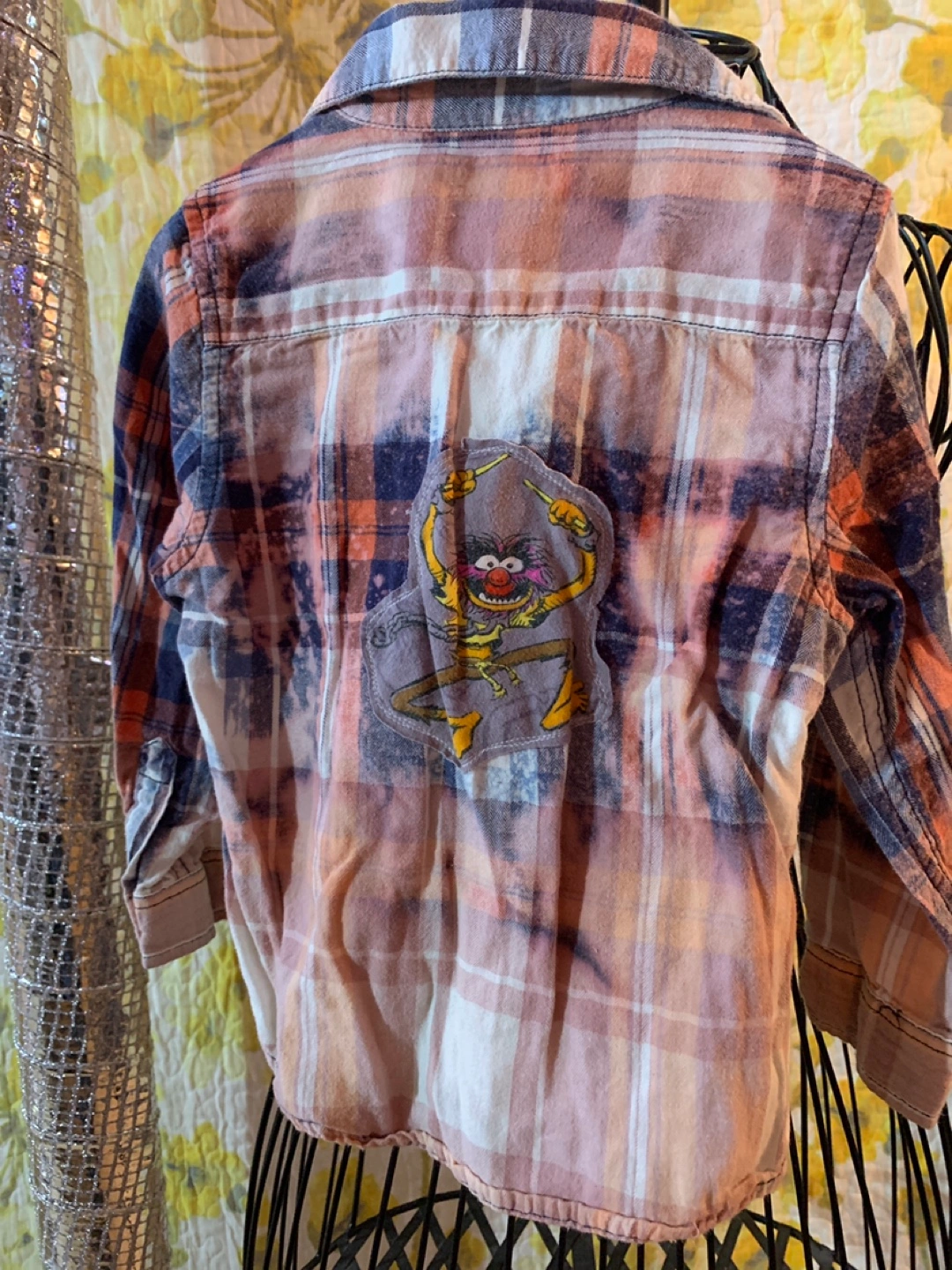 Adorable toddler-sized flannel shirt. Features a unique bleach-dye effect and a fun appliqué. Size 4. Long sleeves, button closure. OOAK-Maun by Gerri