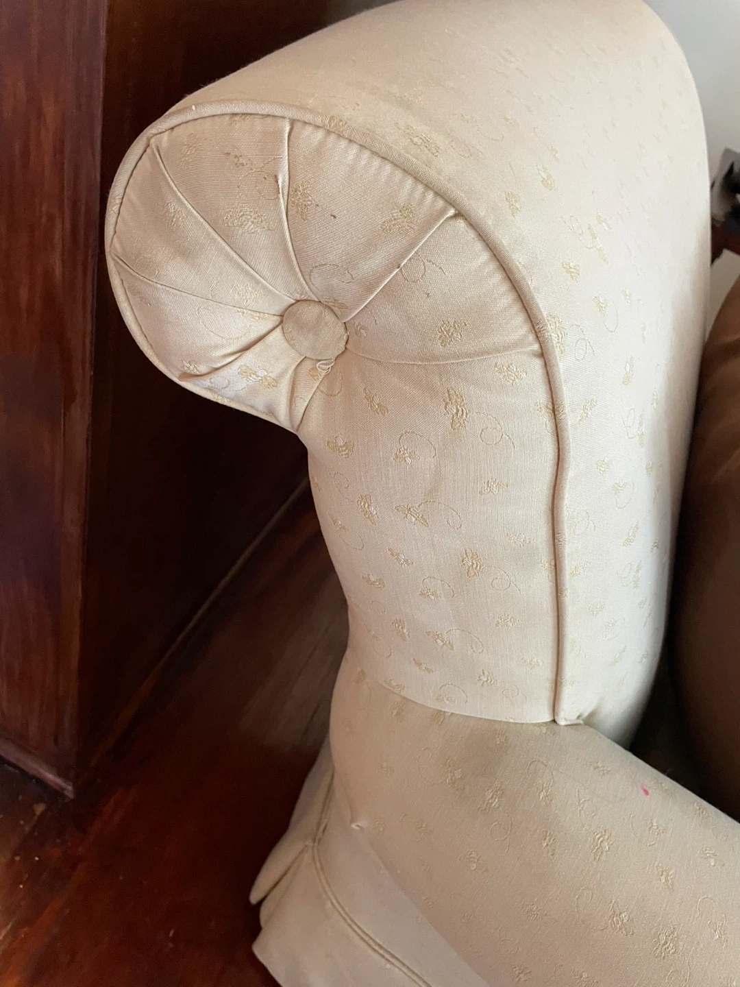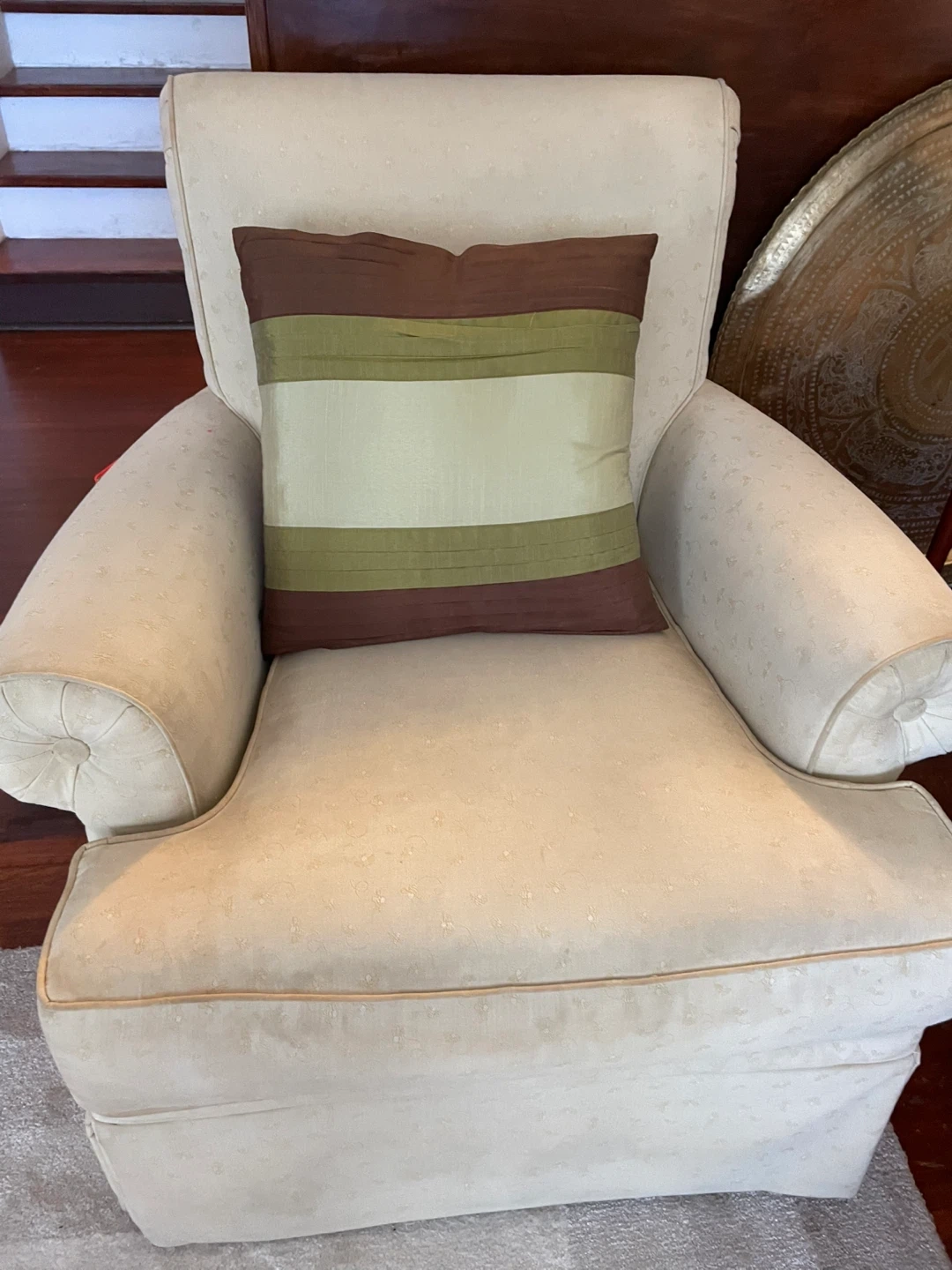 CHAIR. Upholstered EASY CHAIR. LIGHT BEIGE COLOR. ROLLED ARMS. VERY COMFORTABLE. PERFECT FOR RELAXING. 33” W 36” deep Non smoking , no pet home. Pick up in Scarborough midland and Eglinton