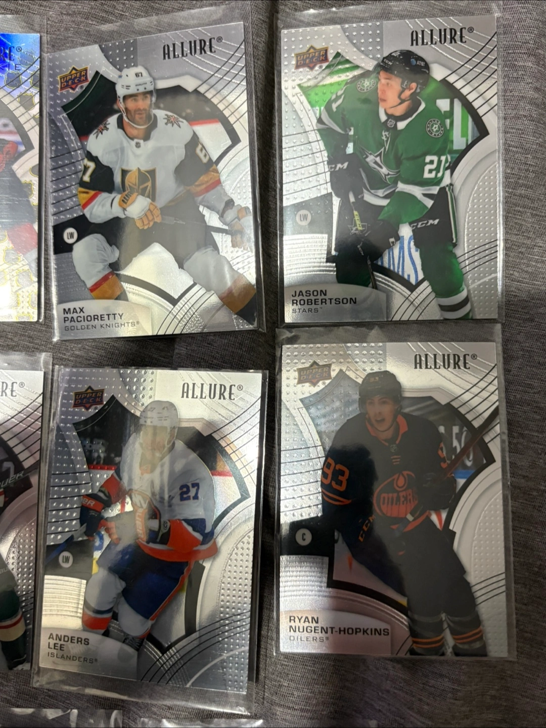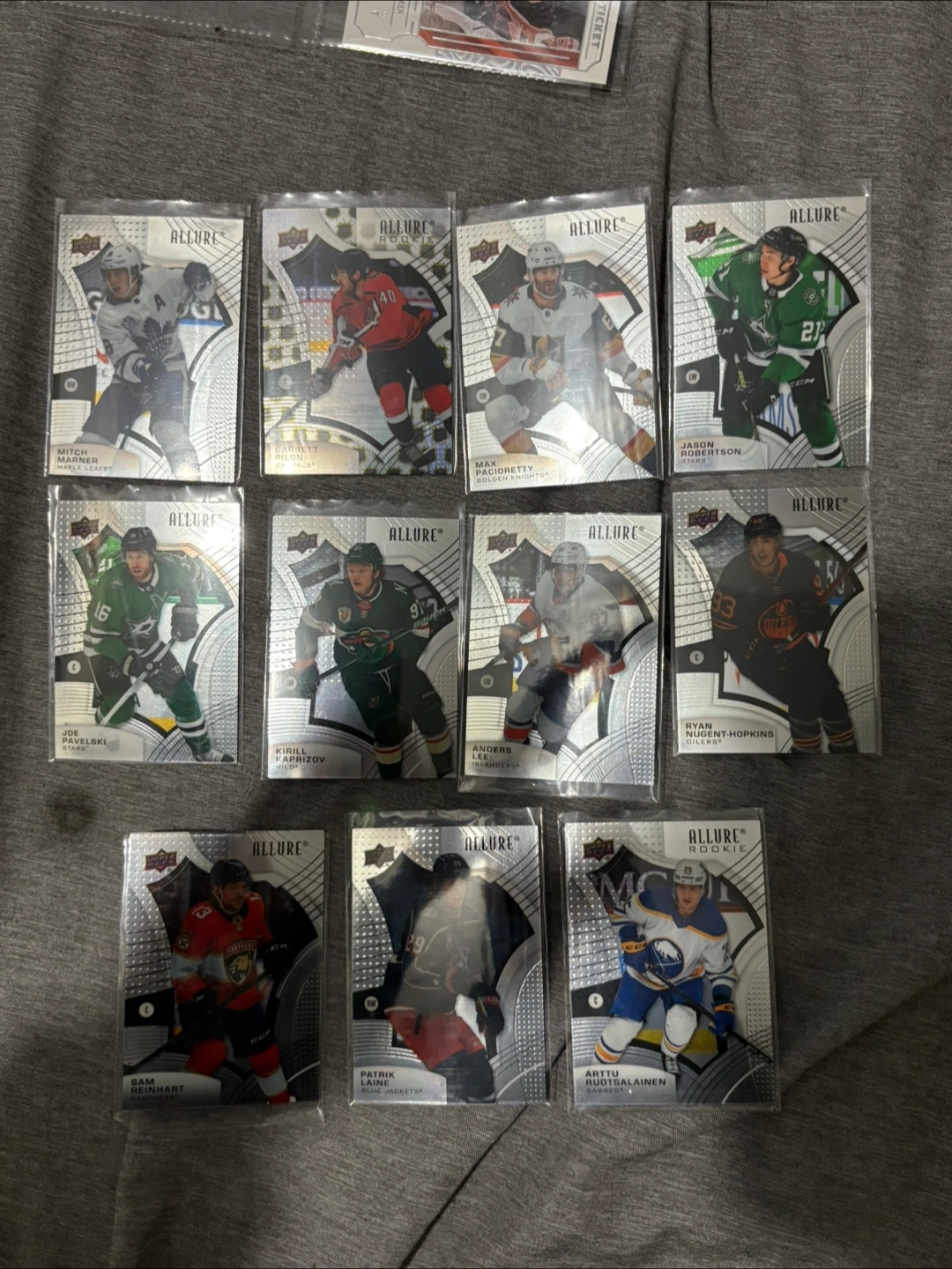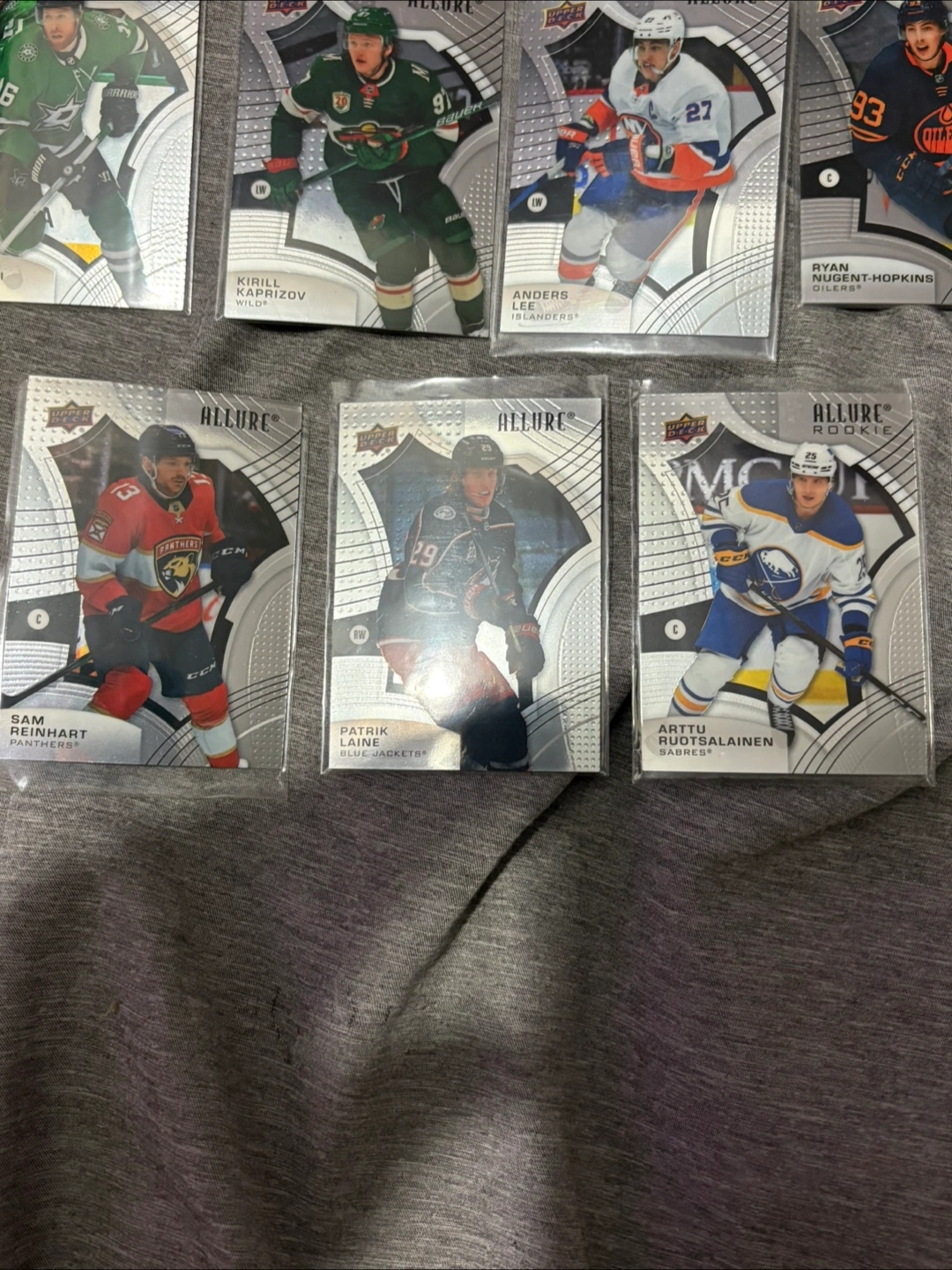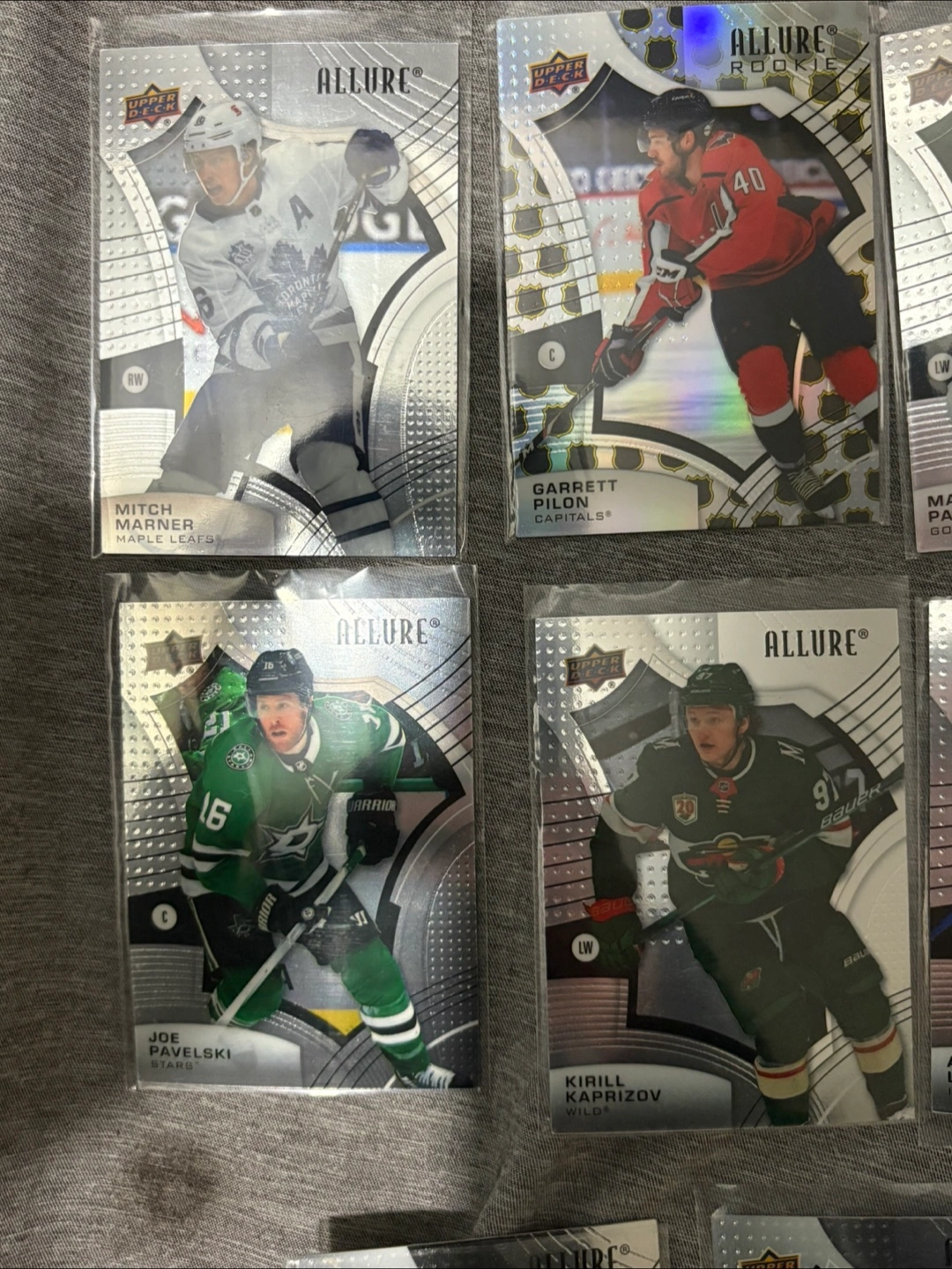 Selling a collection of Upper Deck Allure hockey cards! Featuring players like Mitch Marner, Garrett Pilon, Joe Pavelski, Kirill Kaprizov, Max Pacioretty, Jason Robertson, Anders Lee, Ryan Nugent-Hopkins, Sam Reinhart, Patrik Laine, and Arttu Ruotsalainen 🔥 NHL Allure Holographic Hockey Card Lot – Base Set – 11 Cards – Upper Deck 🔥 This listing includes an 11-card lot of NHL Allure base set holographic hockey cards from Upper Deck. These cards feature a chrome-style, holographic finish that makes them stand out in any collection. Perfect for set builders, collectors, or hockey fans looking to pick up some shine! ✨ Details: • 11x NHL Allure Base Set Cards • Holographic / Chrome Finish • Upper Deck Brand – Authentic Trading Cards • Year: 2021-2022 • Players: Mix of NHL stars (see photos for details) 🧊 Cards are in near-mint or better condition, straight from packs to sleeves. Stored in a smoke-free, pet-free environment. 📦 Cards ship securely in protective sleeves and packaging to ensure safe delivery. ✅ Great for collectors, gifts, or reselling! Binder 2
