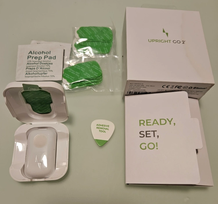 New Upright Go 2 posture corrector. Includes device, alcohol prep pads, adhesive removal tool, and packaging. Ready to use.