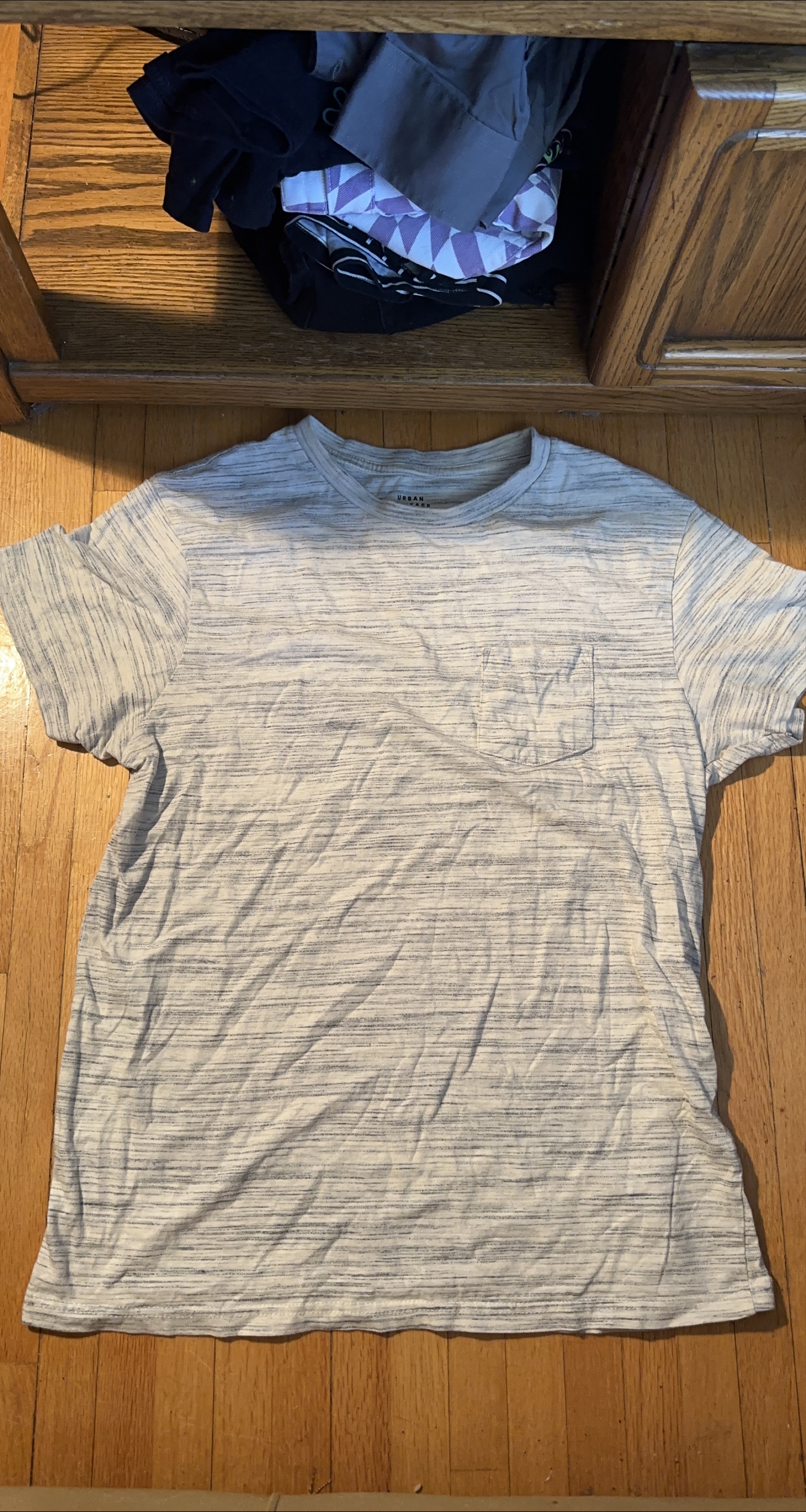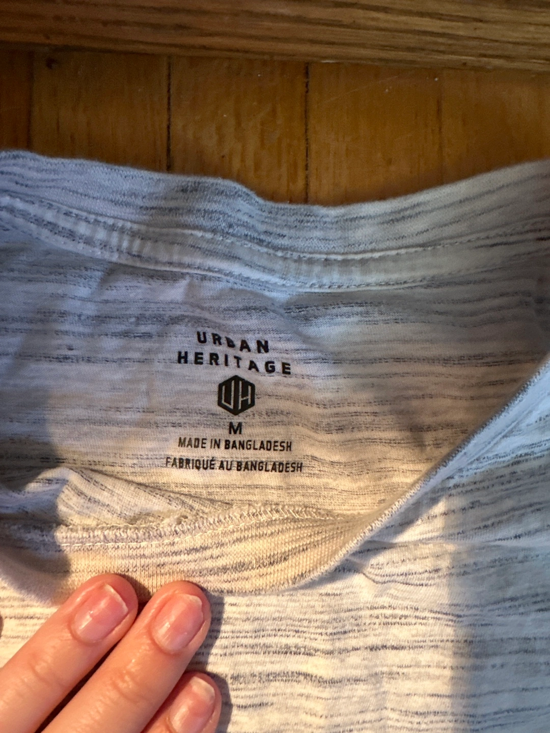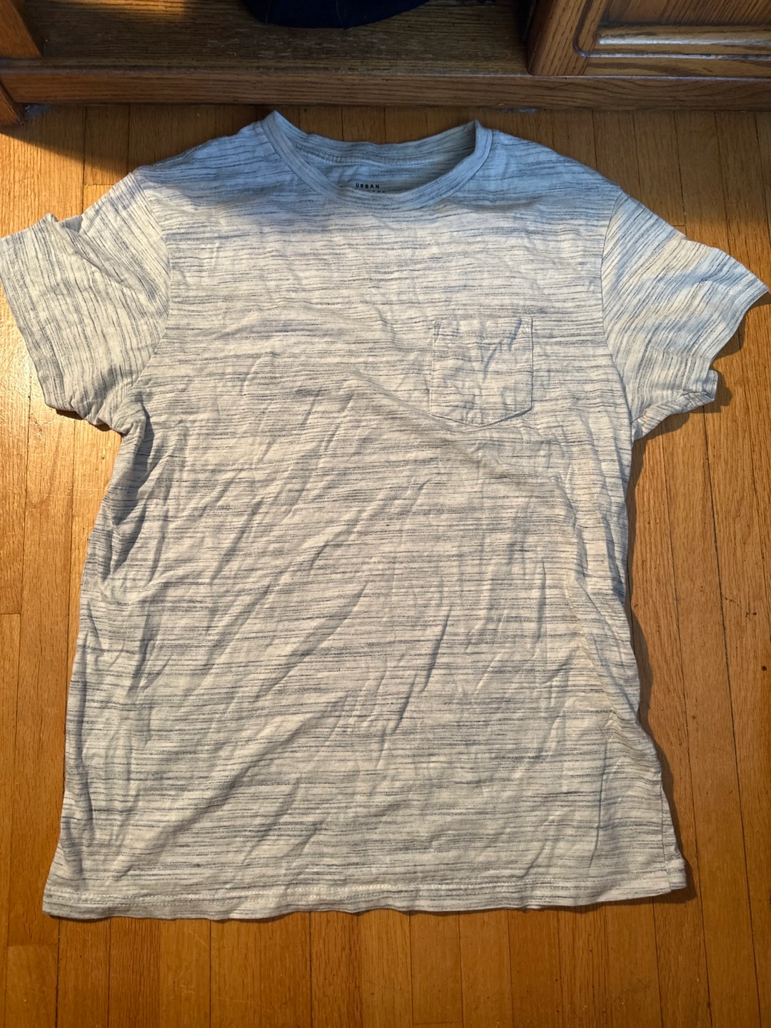 Gently used Urban Heritage T-shirt in size medium. It's a light grey colour with a subtle striped pattern and a small pocket on the chest.