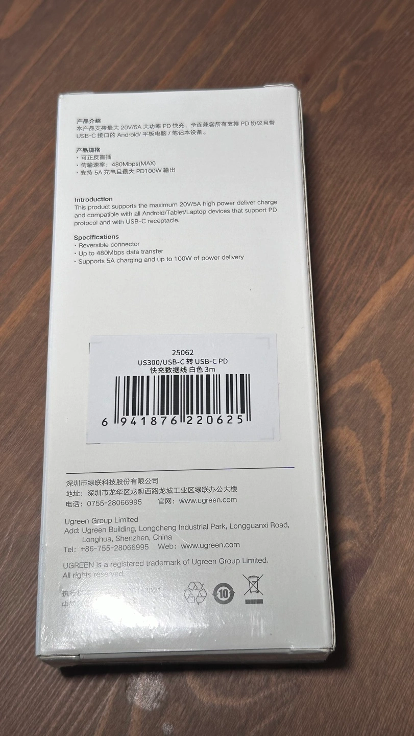 High quality USB-C cable. Supports 5A charging and up to 100W of power delivery. Up to 480Mbps data transfer. 3 meters long.