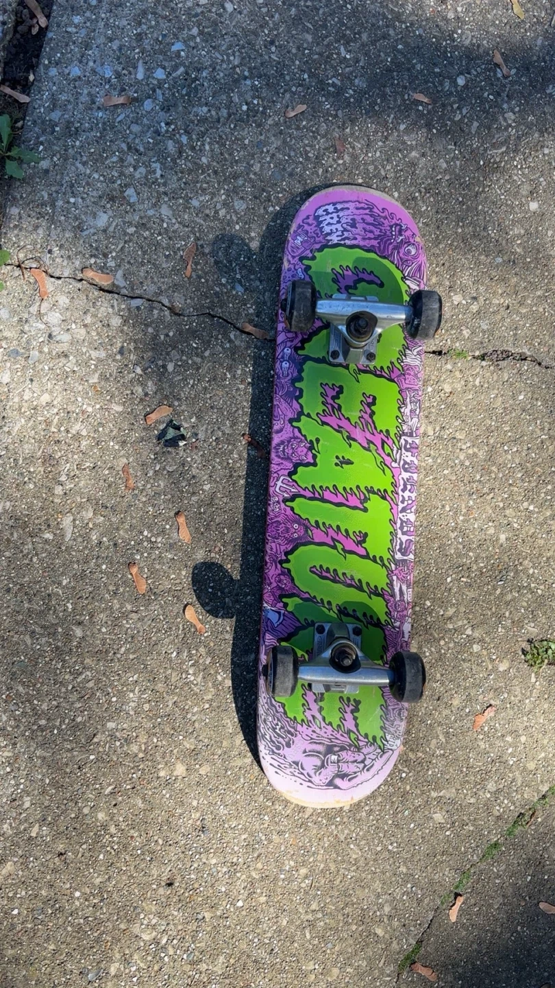 Selling a used skateboard in good condition! It has a cool design on the bottom. Perfect for beginners or experienced skaters alike