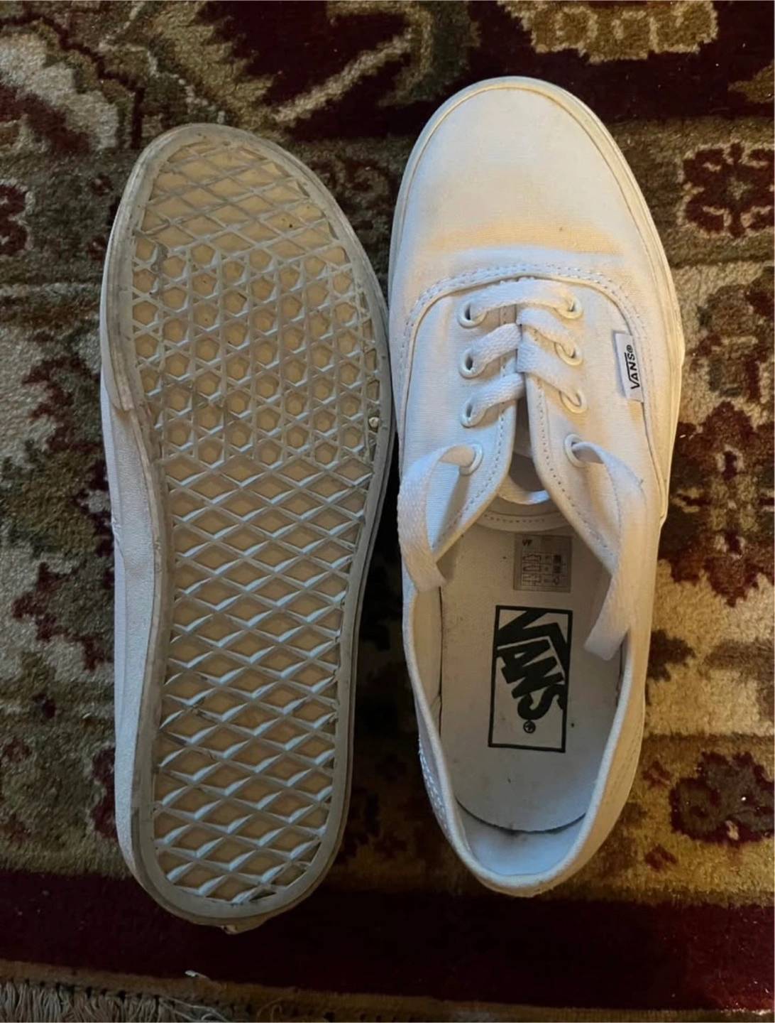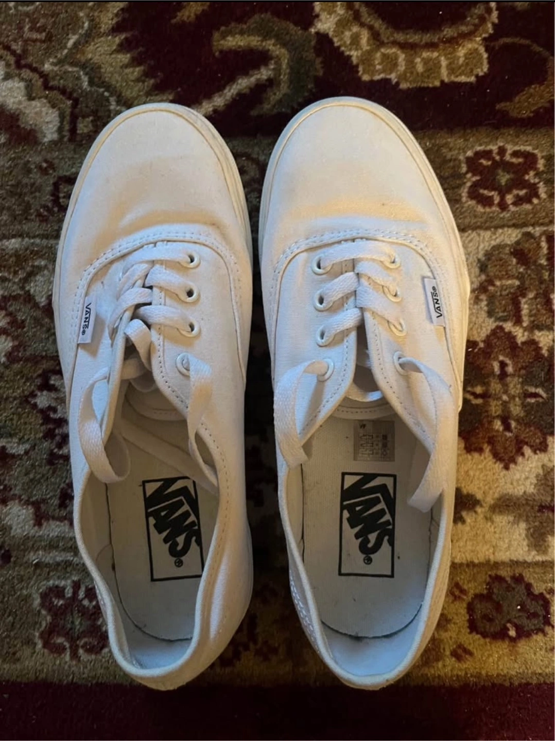 Selling a pair of classic Vans Authentic sneakers in white! They're in good condition and ready for a new home. Perfect for everyday wear, these shoes are a size 8. Worn a few times. Selling because I am trying to declutter:)