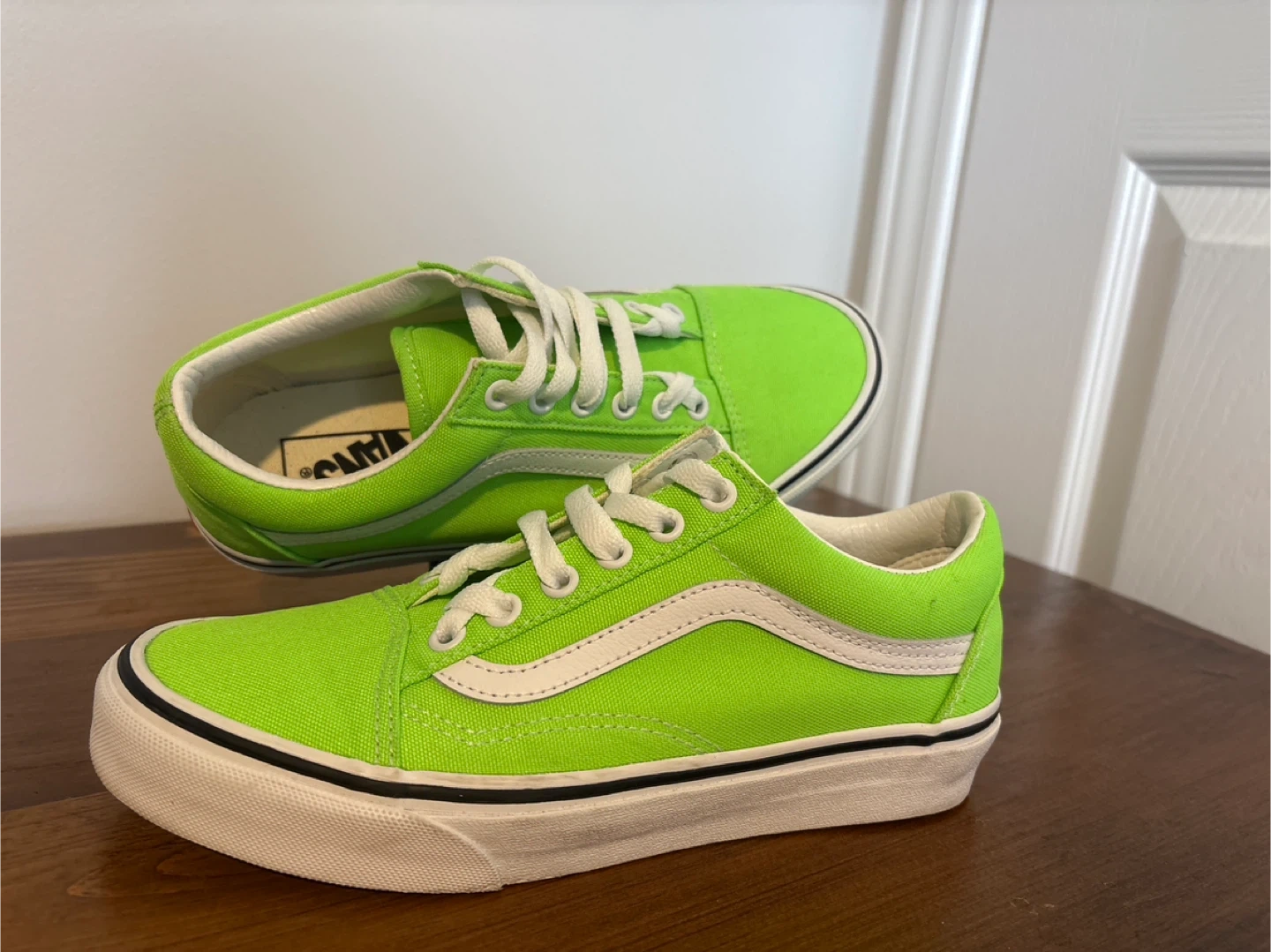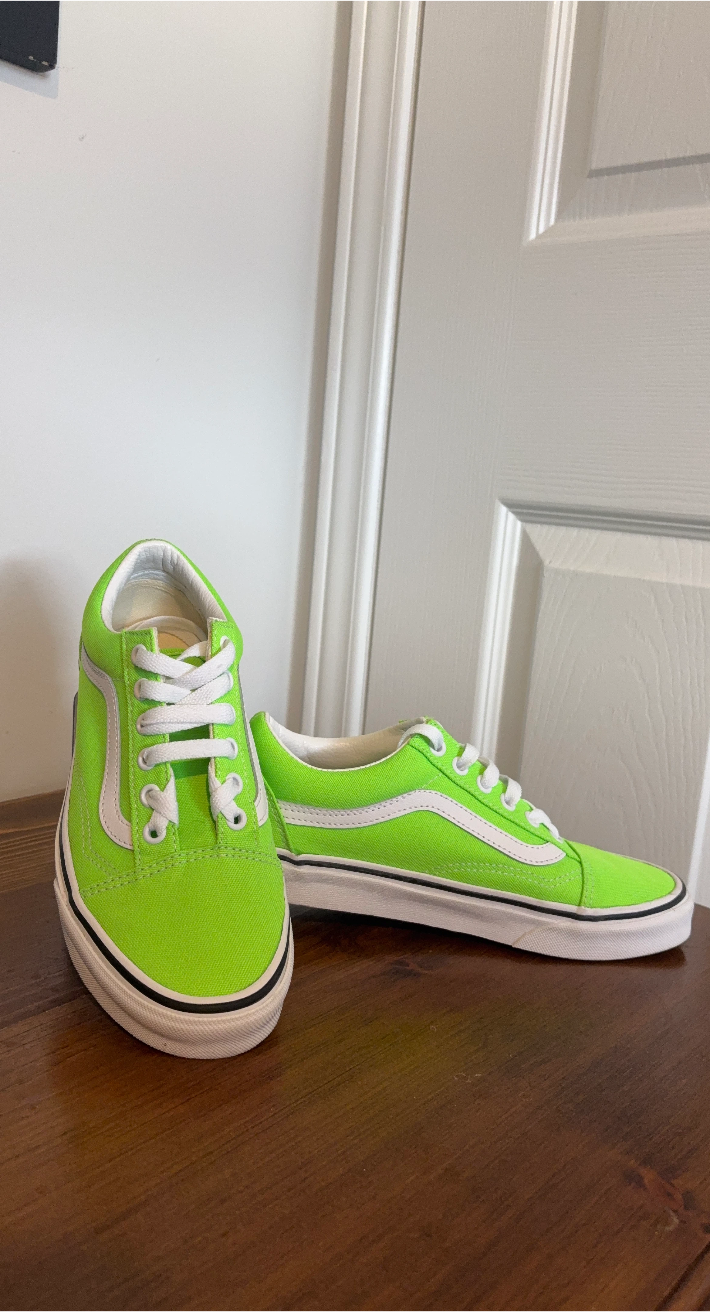Selling a pair of Vans Old Skool sneakers in a vibrant lime green colour! These classic sneakers are in great condition and ready for a new home. They feature the iconic Vans side stripe and a durable waffle outsole. Perfect for adding a pop of colour to your wardrobe! Size 7 women’s Size 5.5 men’s.