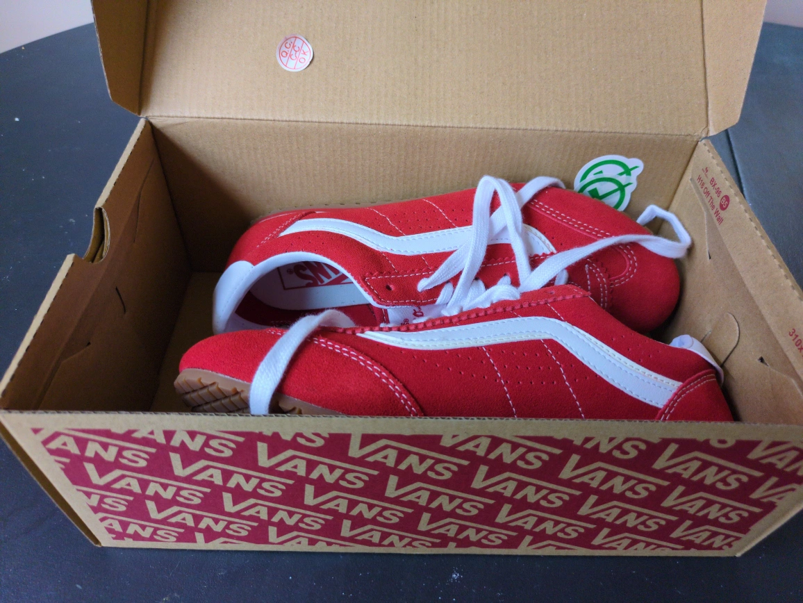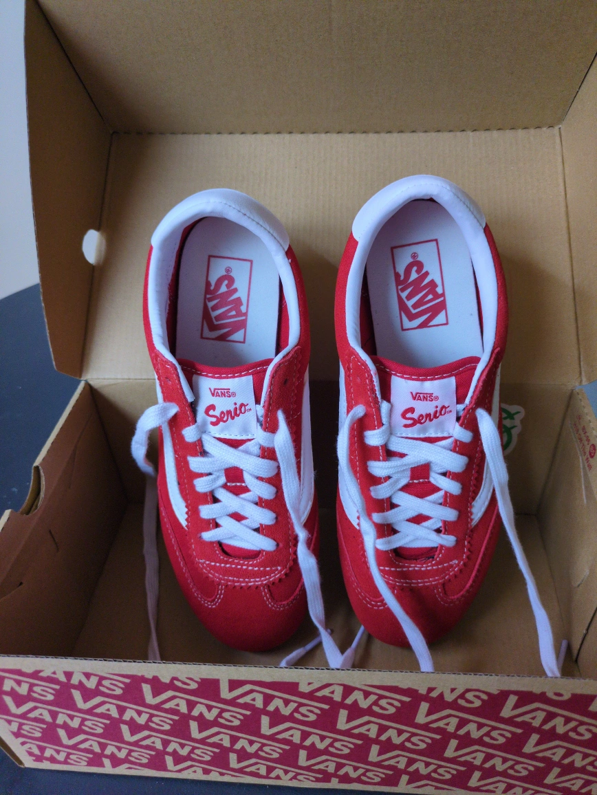 they were a gift but I will never wear them Selling a pair of Vans Serio sneakers in red and white! They are in great shape and come with the original box. The size is us 8 Perfect for adding a pop of colour to your outfit!