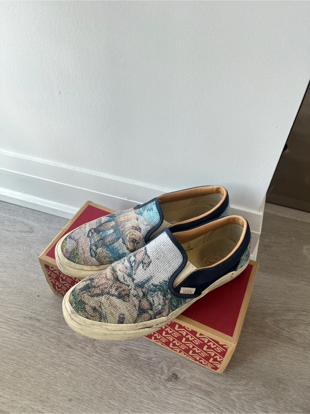 Selling a pair of Vans slip-on shoes. They feature a unique cross-stitched bear design. The shoes come with box. They're in good shape and ready for a new home!