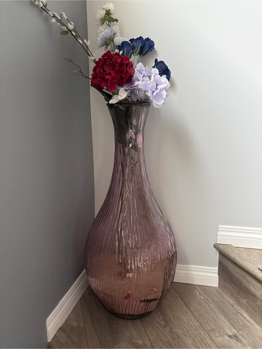 Glass Vase with flowers. Very heavy. 30 inches high; 15 inches wide at its widest spot