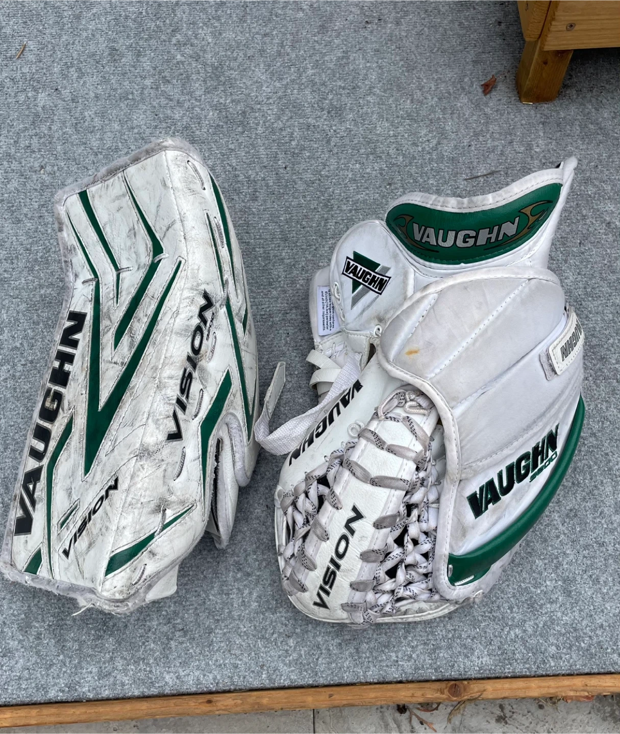 Selling a Vaughn Vision 9500 goalie glove and blocker set! They're used but still have lots of life left. Great for hockey players looking for reliable gear