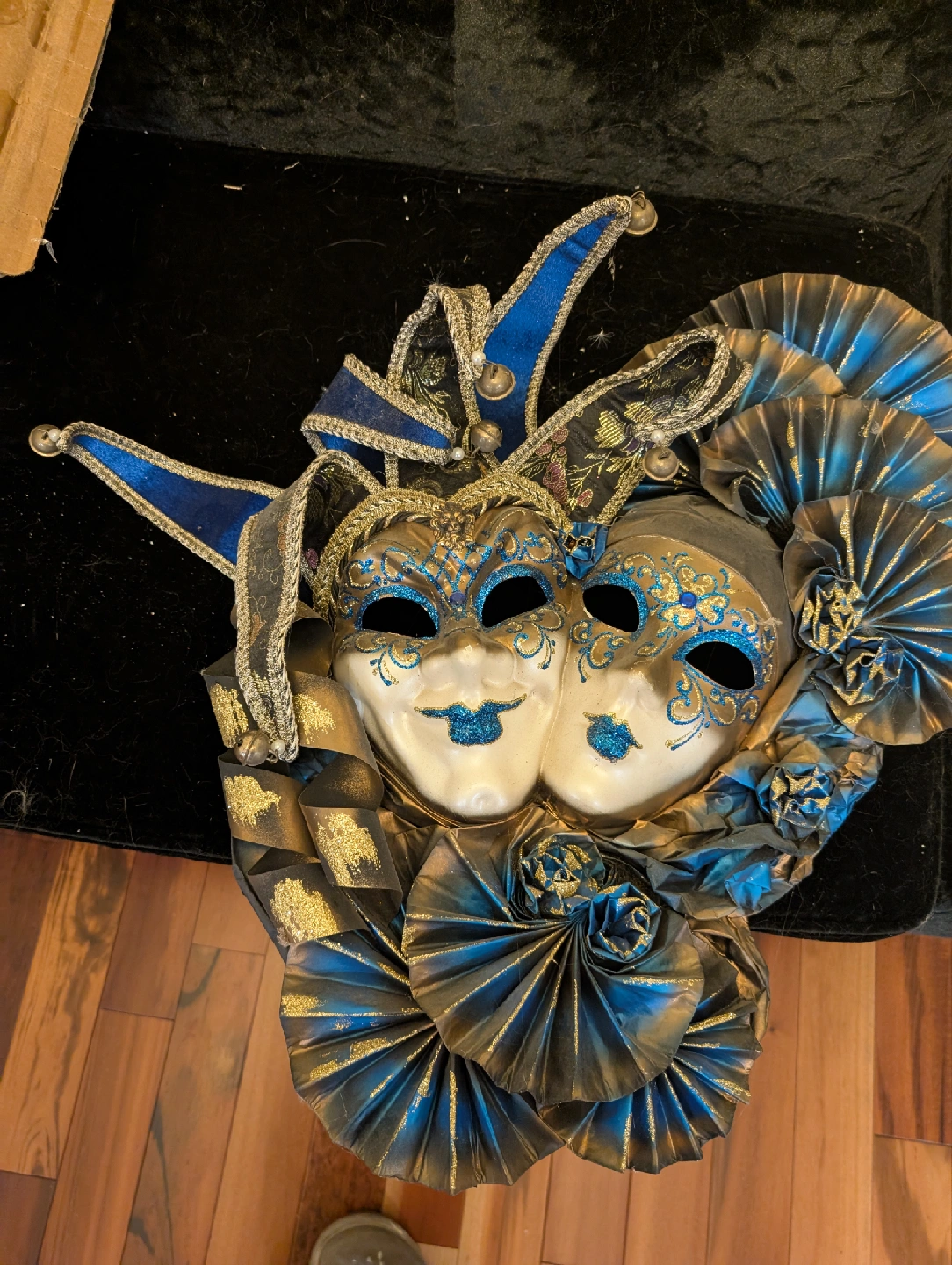 Selling a decorative Venetian Carnival Mask. It features a two-face design with blue and gold accents. Perfect for display or costume use!