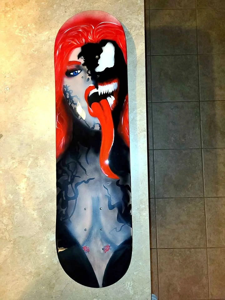 I'm the Artist that painted this skateboard. An epoxy gloss resin added to protect it and make all the colours pop!