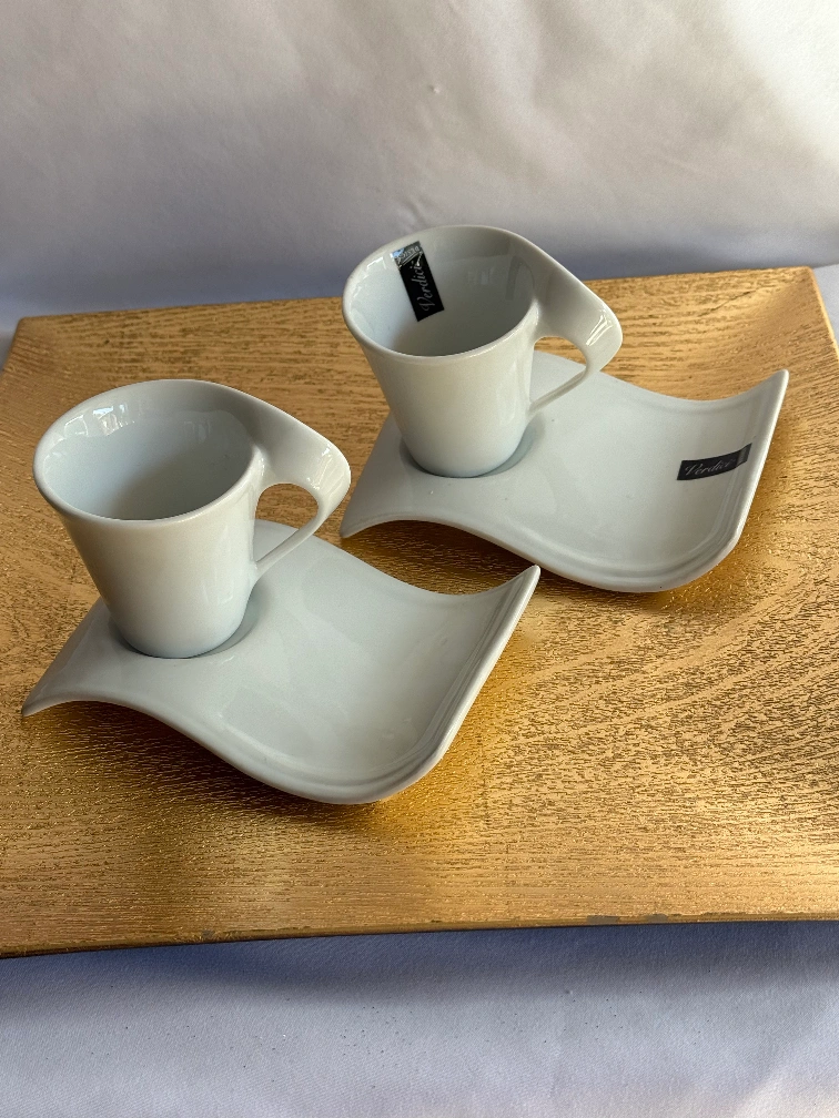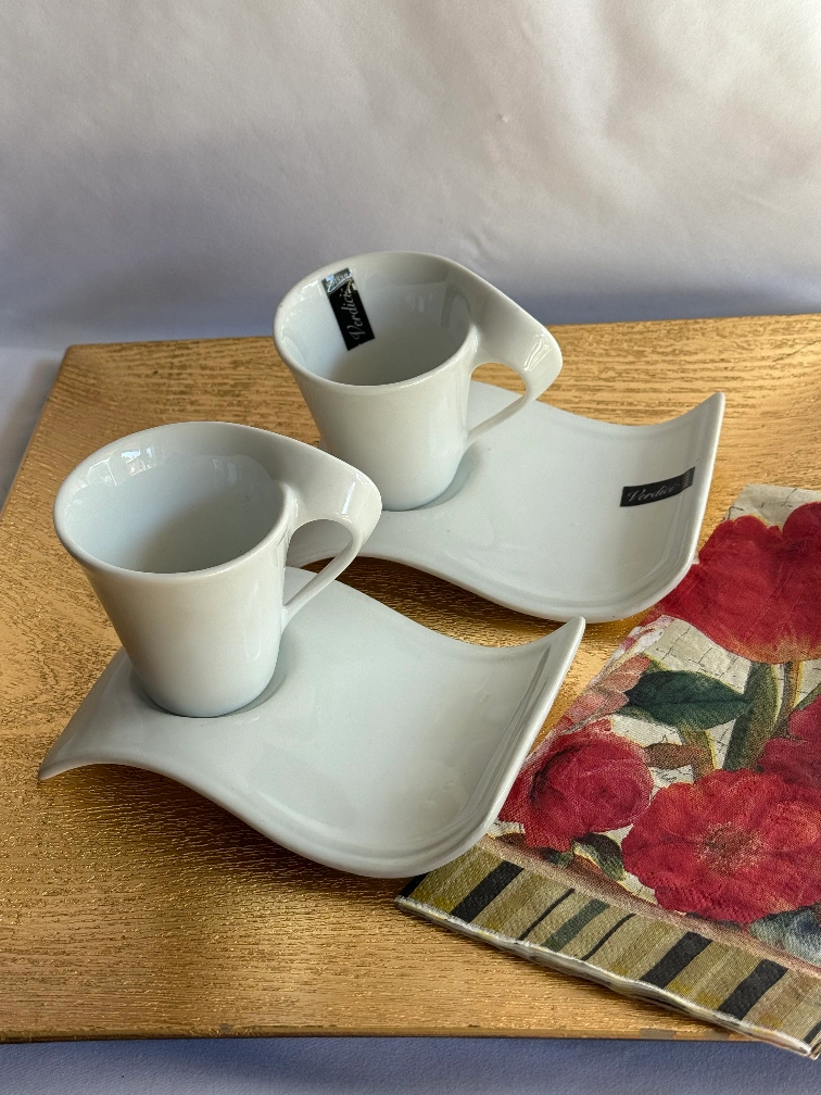 Selling a set of two Verdici Design espresso cups with matching saucers. The cups and saucers are white and feature a unique, modern design. They are dishwasher and microwave safe, making them both stylish and practical for your daily coffee routine like new condition