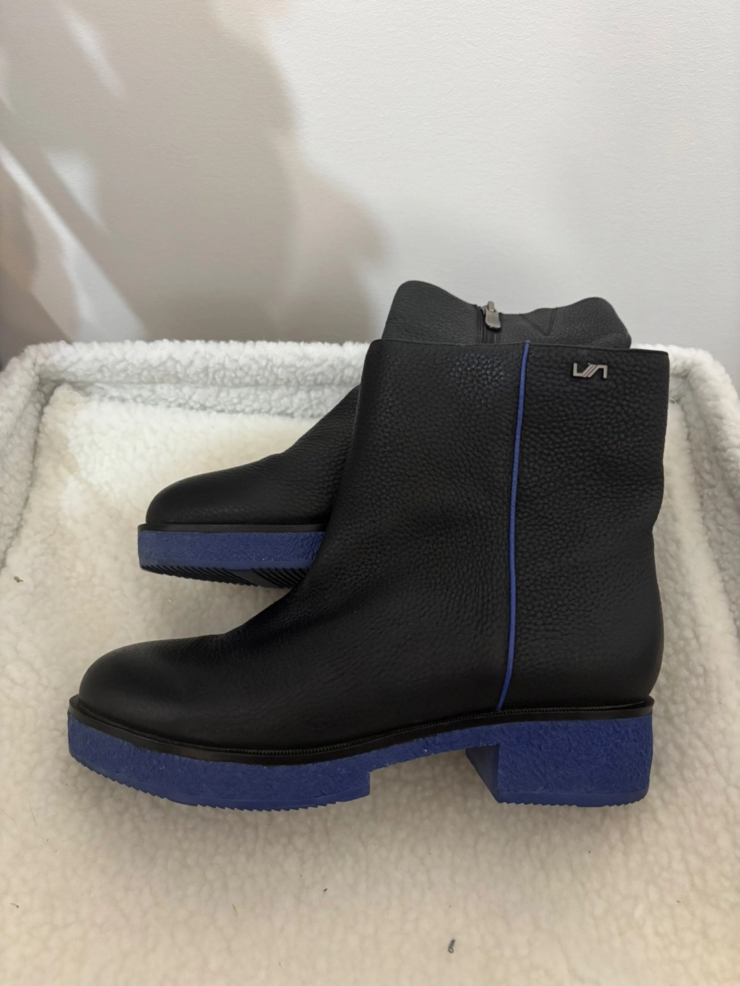 VIA SPIGA ankle boots in great condition! These stylish boots are black leather with a blue sole. The size is 39, which is equivalent to a US size 9