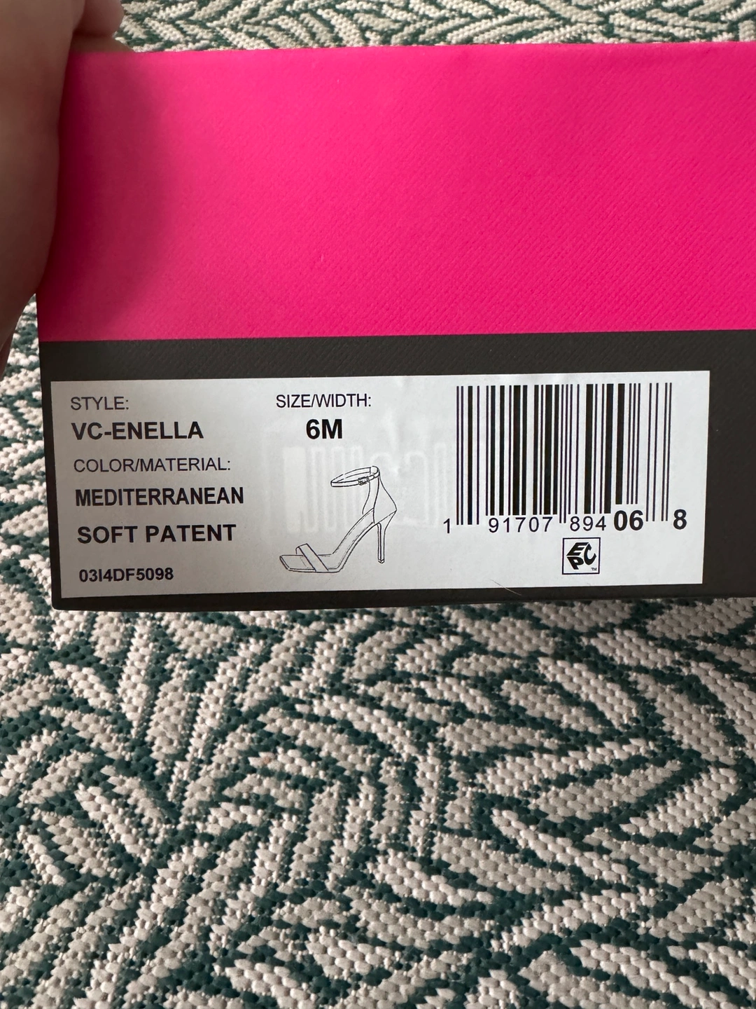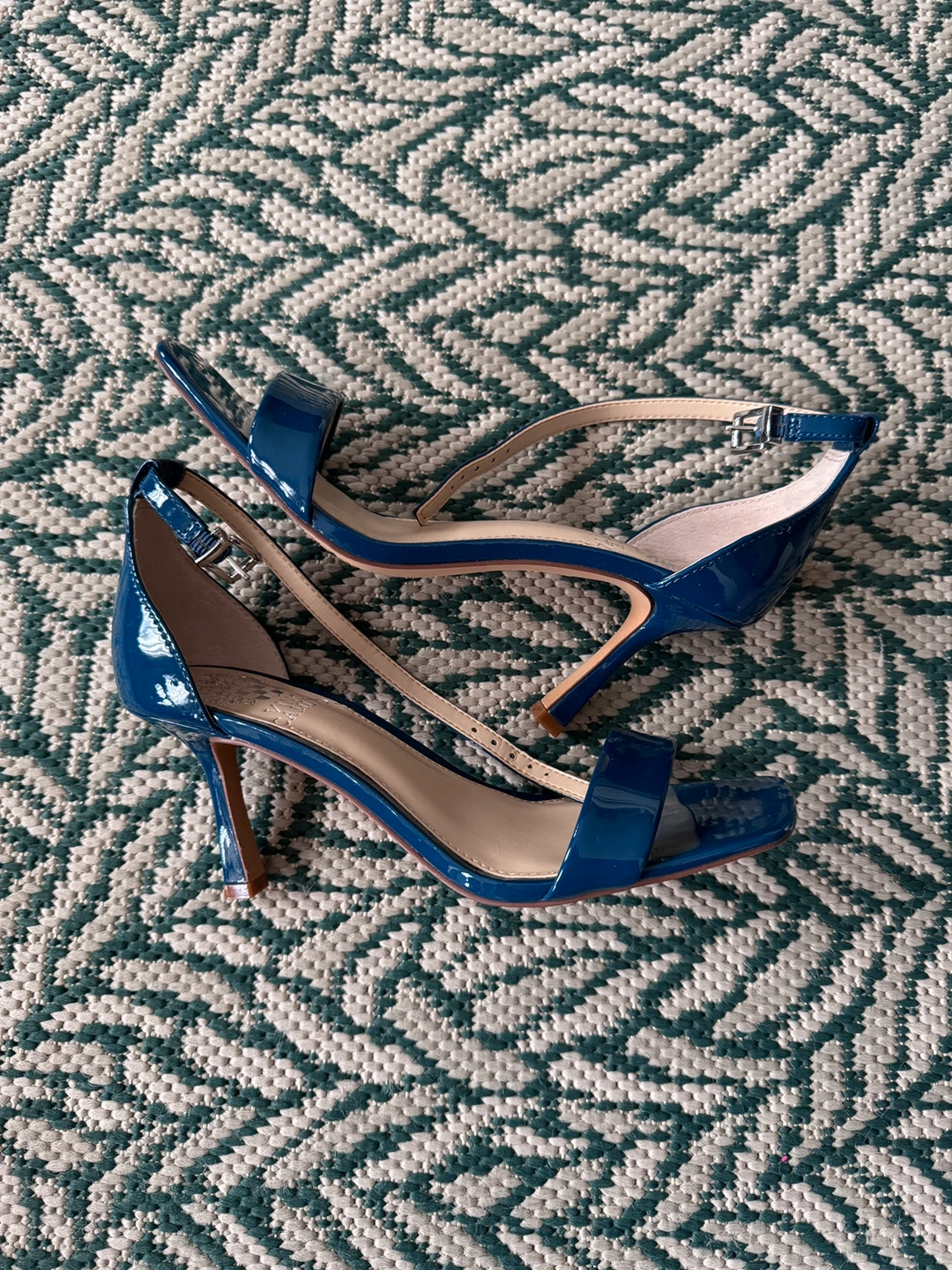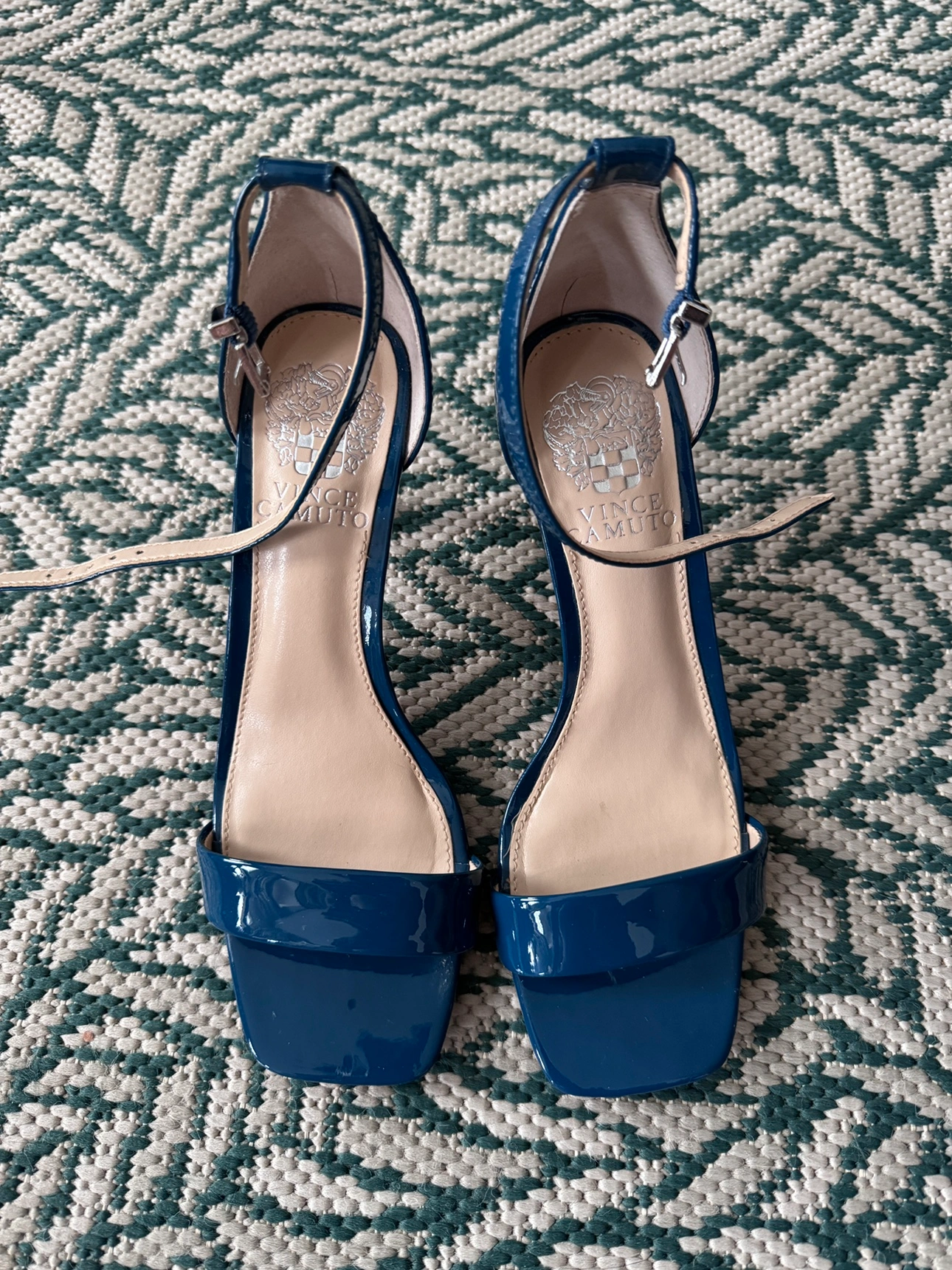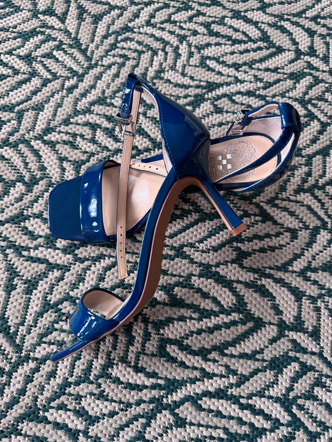 "Vince Camuto" blue leather sandals. High gloss leather sandals. The heel height makes them super comfortable for any occasion including office. Very good preowned condition, gently used. Come with original box. Last image is for colour reference. Size: US 6 Heel height: approx. 3" Cash only! Tags: office heels, office heeled sandals, summer sandals, summer heel sandals, summer shoes, blue heels, blue sandals, blue summer shoes, high gloss heels.