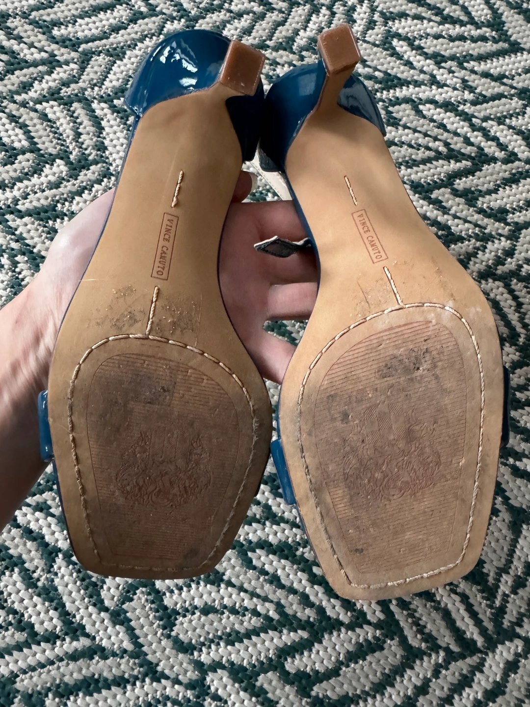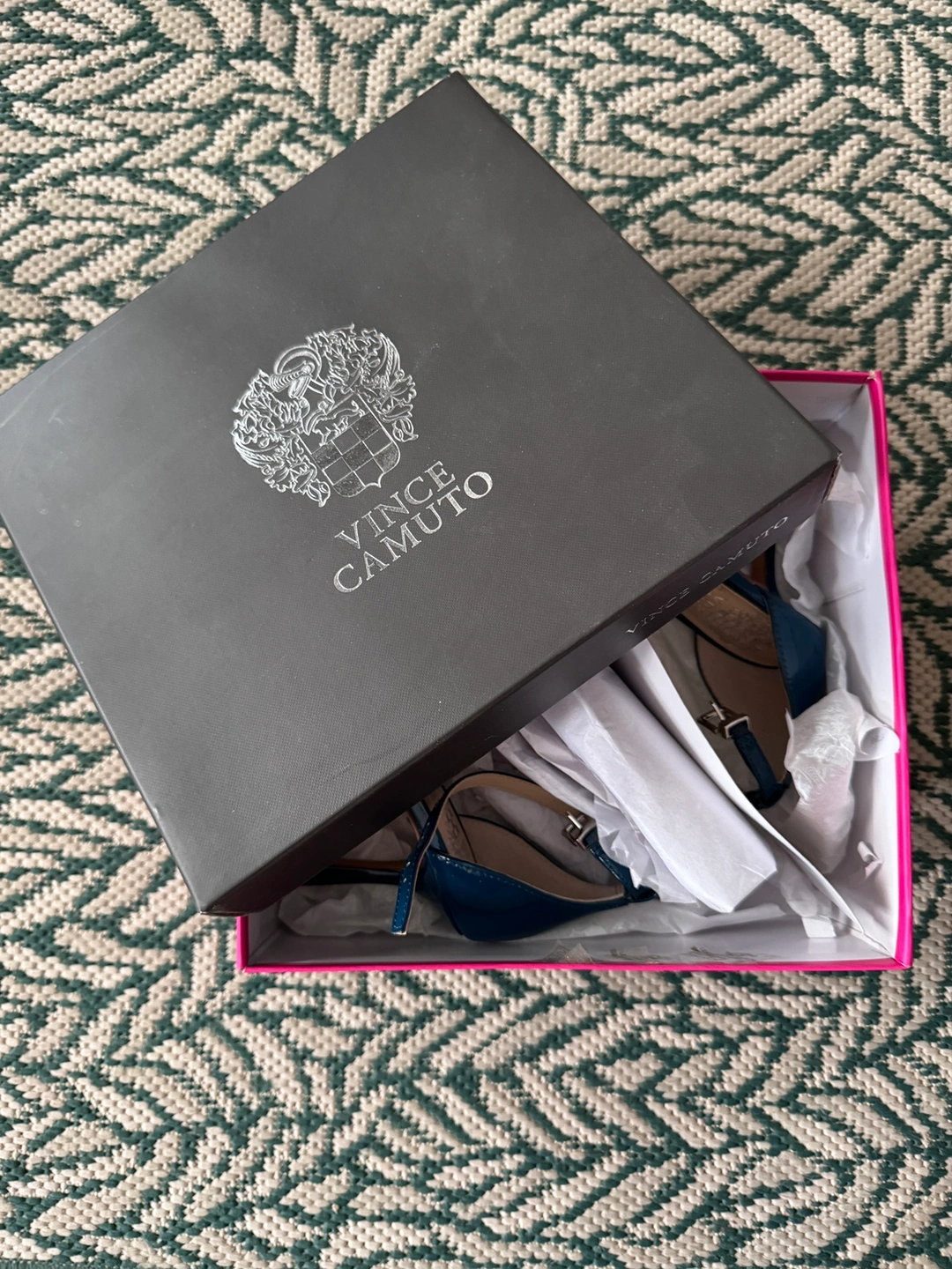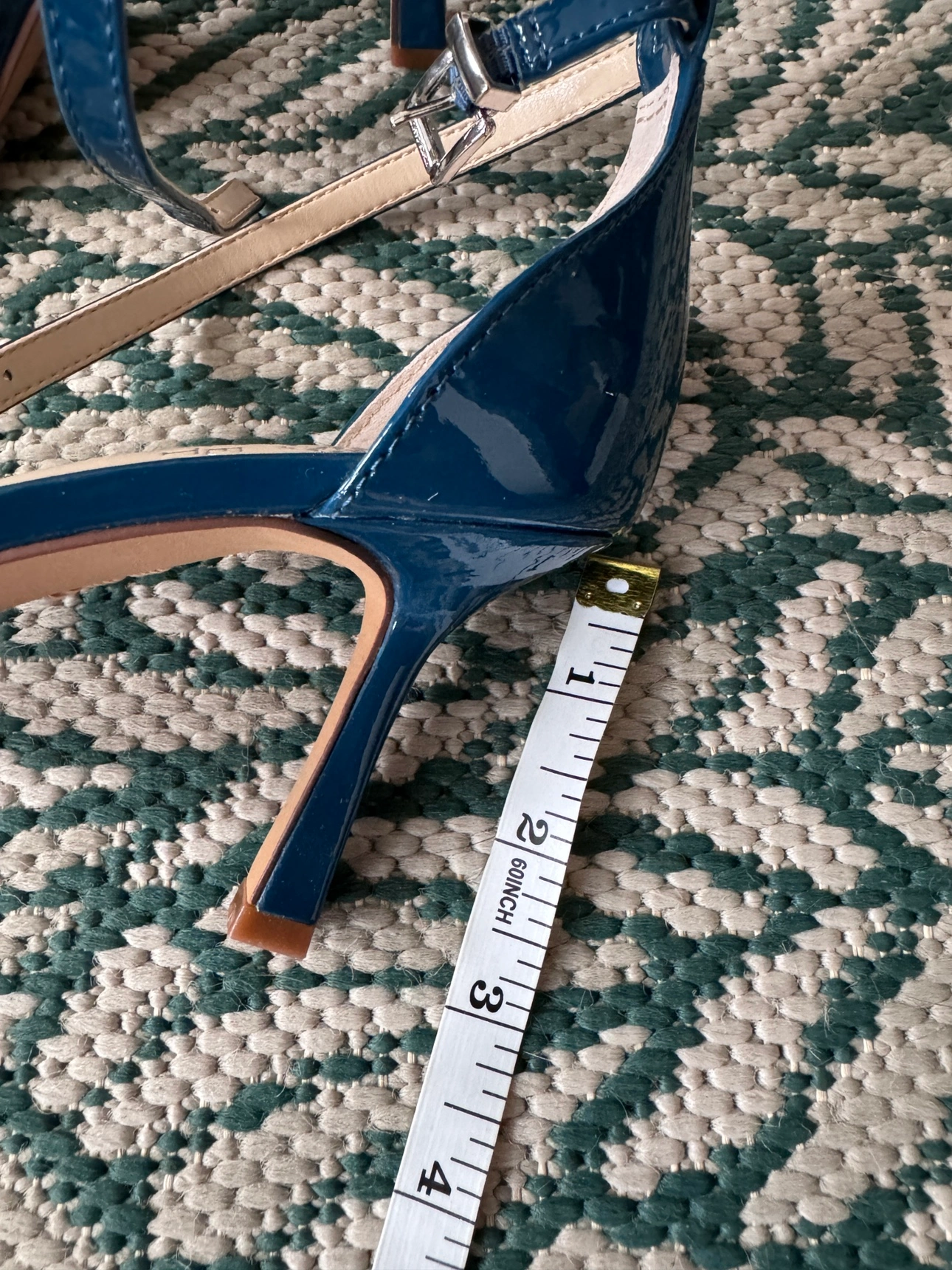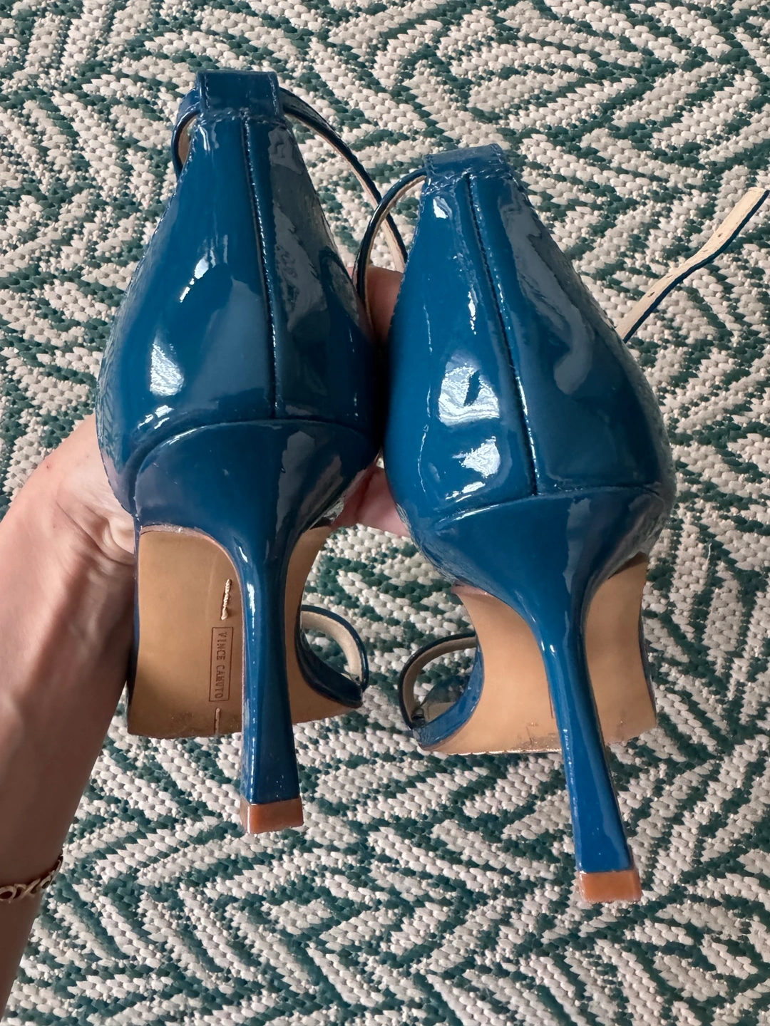 "Vince Camuto" blue leather sandals. High gloss leather sandals. The heel height makes them super comfortable for any occasion including office. Very good preowned condition, gently used. Come with original box. Last image is for colour reference. Size: US 6 Heel height: approx. 3" Cash only! Tags: office heels, office heeled sandals, summer sandals, summer heel sandals, summer shoes, blue heels, blue sandals, blue summer shoes, high gloss heels.