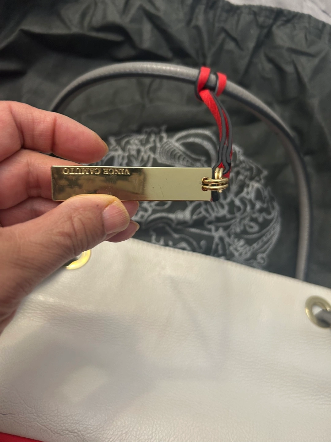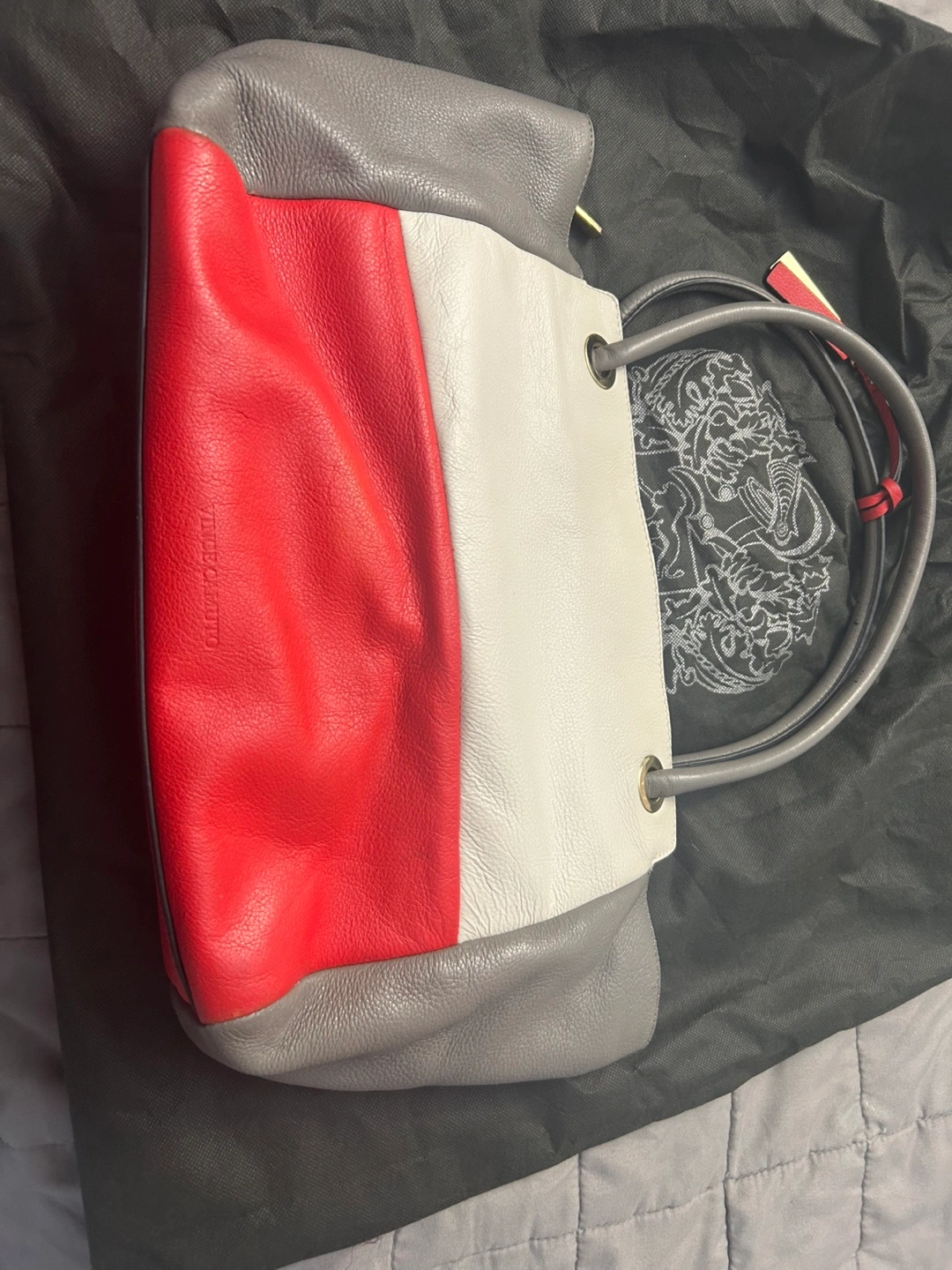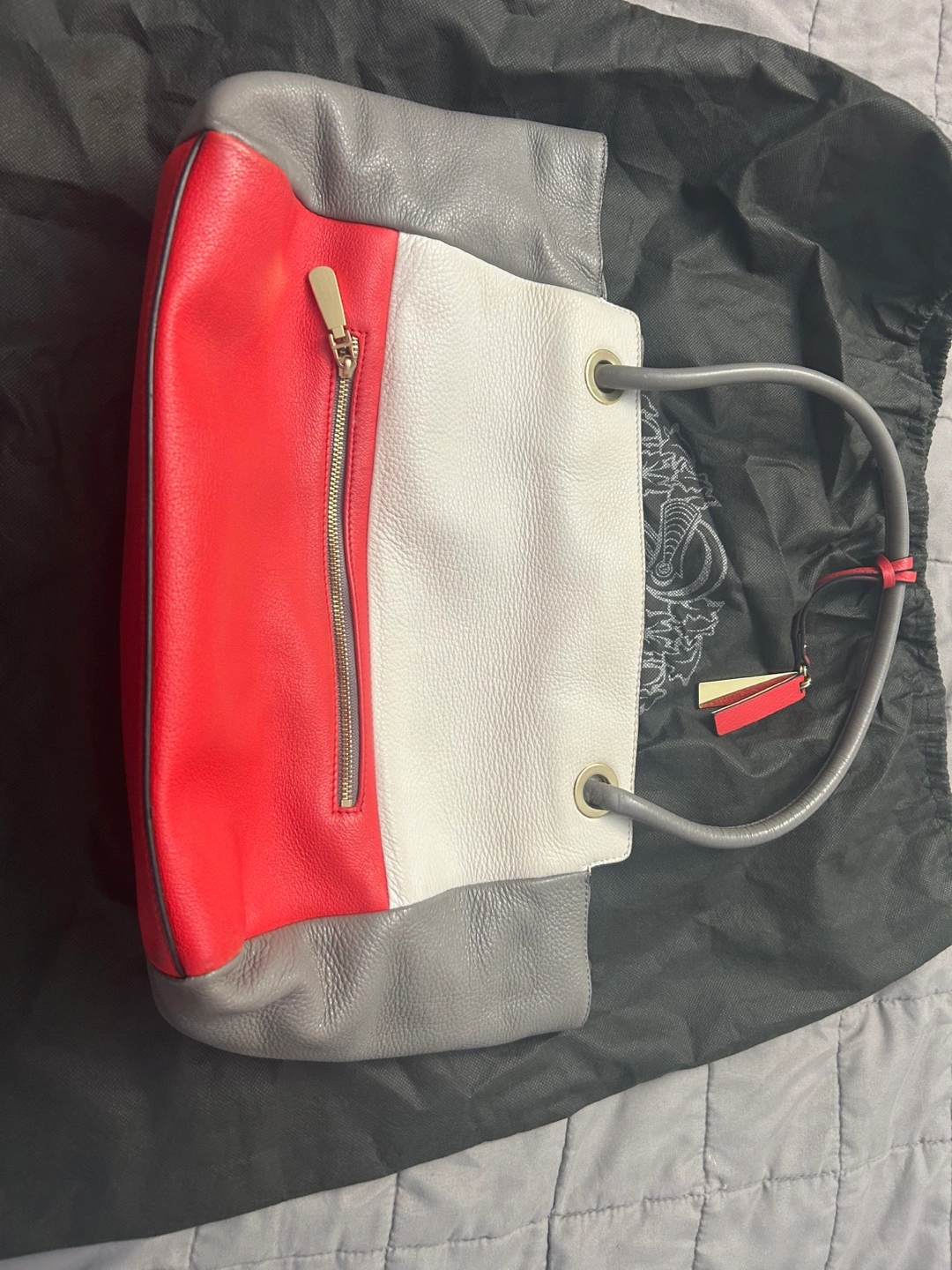 Selling a Vince Camuto tote bag in a stylish colour block design featuring red, white, and gray leather. It comes with its original dust bag! There are some signs of wear on the handles, as shown in the pictures.