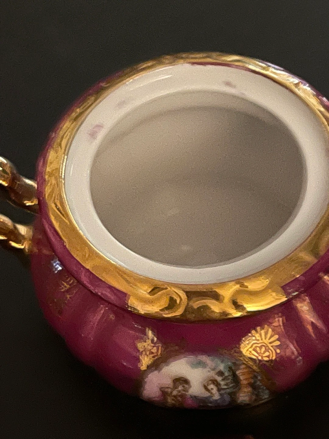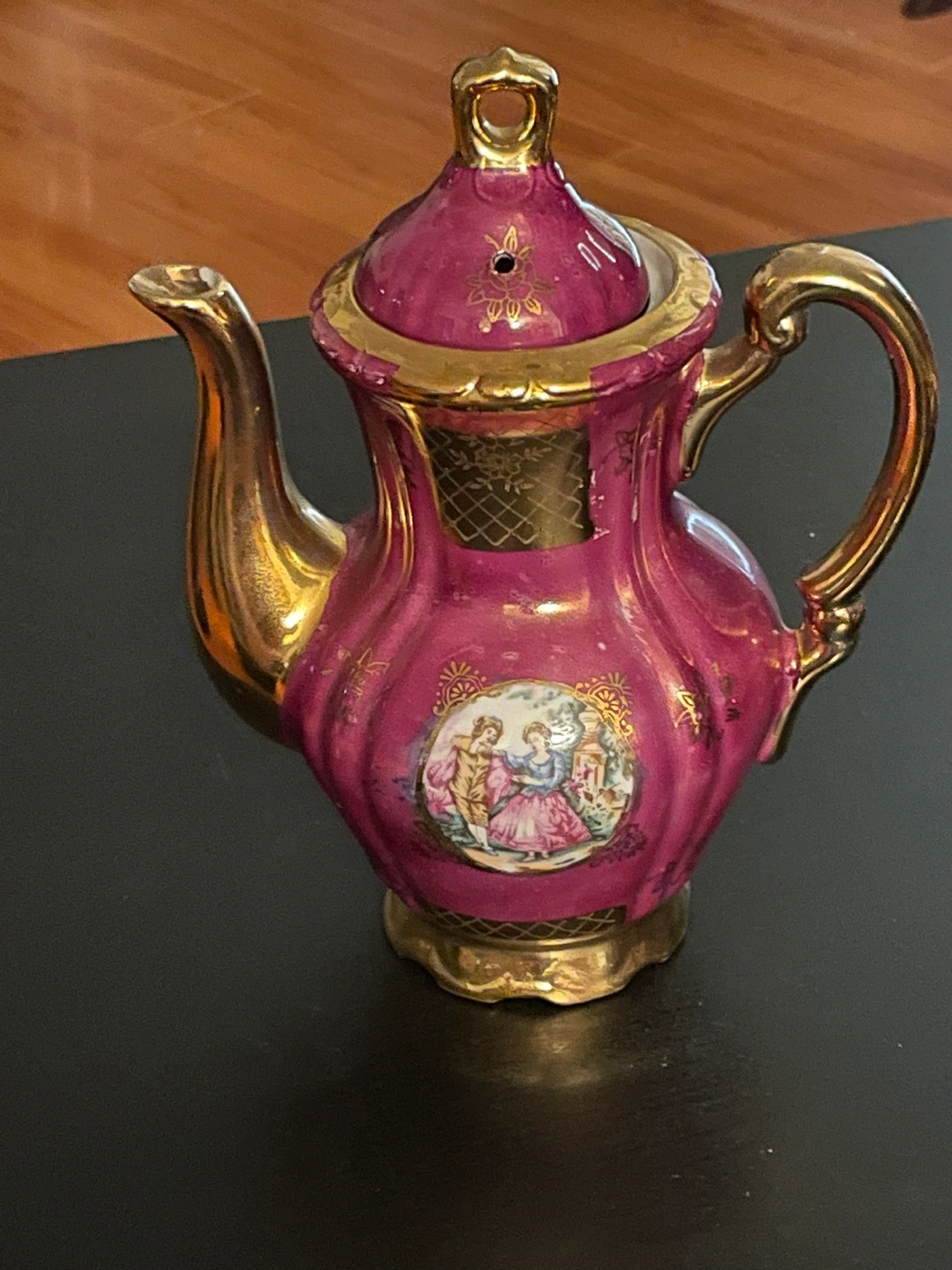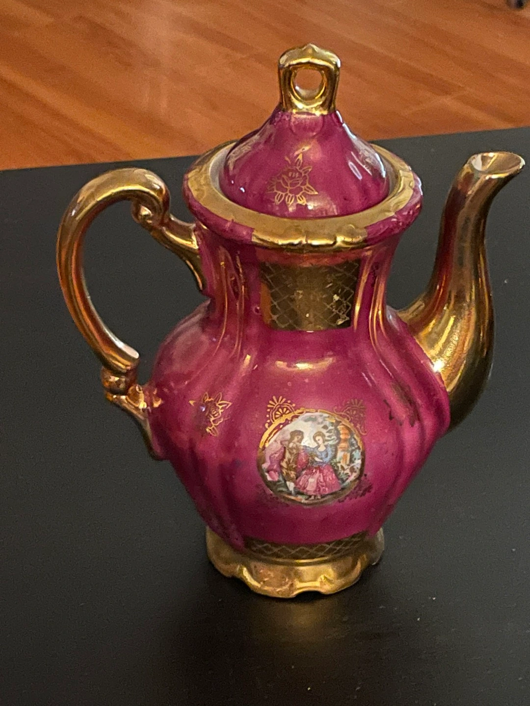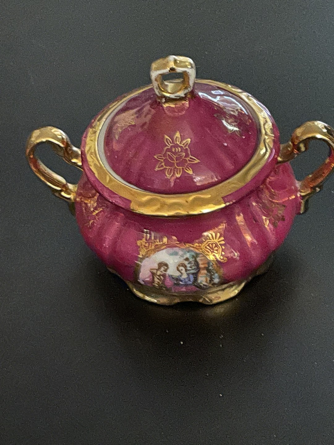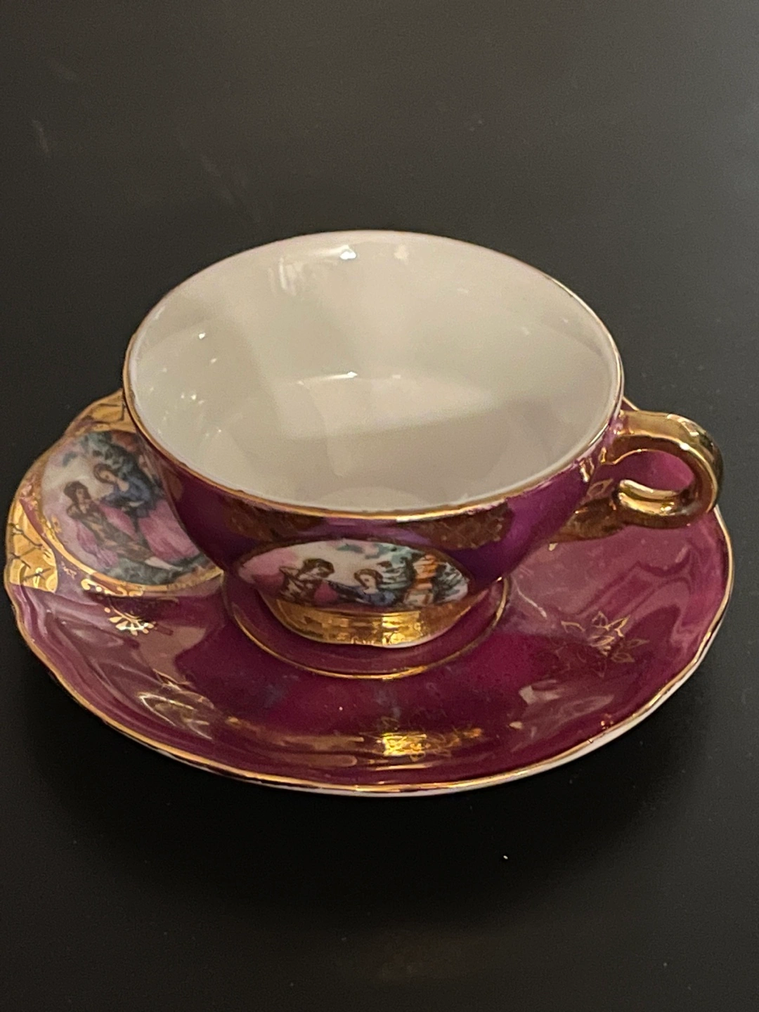 Beautiful complete set of Empress Bone China made in Japan. The color is rich maroon with a couple in the background. The set contains an exquisite tea pot, creamer and sugar bowl. There are 6 matching tea cups and saucers that are in the size of Demitasse tea cups. Lovely set for any bride to be.