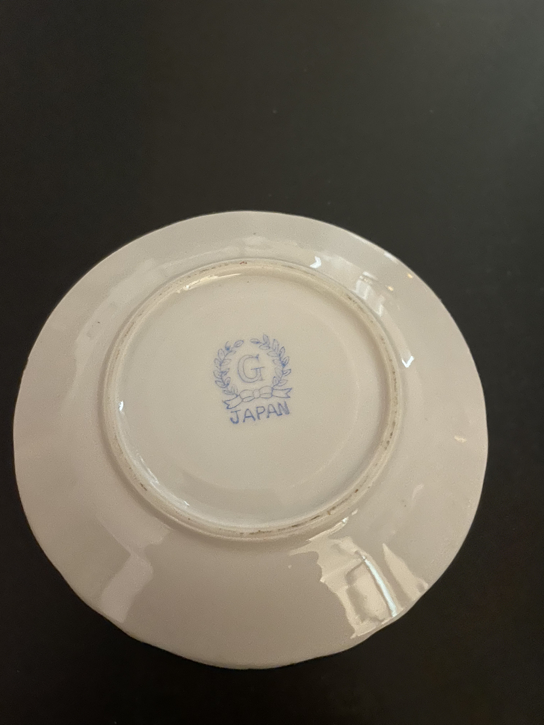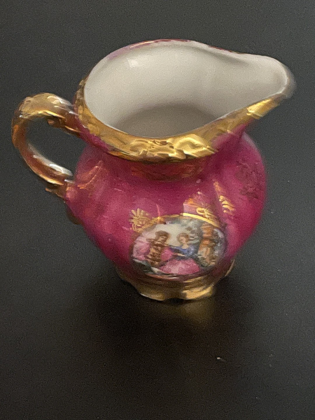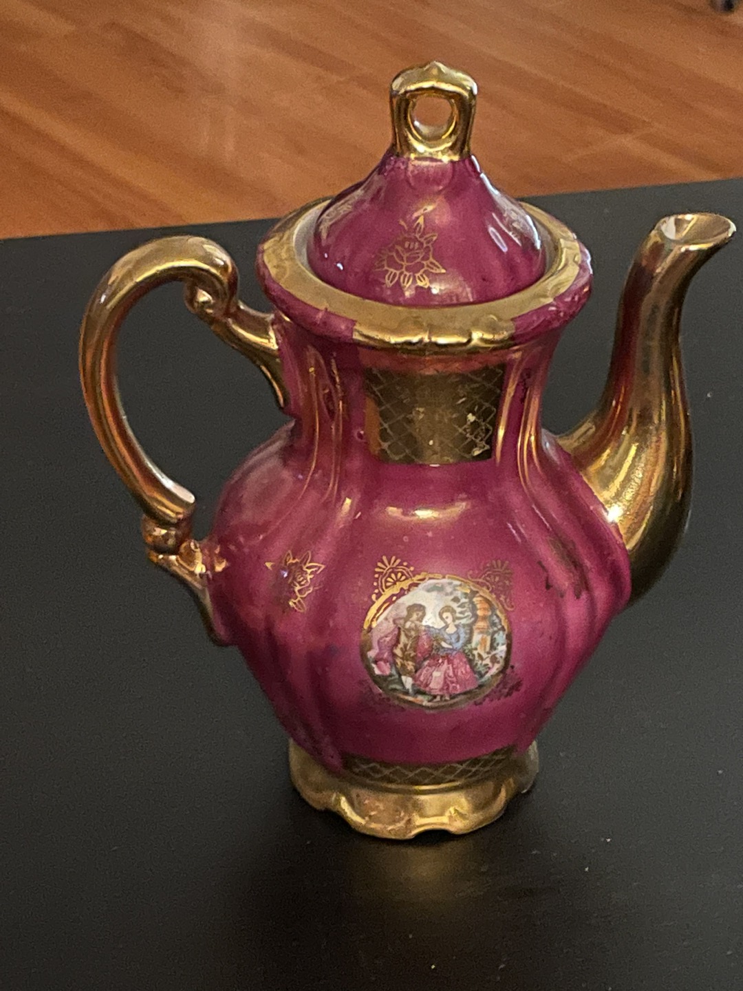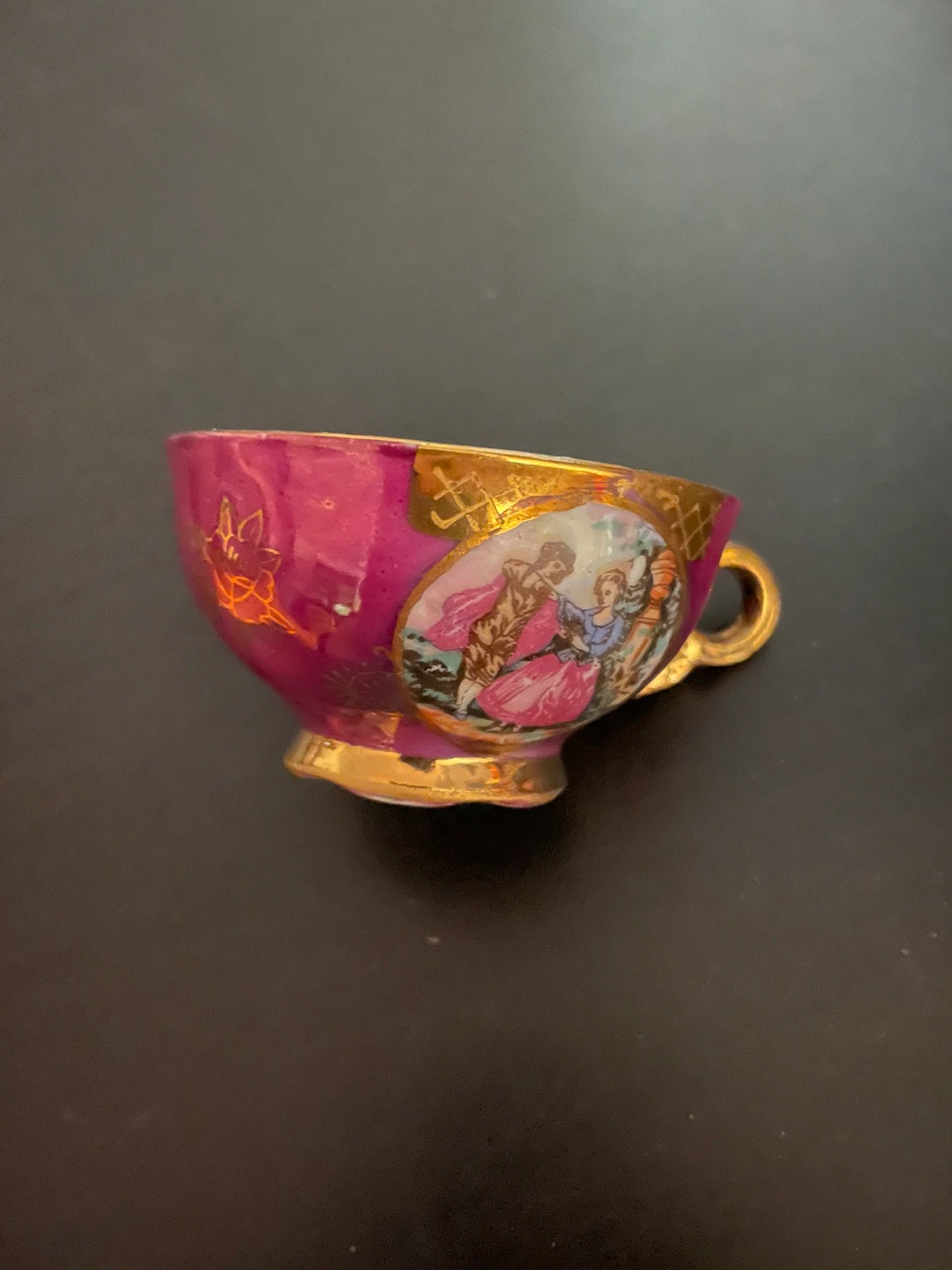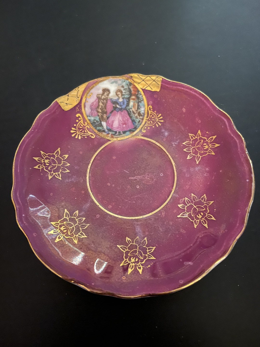 Beautiful complete set of Empress Bone China made in Japan. The color is rich maroon with a couple in the background. The set contains an exquisite tea pot, creamer and sugar bowl. There are 6 matching tea cups and saucers that are in the size of Demitasse tea cups. Lovely set for any bride to be.