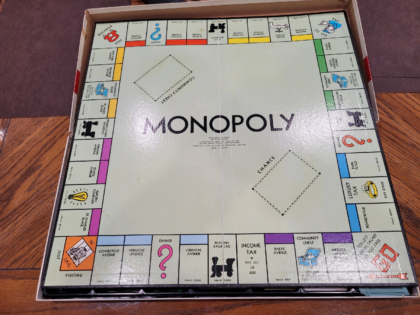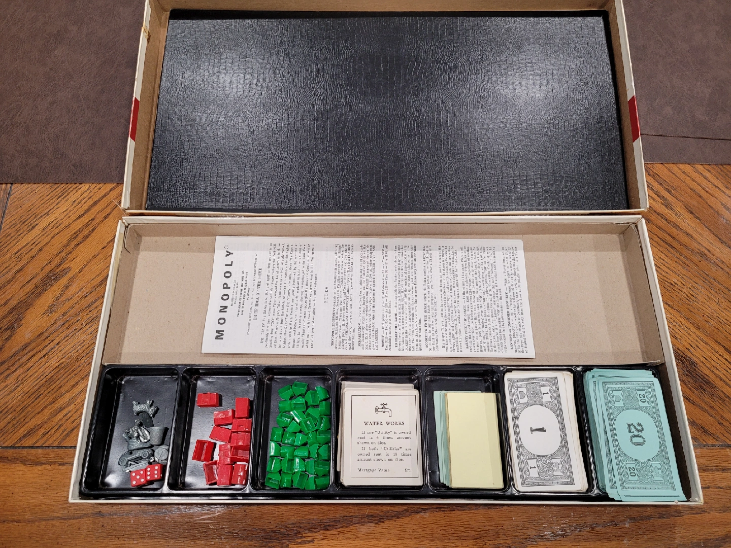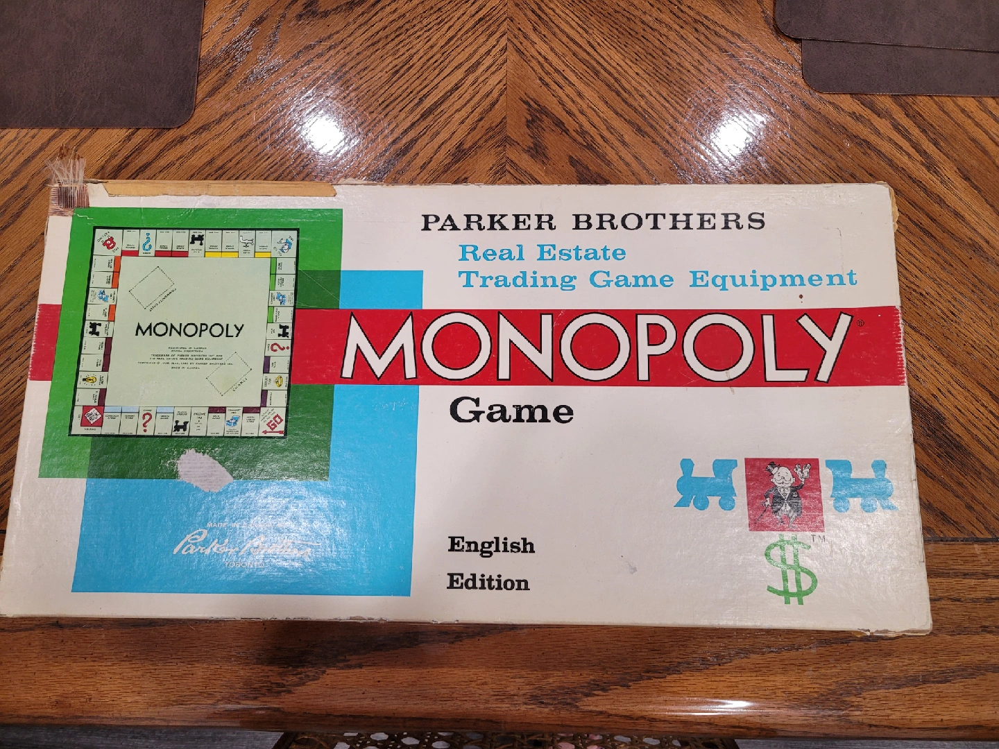Classic Parker Brothers Monopoly, 1961 board game, English Edition. Comes with board, box, money, cards, metal tokens, wooden houses & hotels, and dice. Box has some wear but overall in good condition. East Regina $30 Cash only