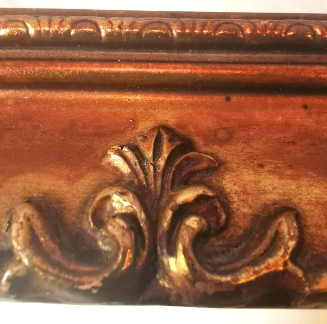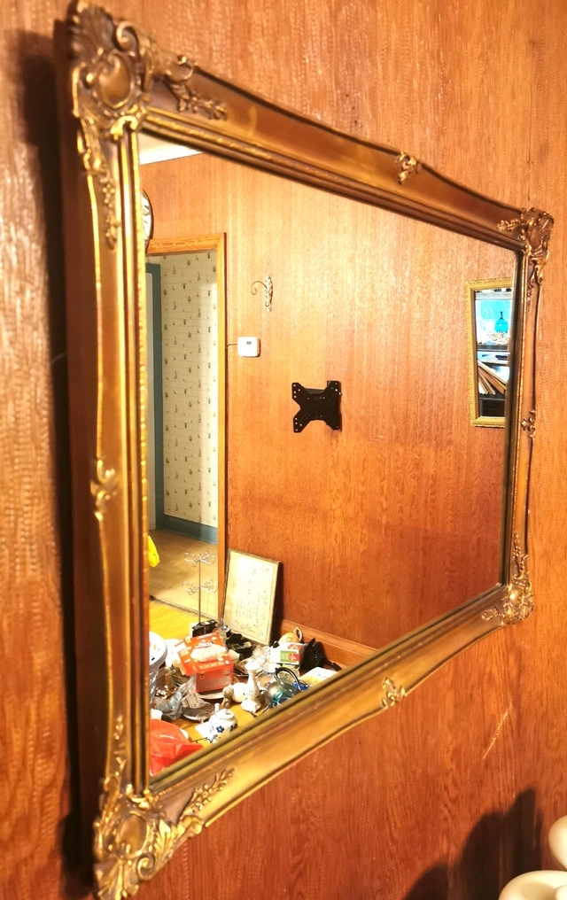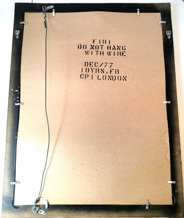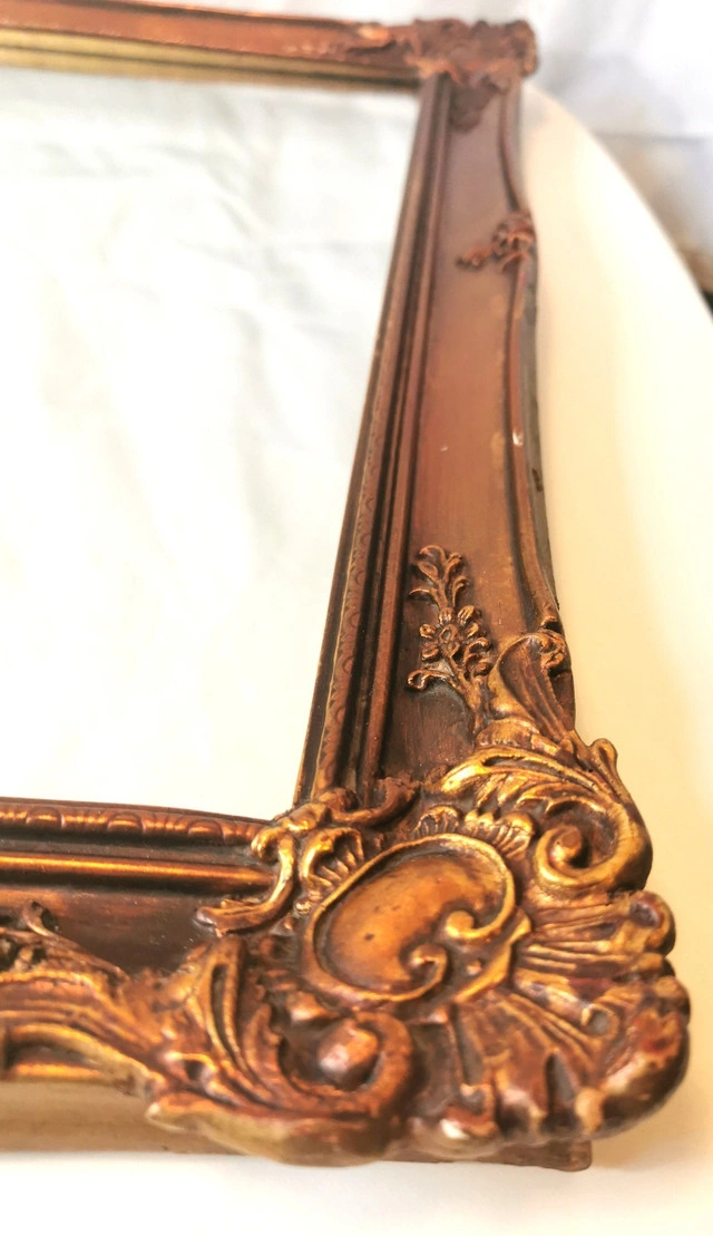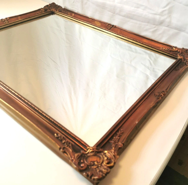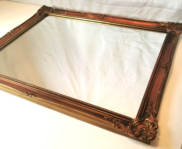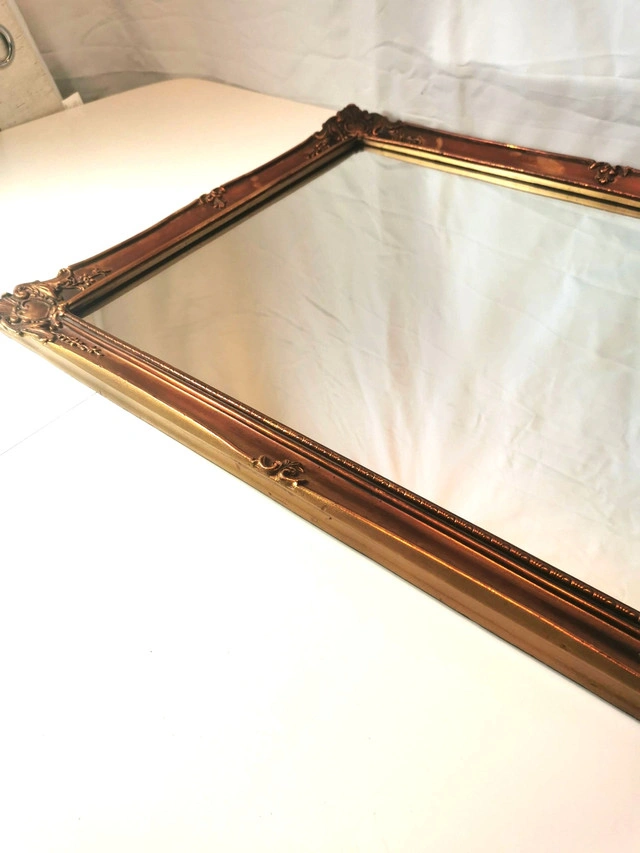 This vintage 1977 framed mirror, made in London by CPI London, features a unique bronze and gold tone guilded wood frame with a rectangular shape and a mirrored finish. The 21-inch length, 26.5-inch width, and 1-inch height make it suitable for any room in the house. The mirror, with a 1970s style and art theme, is a classic addition to any home décor. Its wall-mounted orientation adds a touch of elegance to any space, reflecting a piece of the late 20th-century era. NOTE: 48 year old vintage mirror light wear commensurate with age please reference detailed photos