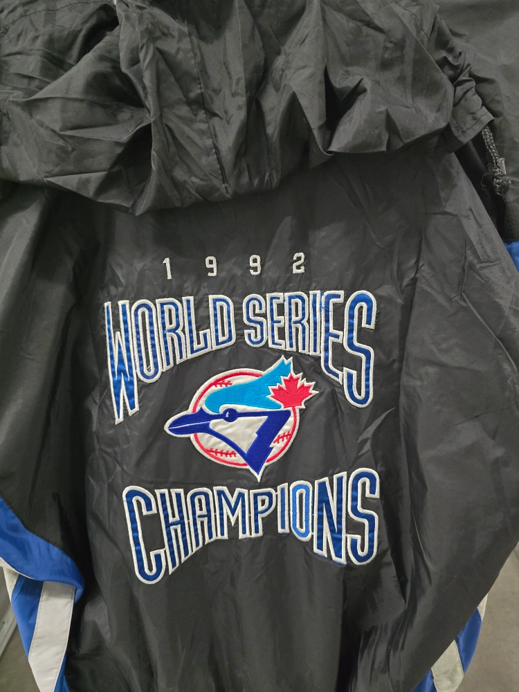 Selling a previously owned, 33 yr old Vintage Toronto Blue Jays Starter windbreaker jacket, size Large/Grande. It's a 1992 World Series Champions jacket. The material is 100% nylon with a polyurethane coating, offering protection against wind and light rain. This helps to retain body heat and prevent wind-chill. It's a perfect timing to wear this playoff season and show your support to our fabulous Blue Jays baseball team.. Blue Jays Go, Blue Jays Go!!!. Sells for C$415 + 57 delivery fee in eBay.ca