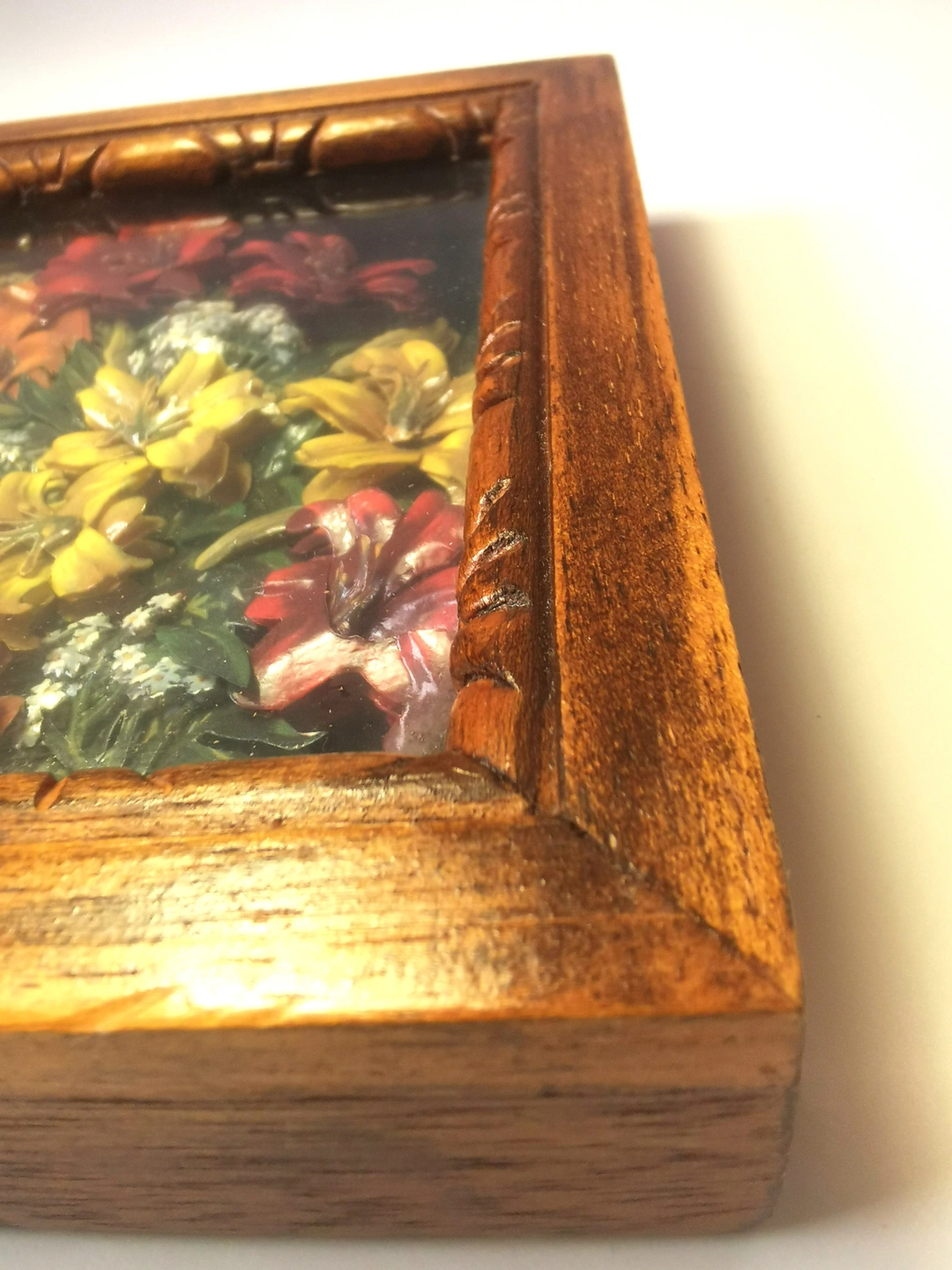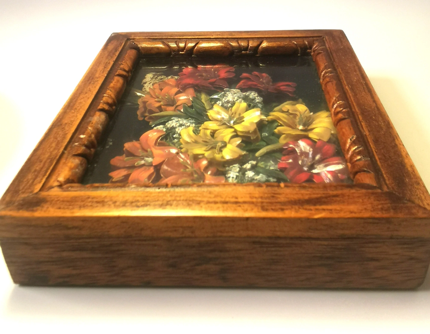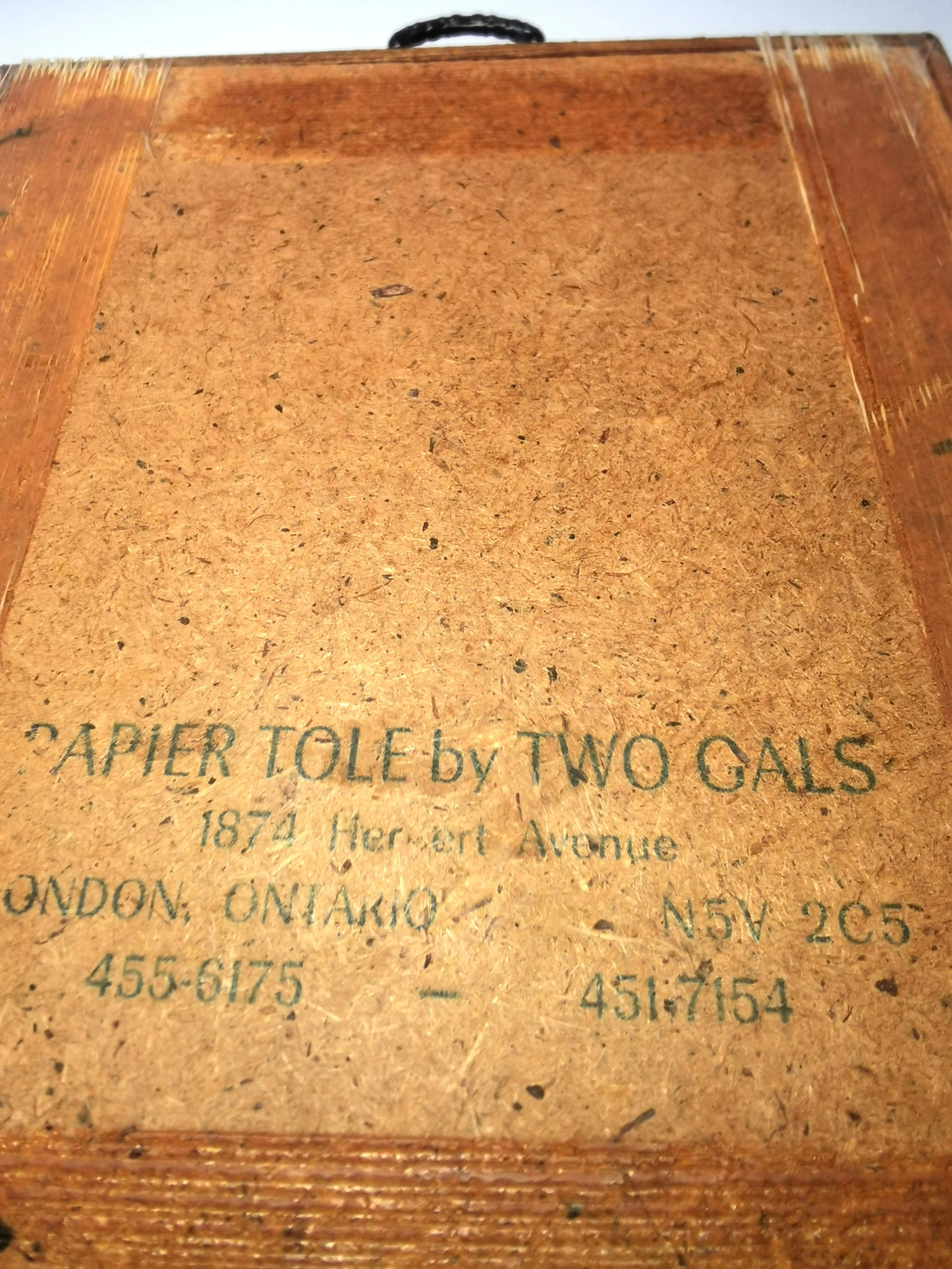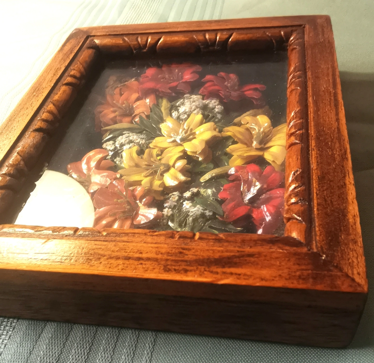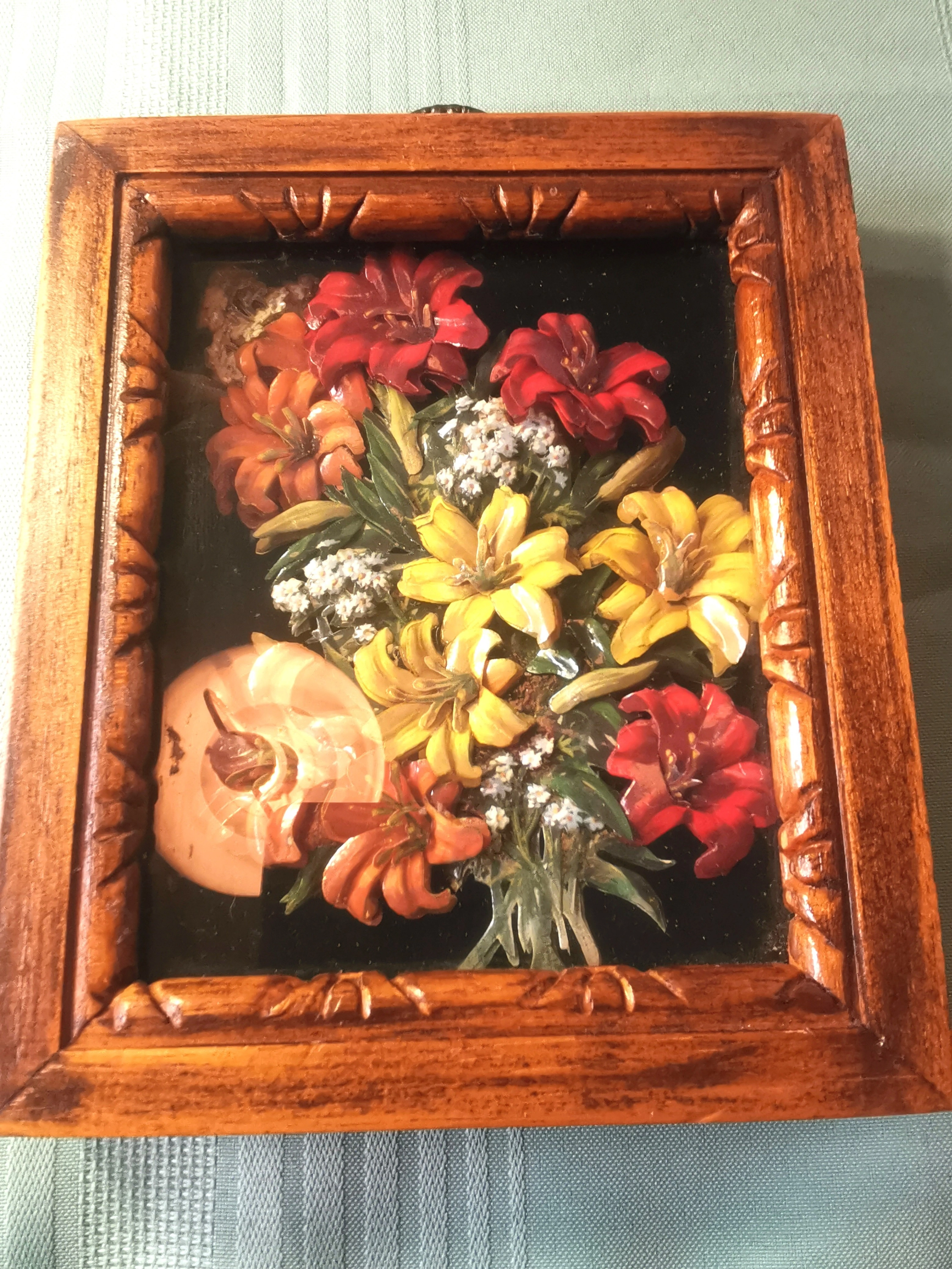 The Vintage 3D Decoupage Art Papier Tole Shadow Box by Two Gals London features intricate lilies flowers designed on wood in a multi-color palette. Made in Canada in the 1980s, this original piece showcases a unique and detailed art style that adds a touch of charm to any space. Perfect for collectors or those looking to add a vintage flair to their decor, this shadow box is a beautiful and timeless addition to any home. CONDITION: Good vintage condition light wear please reference detailed photos as part of description Dimensions: Length 6.25 inches, Width 5.25 inches, Height 1.25 inches