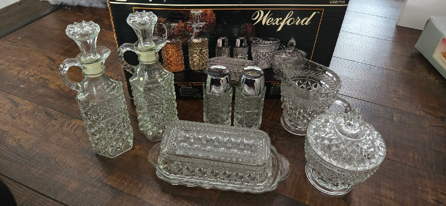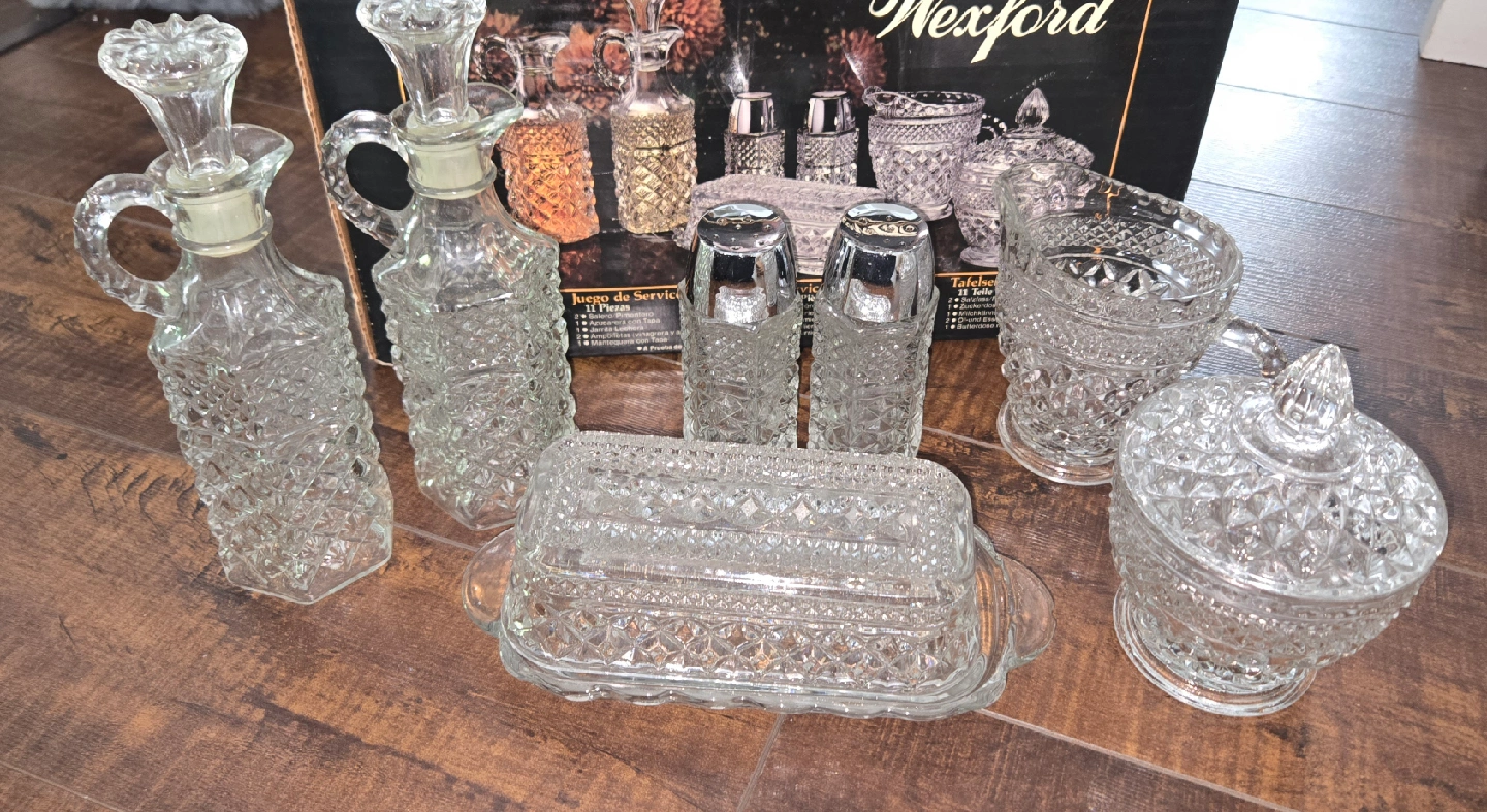 Selling a beautiful vintage Anchor Hocking Wexford 11-piece tableware set! This set includes everything you need to set a stunning table, perfect for special occasions or everyday elegance. The set includes oil and vinegar cruets, salt and pepper shakers, a butter dish, a sugar bowl, and a creamer. All pieces feature the classic Wexford pattern with its distinctive diamond cut glass design. The box is included!