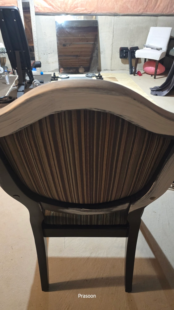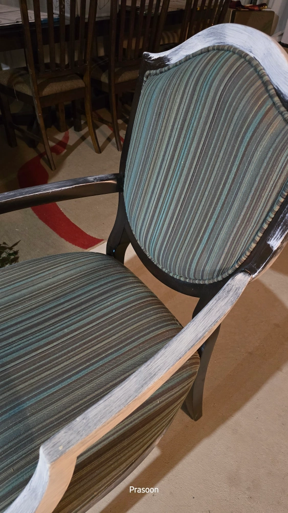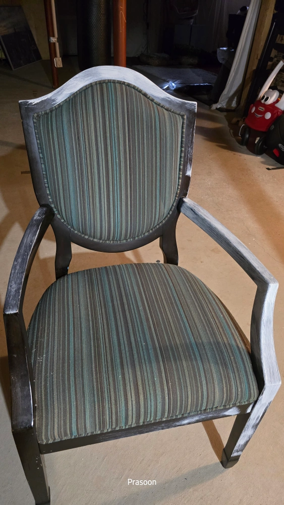 Selling a vintage armchair with a unique striped fabric design! The chair features a dark wood frame with a distressed white painted finish on the edges and arms. It's a sturdy and stylish piece that would add character to any room. Great for adding a touch of vintage charm to your home!