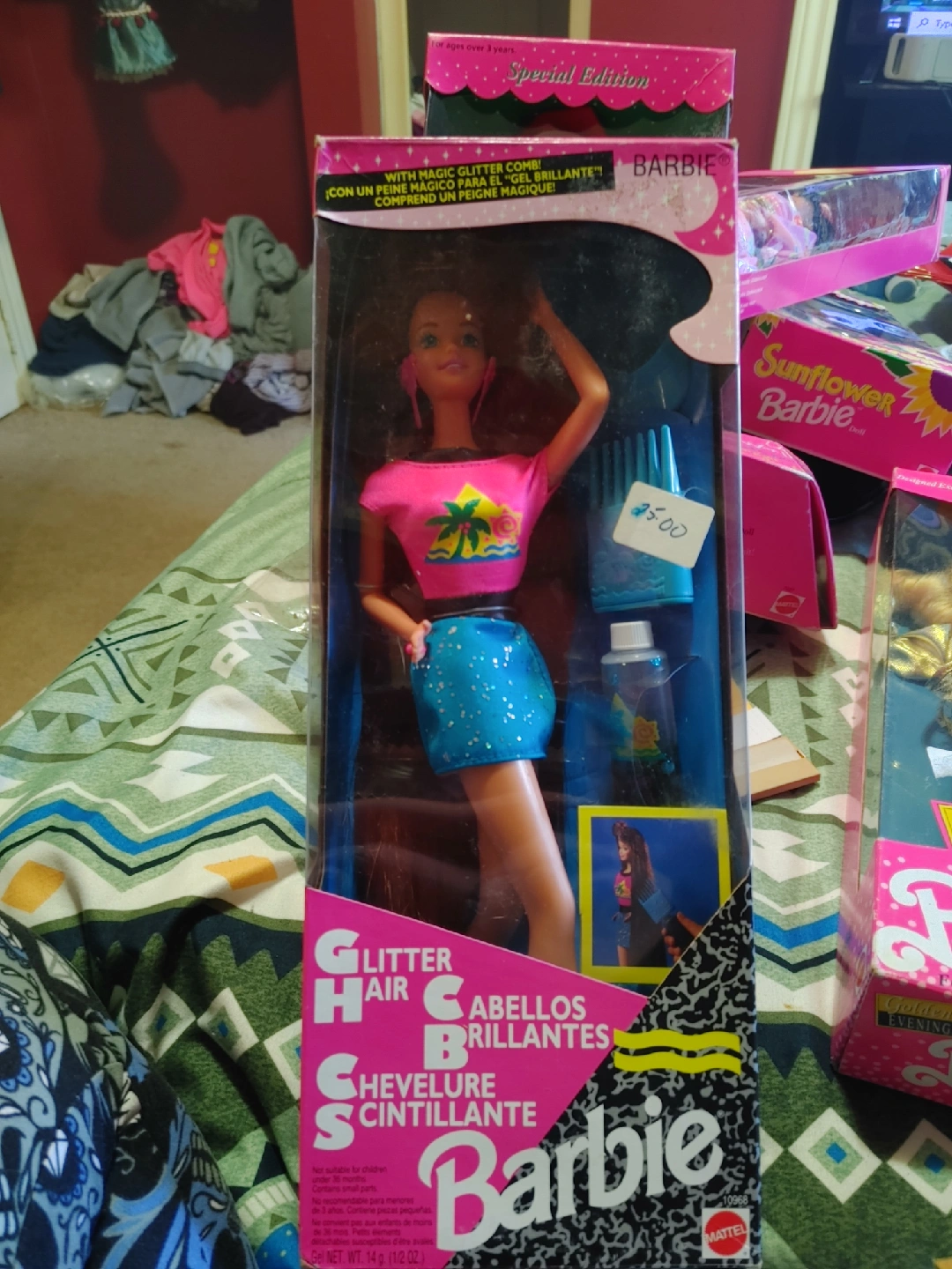 Selling a collection of vintage Barbie and Ken dolls in their original boxes! These include: - Sunflower Barbie (Special Edition) - My First Ken (Ballet partner of Barbie) - Glitter Hair Barbie - Golden Evening Barbie - Ice Capades Ken and more $25 each These dolls are from Mattel and are in good condition considering their age. Perfect for collectors or anyone who loves vintage toys!