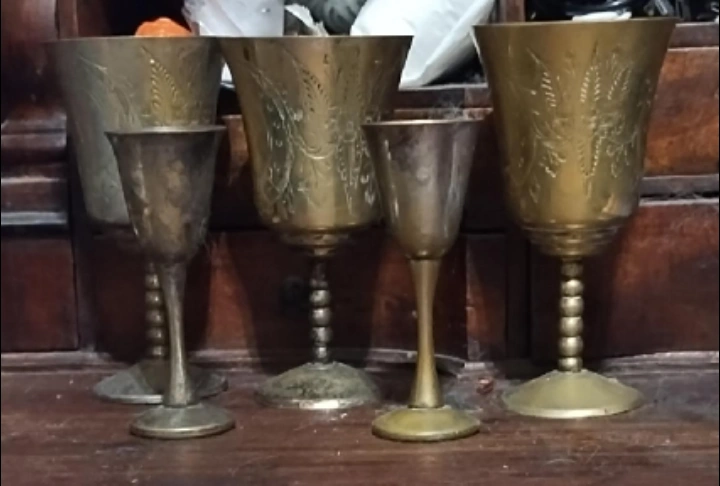 Selling a set of five vintage brass goblets. They have a lovely patina and etched design. Perfect for adding a touch of old-world charm to your home!
