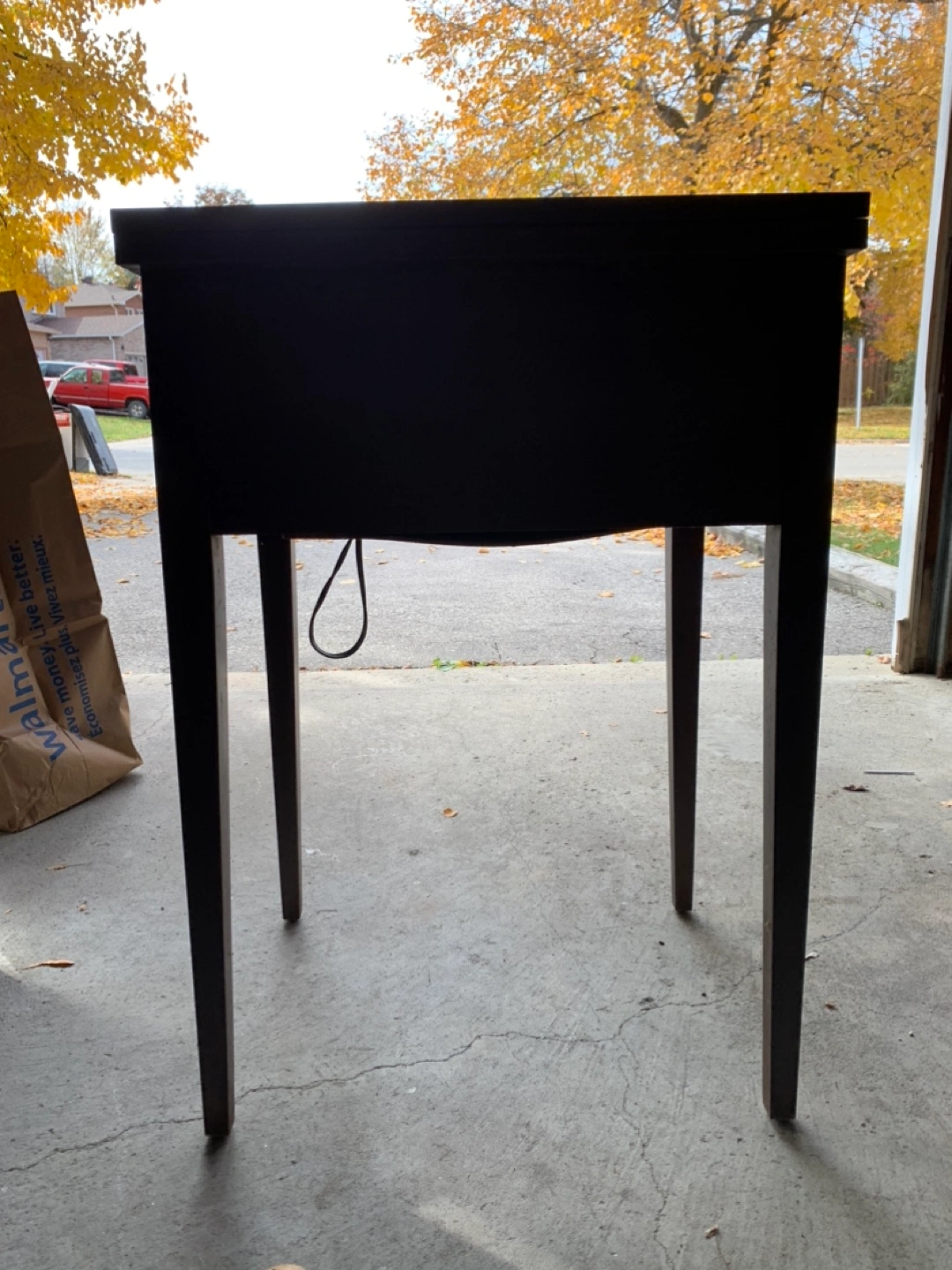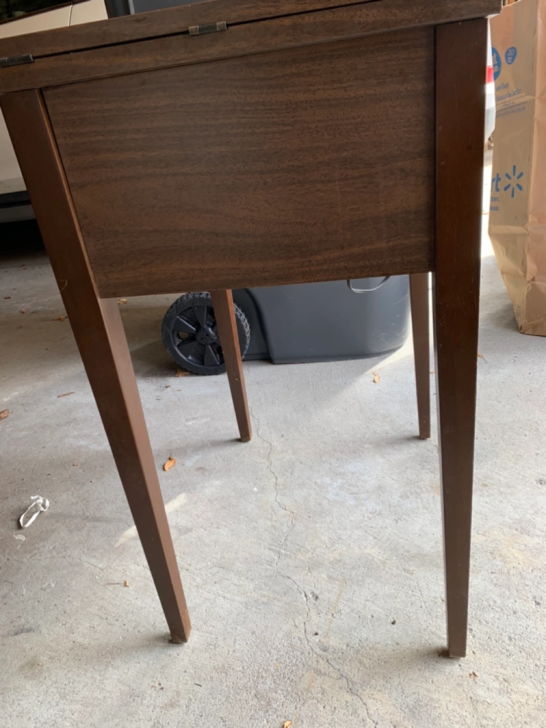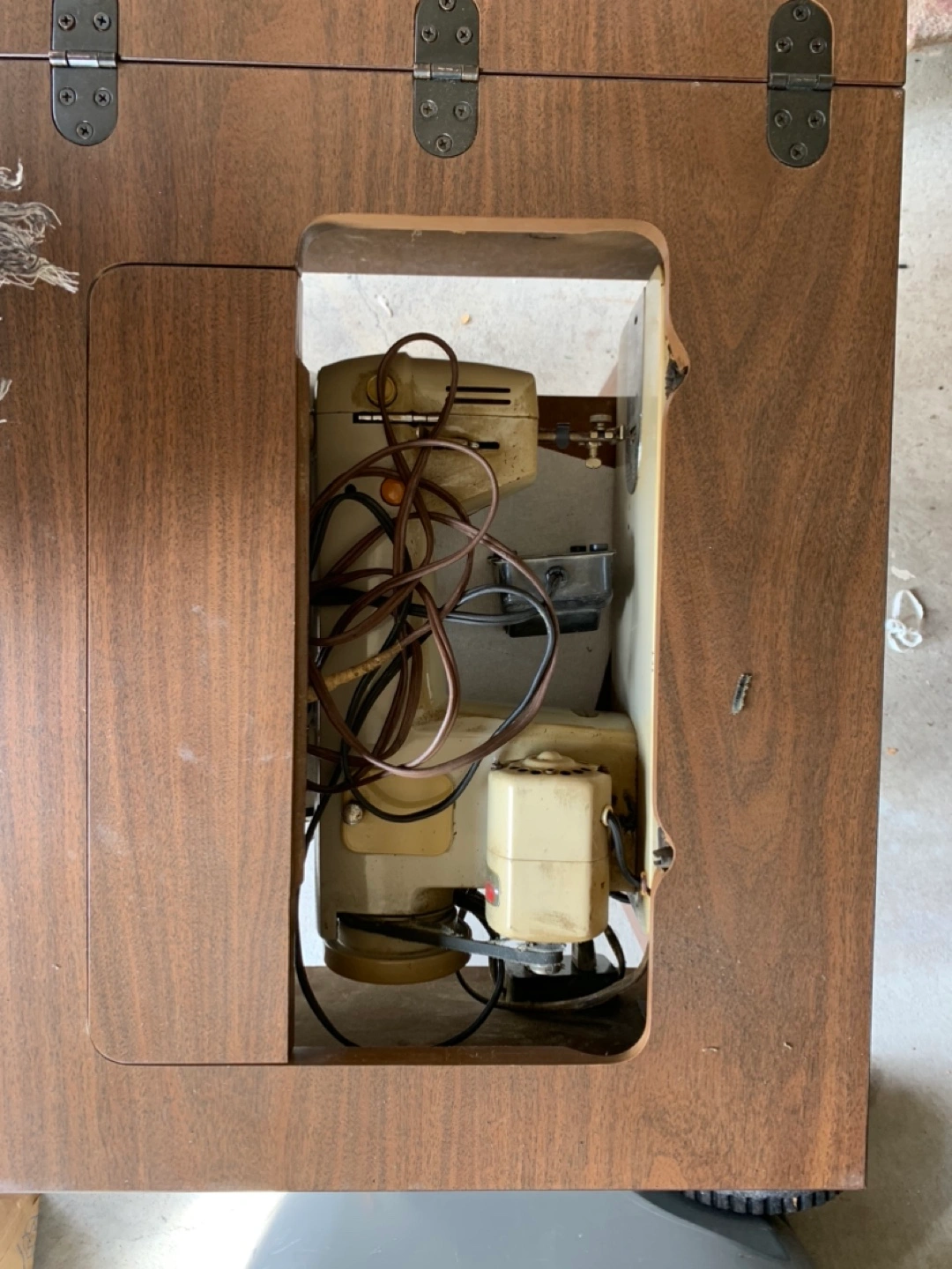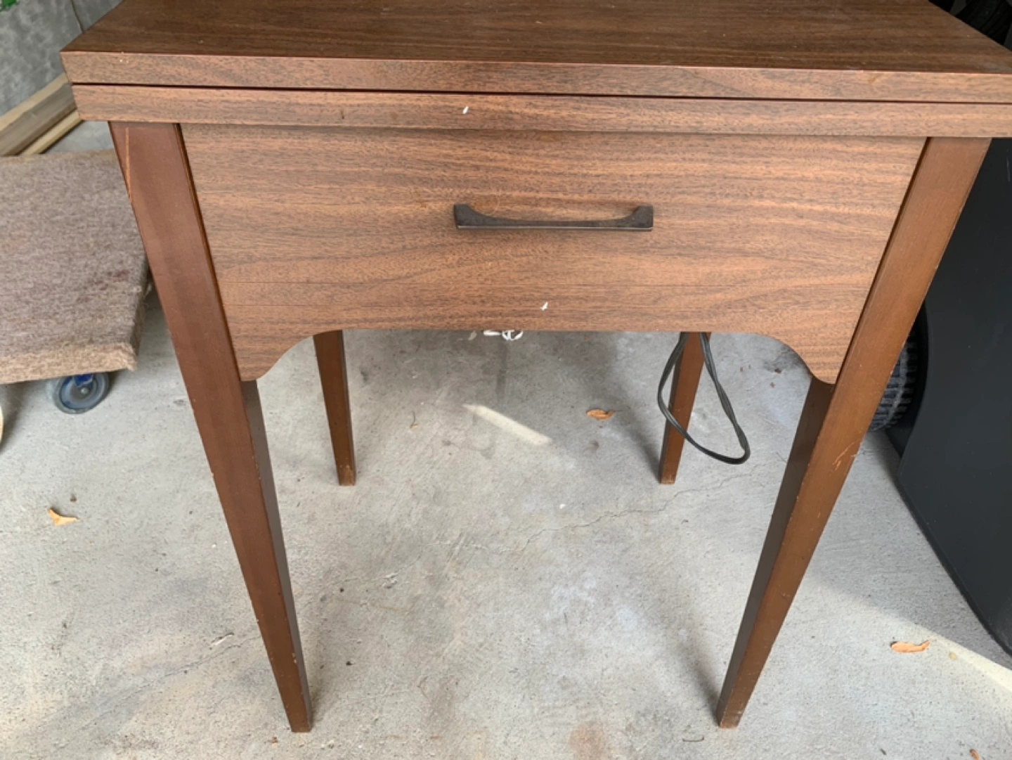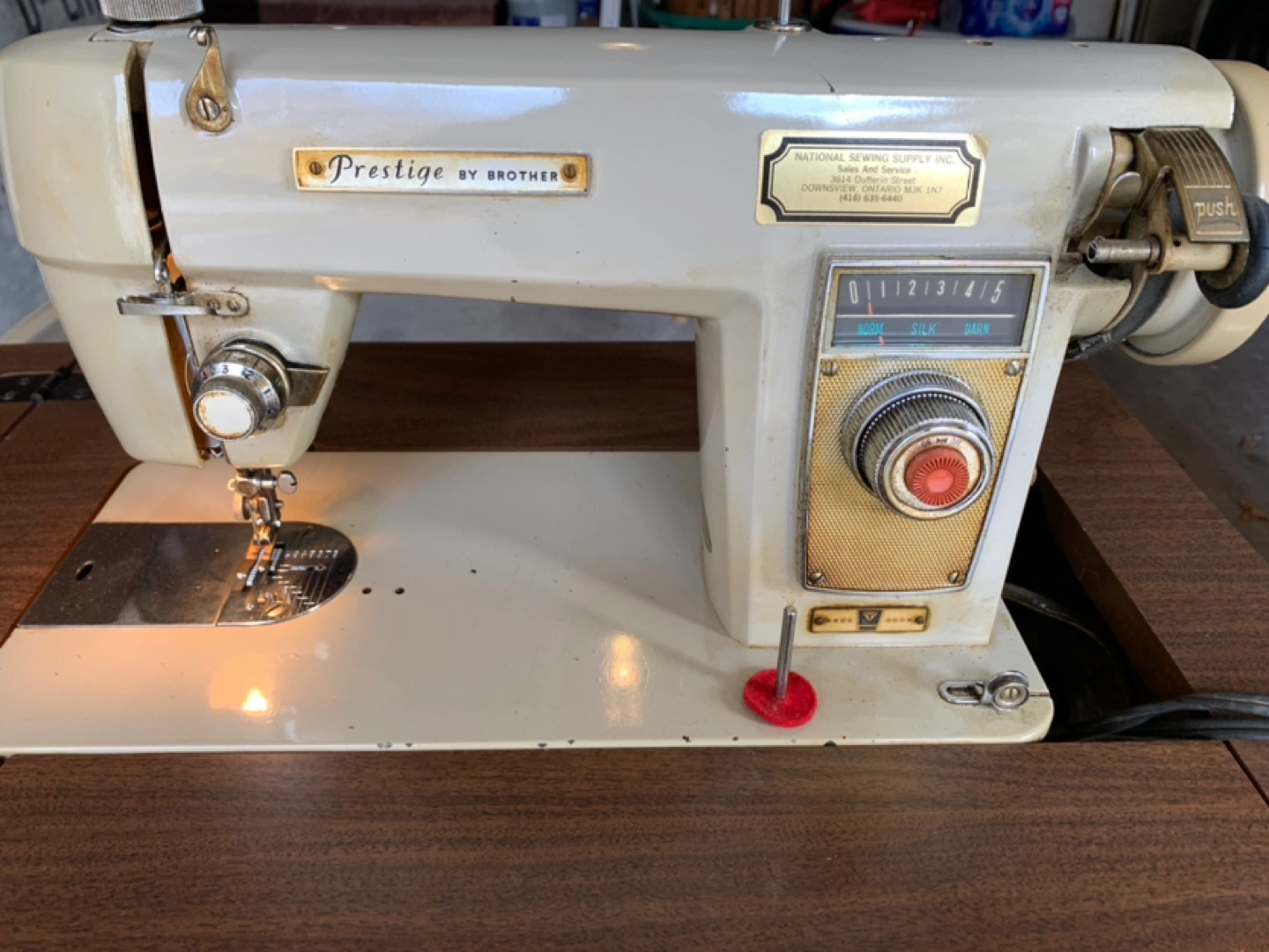 Vintage sewing machine with a foot pedal. Includes a table and a needle and in working condition.. have video if wanted .. great to still use or collectable item..