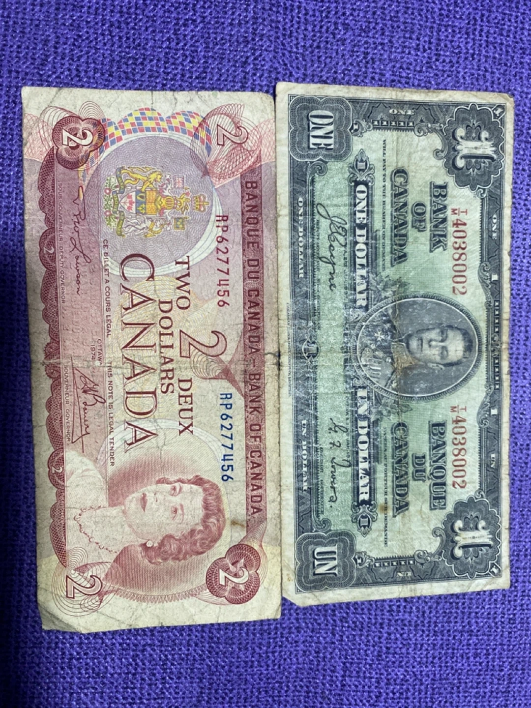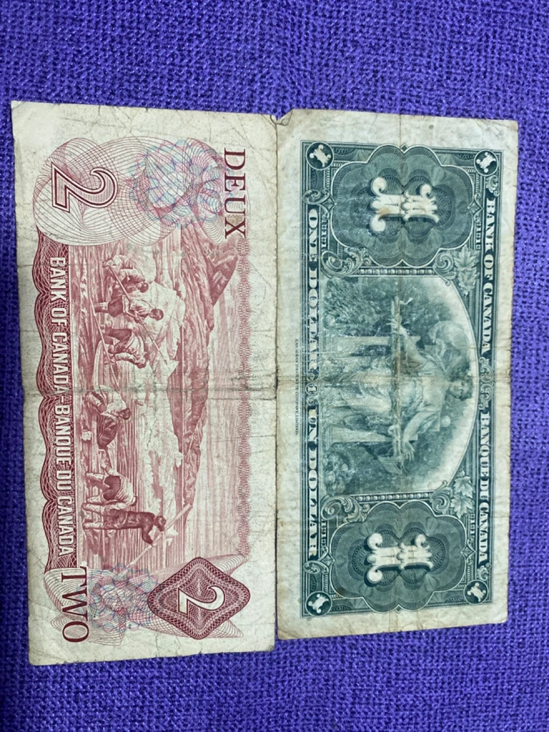 Selling a couple of vintage Canadian bills! One is a $1 bill and the other is a $2 bill. Both have some wear, but are still in decent condition for their age. Great for collectors!