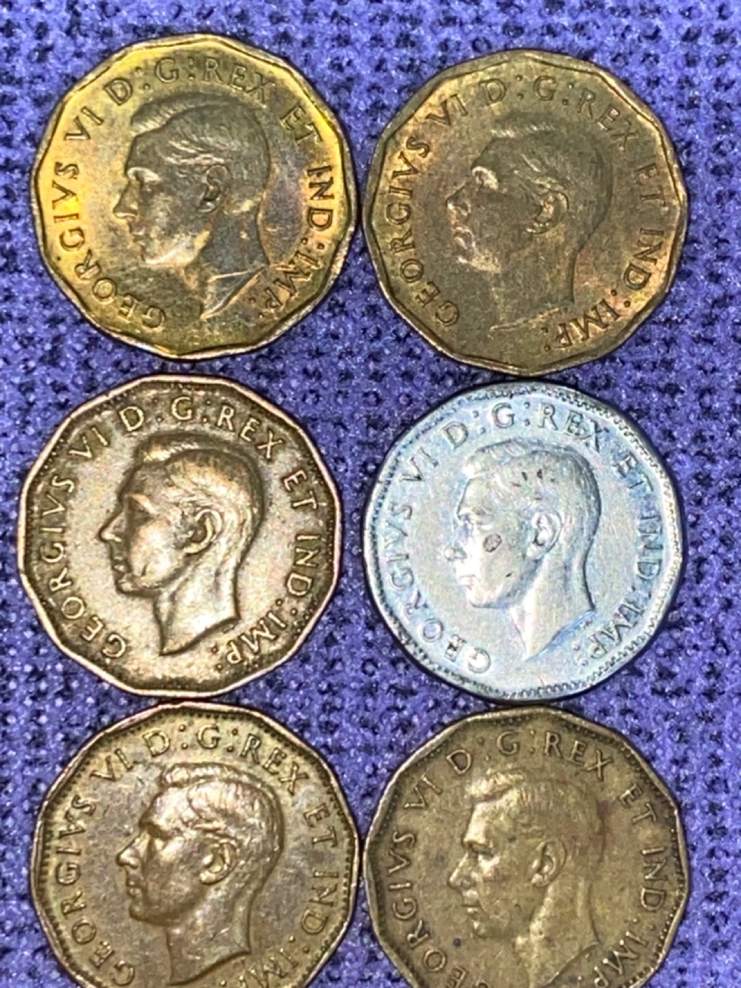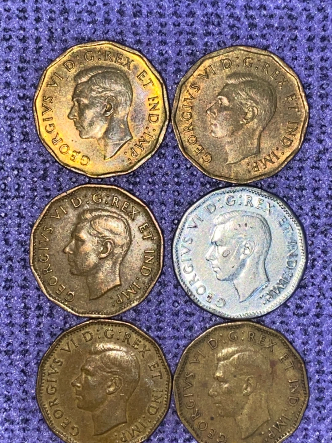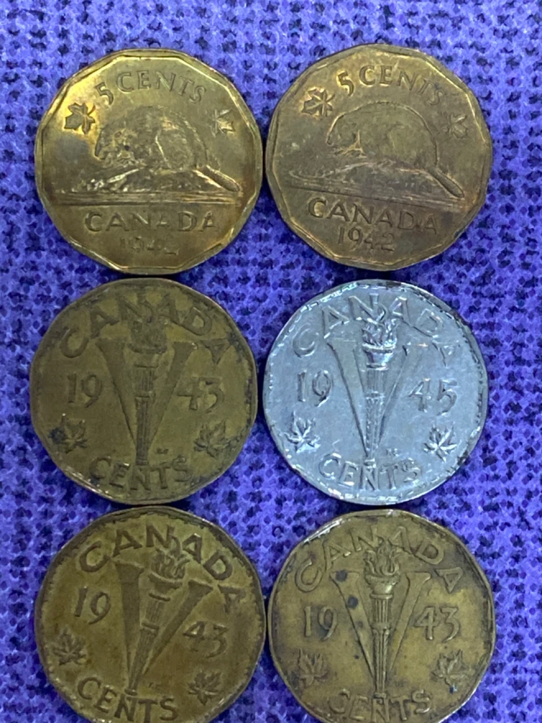 Selling a collection of vintage Canadian five-cent coins. These coins feature iconic designs from 1942, 1943, and 1945. A great addition to any coin collection or a unique piece of Canadian history!